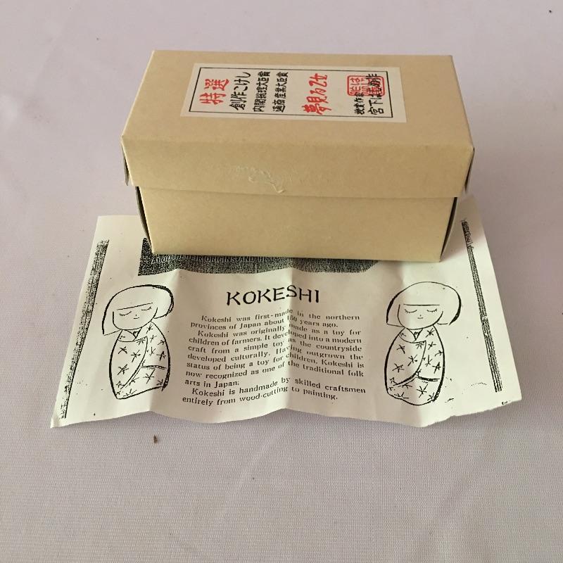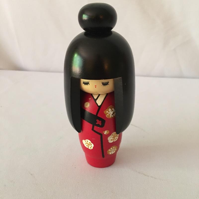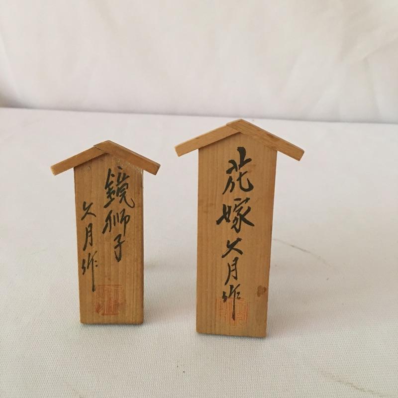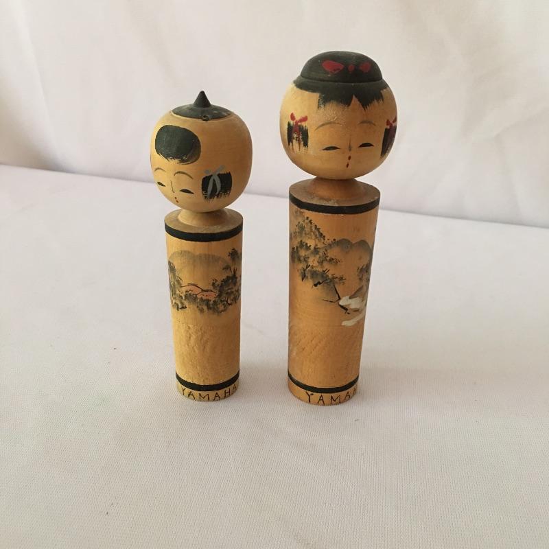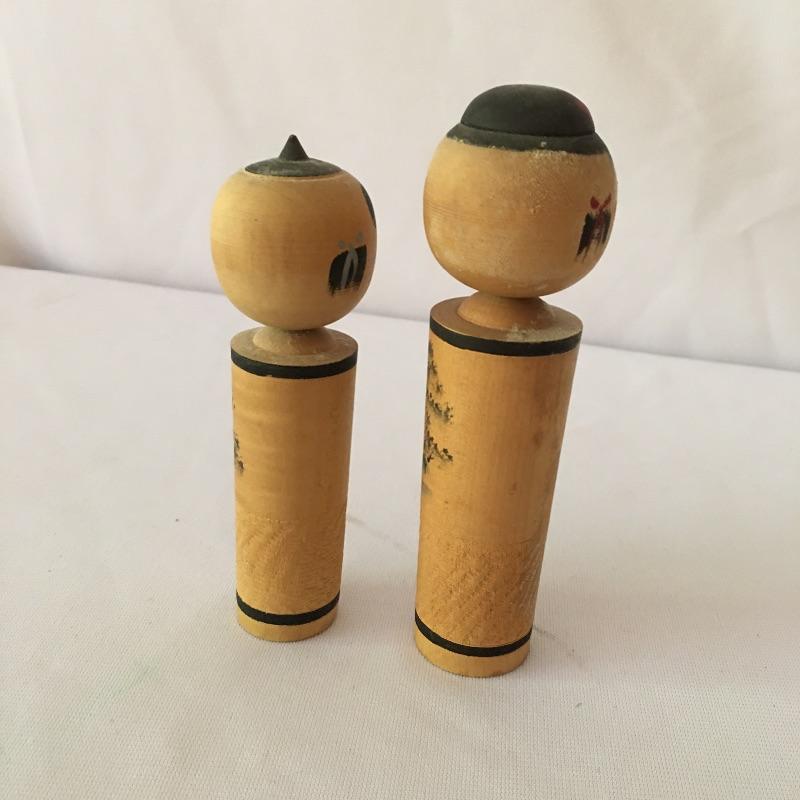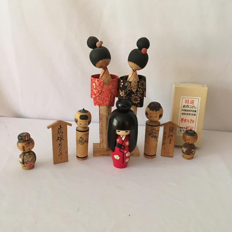 Kokeshi dolls. Lot includes seven dolls in a variety of sizes and two small pieces with Japanese writing on them.