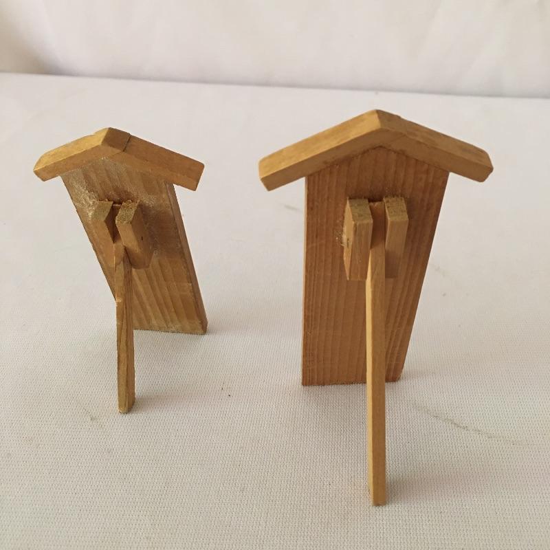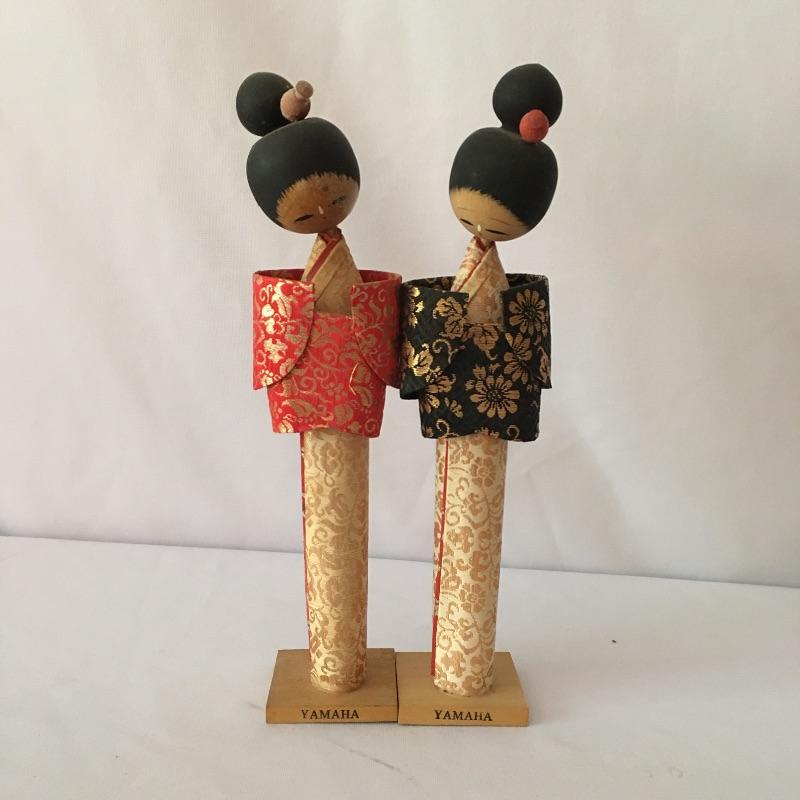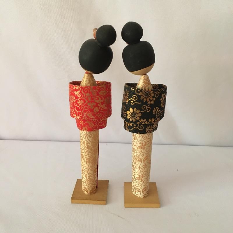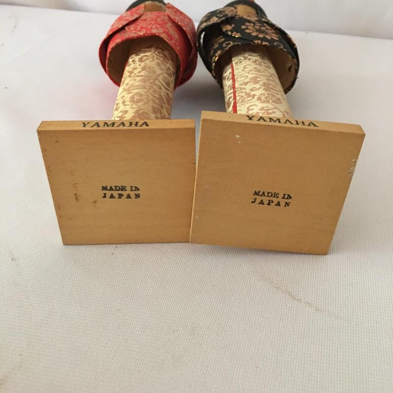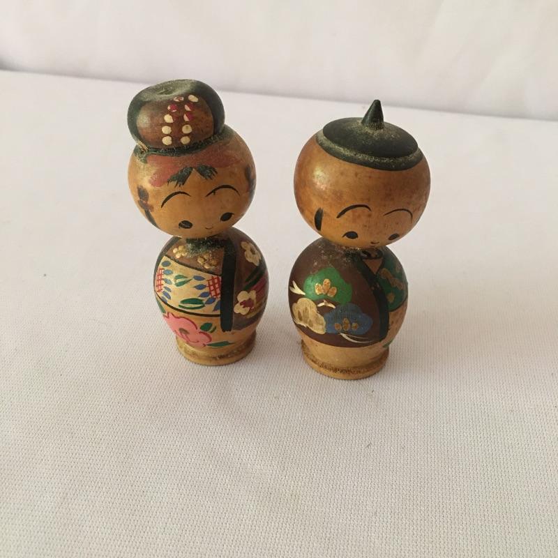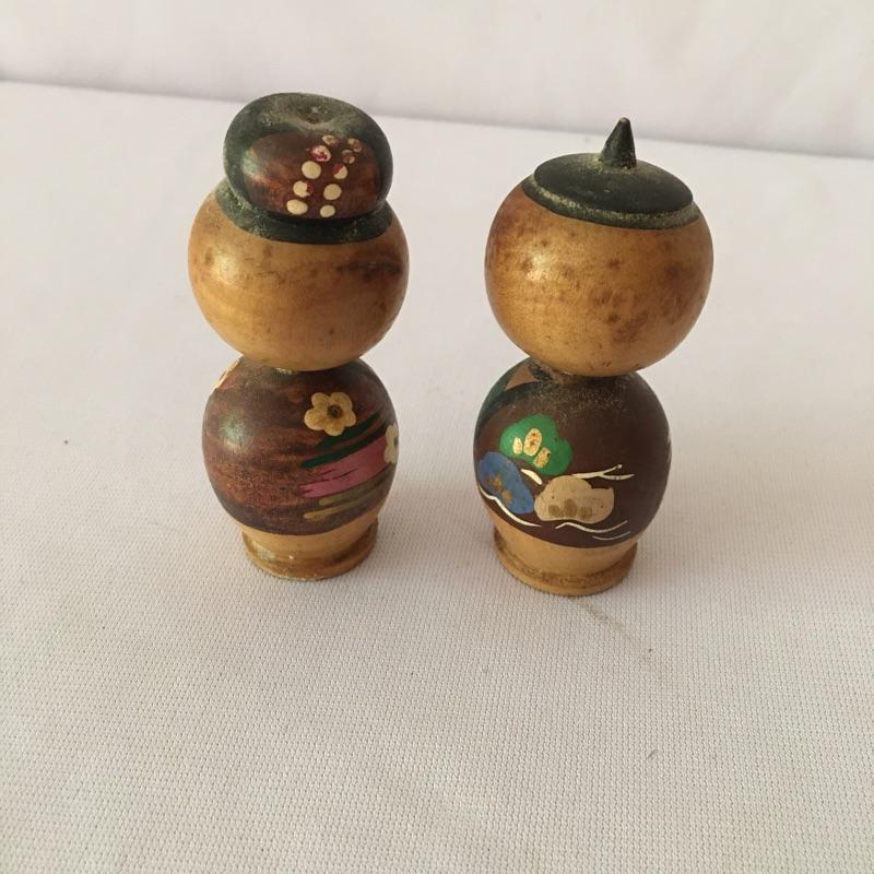 Kokeshi dolls. Lot includes seven dolls in a variety of sizes and two small pieces with Japanese writing on them.