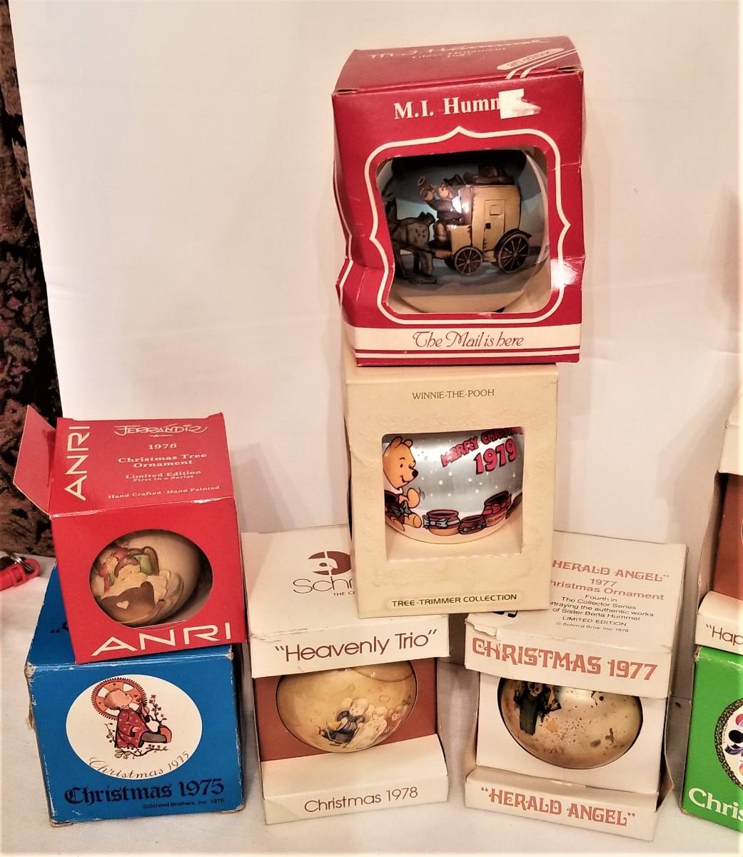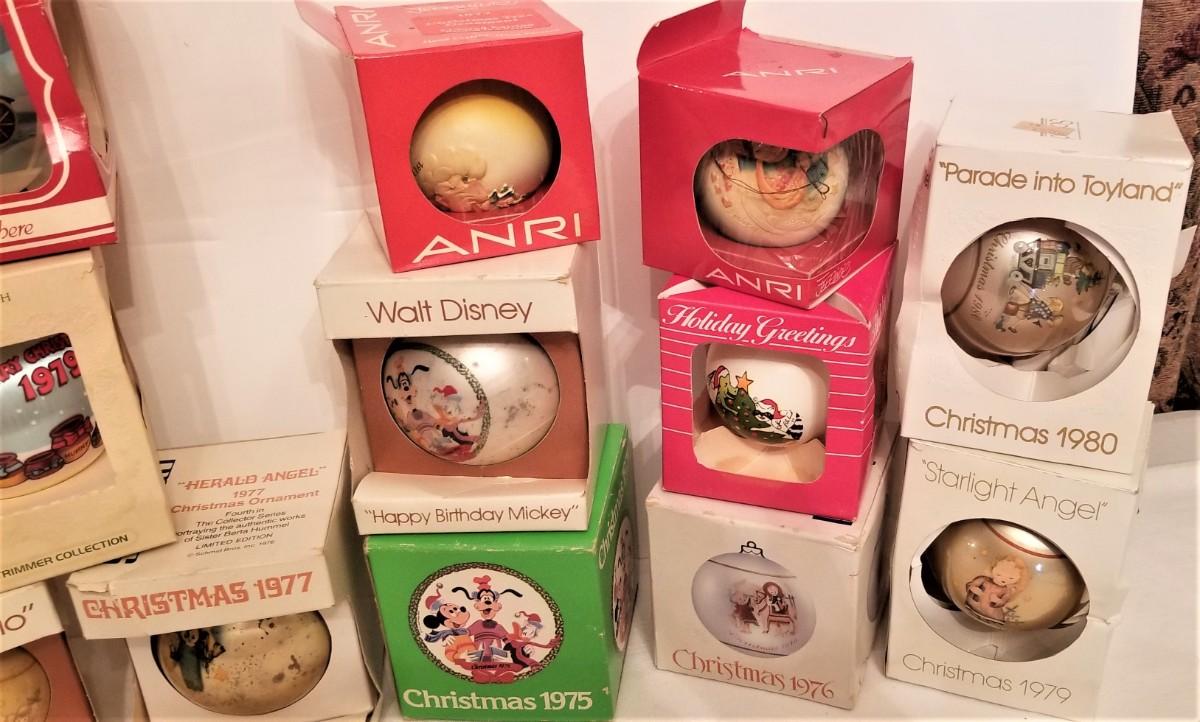 You get all you see here - attic find, so some boxes are a bit "smushed" - ornaments all in good vintage condition. Ball ornaments by Shmid, ANRI, Disney, Hummel, etc. You get 14 in all.