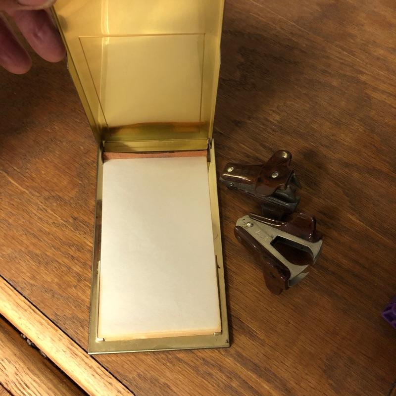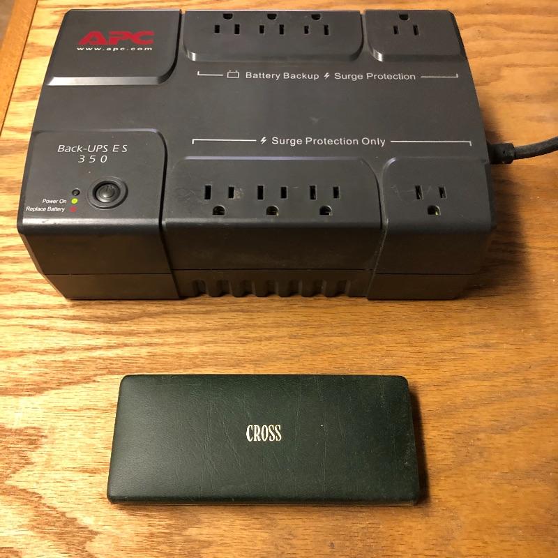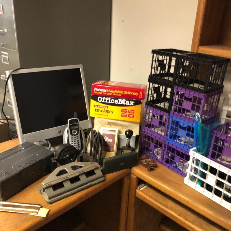 This handy lot includes lots of useful items for the office. The Cross pencil and pen set comes with original box. Also included is an HP monitor, stackable storage boxes, hole punch, stamp and much more. One of the two APC Back Ups does not have a battery, this would have to be purchased separately, the second one does. The monitor is a 17”.