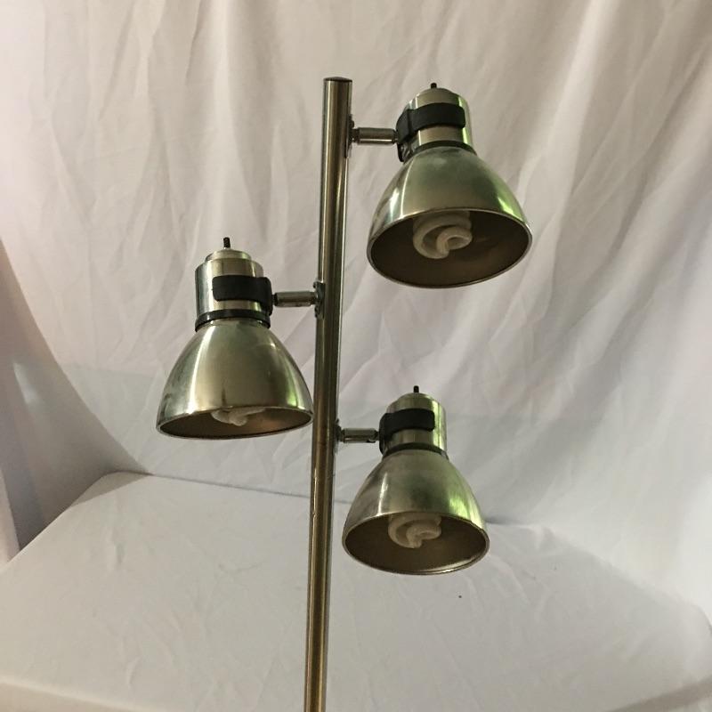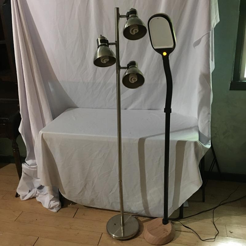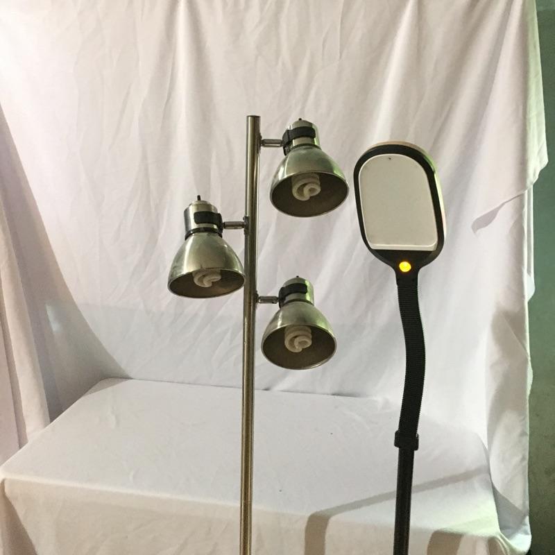 Pair of floor lamps includes metal floor lamp with three bulbs and metal floor lamp with a fluorescent bulb, wood grain plastic top and an adjustable arm. Brighten up your room with this pair of floor lamps. Tallest lamp measures 64” tall.