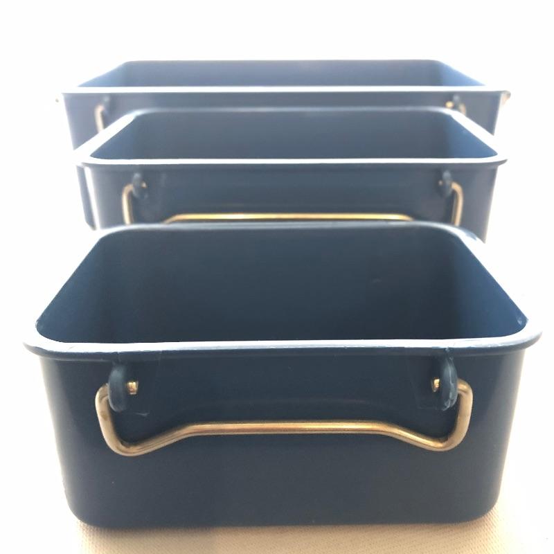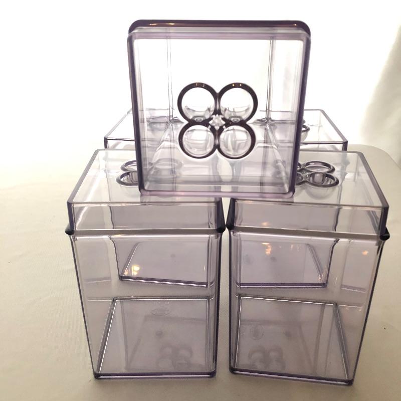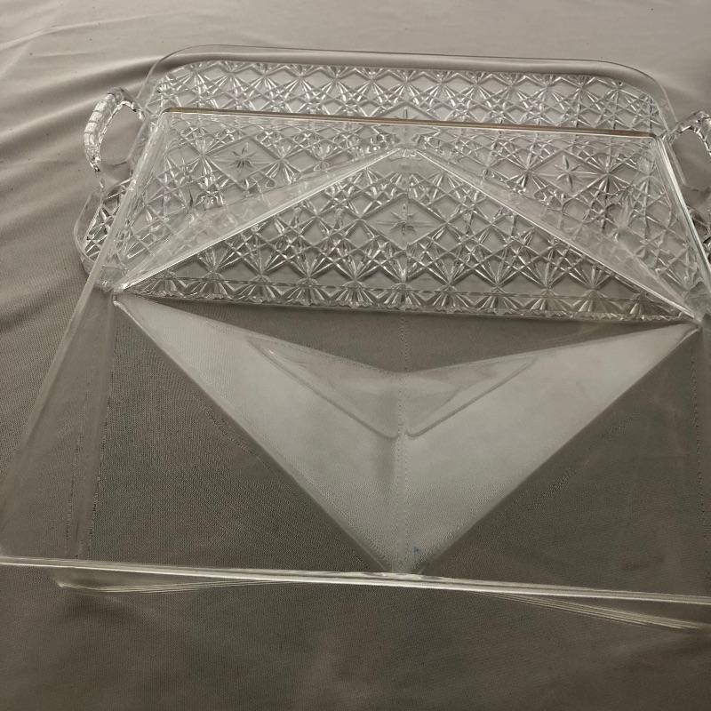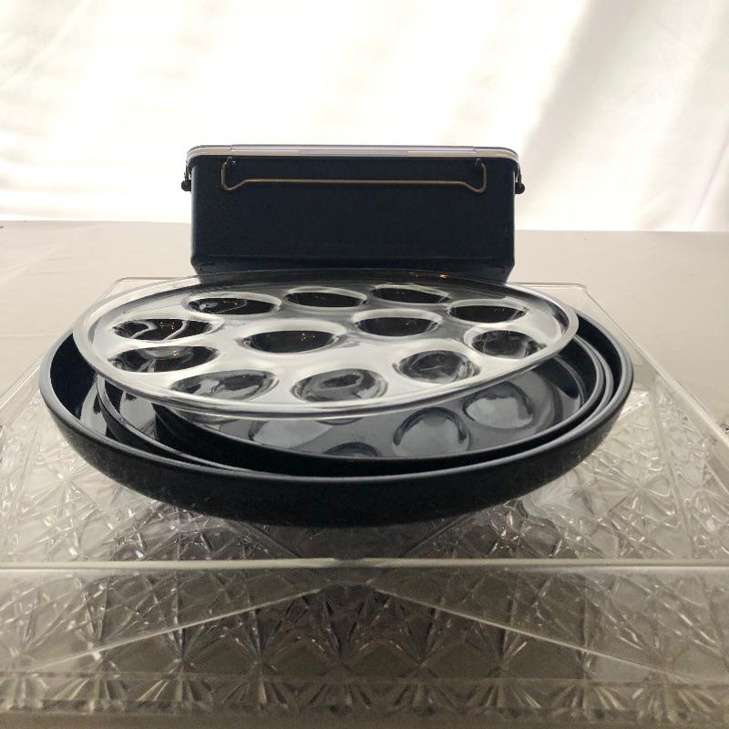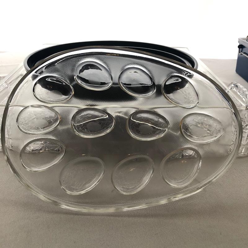 Got storage? You do now! Rectangular cases with lids, deviled egg tray deep V appetizer tray and serving tray with handles for breakfast in bed occasions. Set of five canisters with lids perfect for your dry goods. Three blue nesting trays and a metal plate stand that stands 24” tall. Serving tray with handles measures 18” x 13”. Everything is plastic but stylish except for the metal plate stand. It’s stylish but not plastic. Local pickup only.
