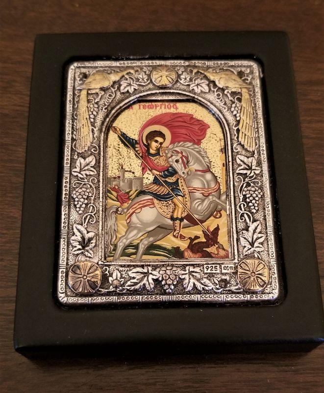 In the Eastern Orthodox style, religious icon depicting St. George and the Dragon - marked 925 (sterling). Measures 3" x 3.5". Good condition