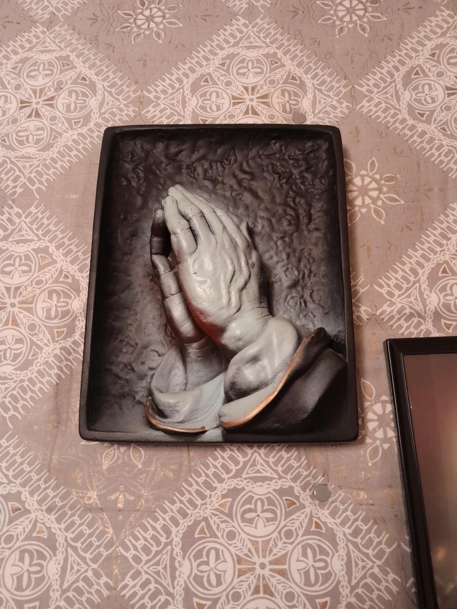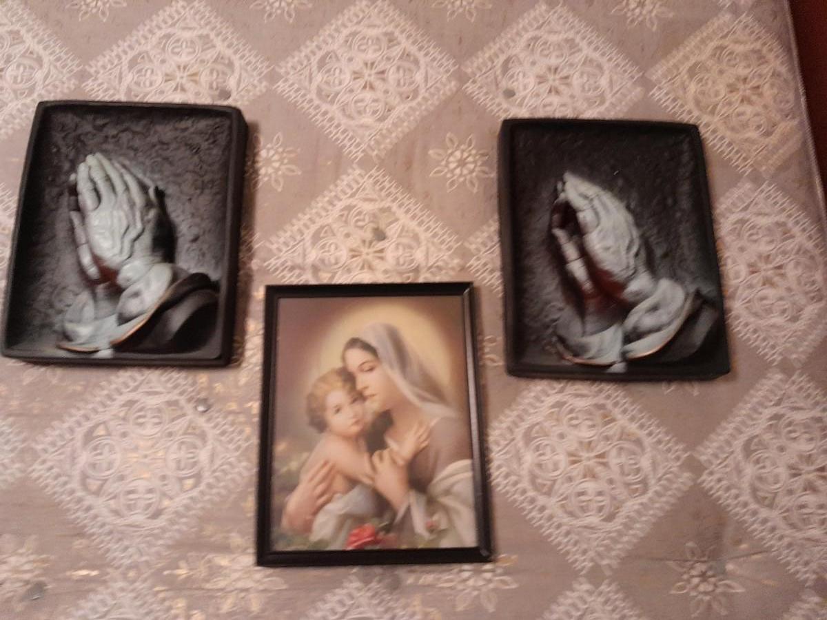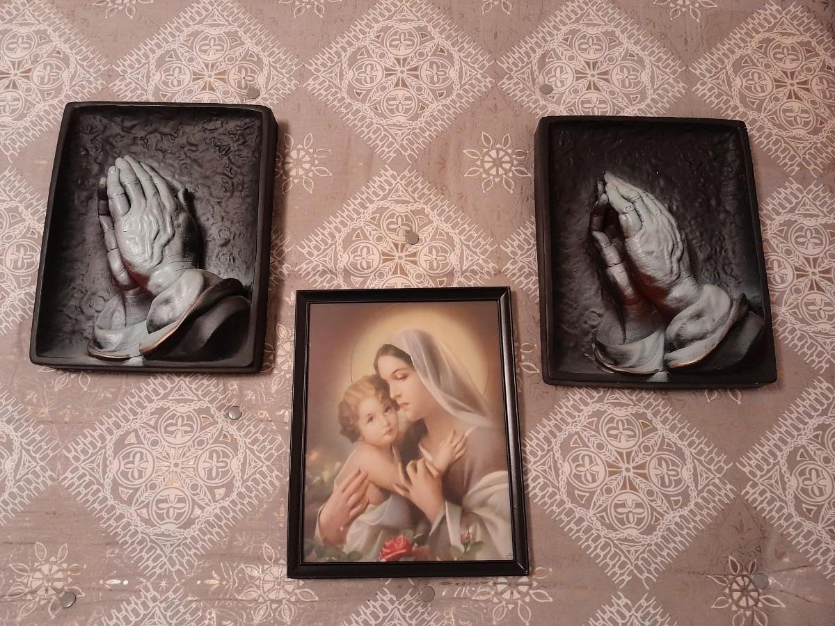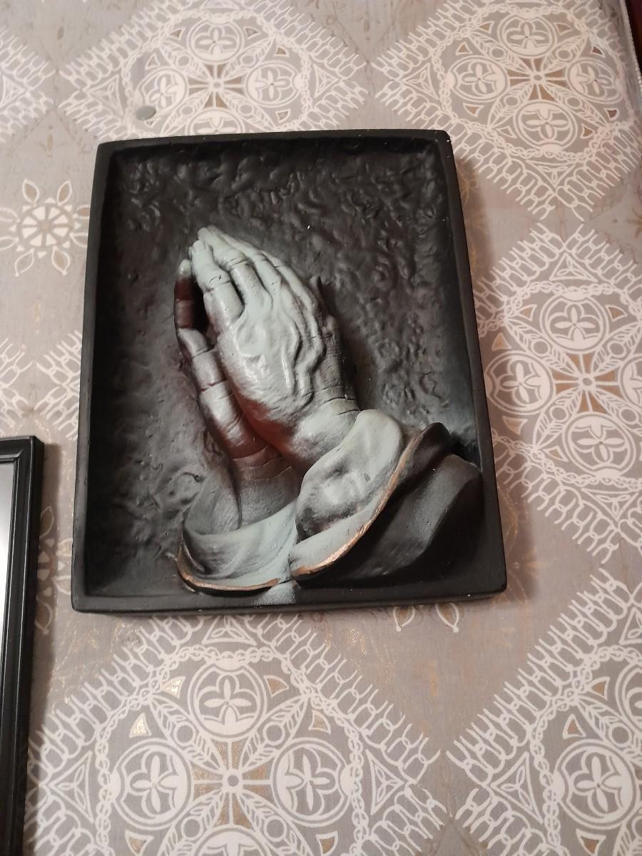 RELIGIOUS WALL HANGINGS TWO PRAYING HANDS CHALKWARE AND FRAMED ART