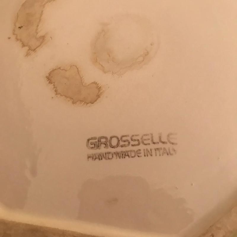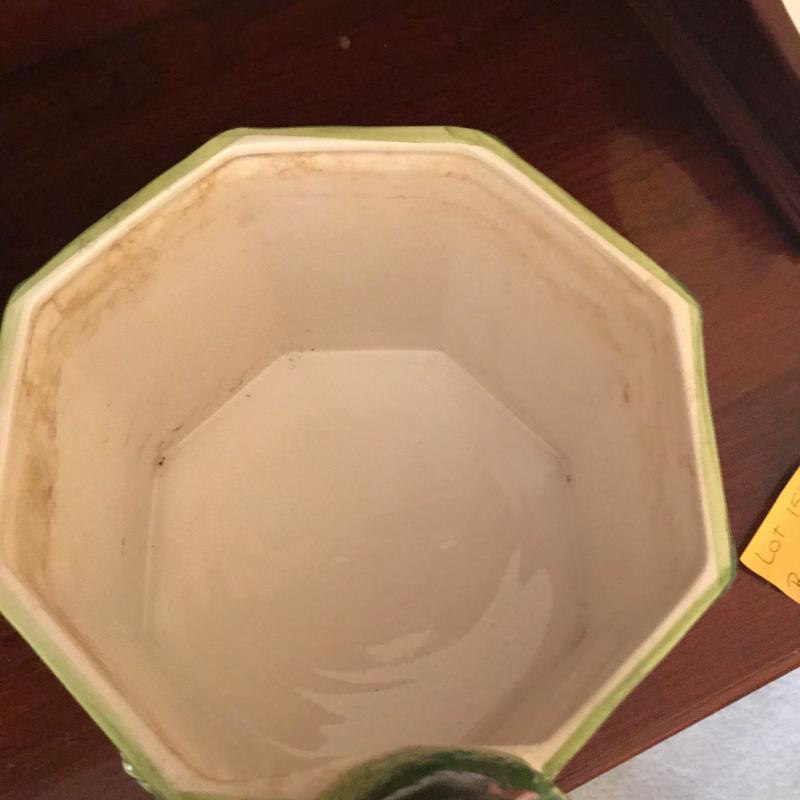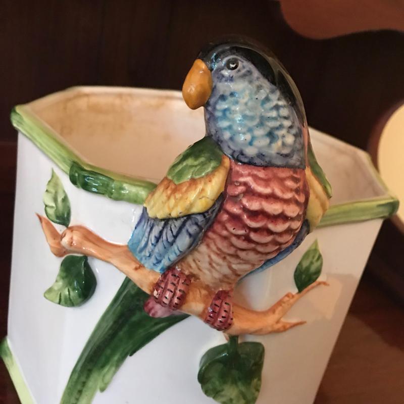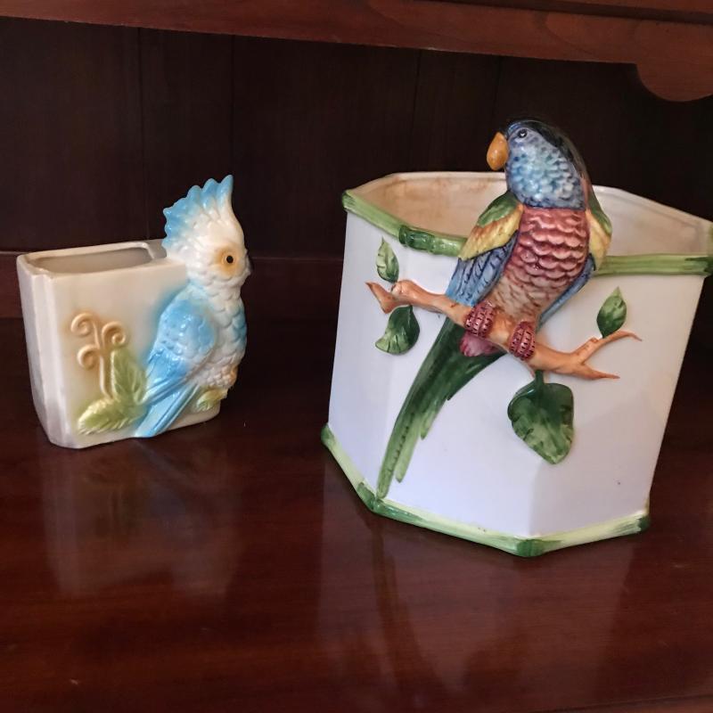 Two planters with bird detail. Smaller one is stamped Roseville and measures 5” x 2.5” x 7” h. Larger octagonal shape measures 8.5”d by 10”h and is stamped Grosselle Made in Italy. Shipping or local pick up.