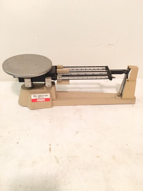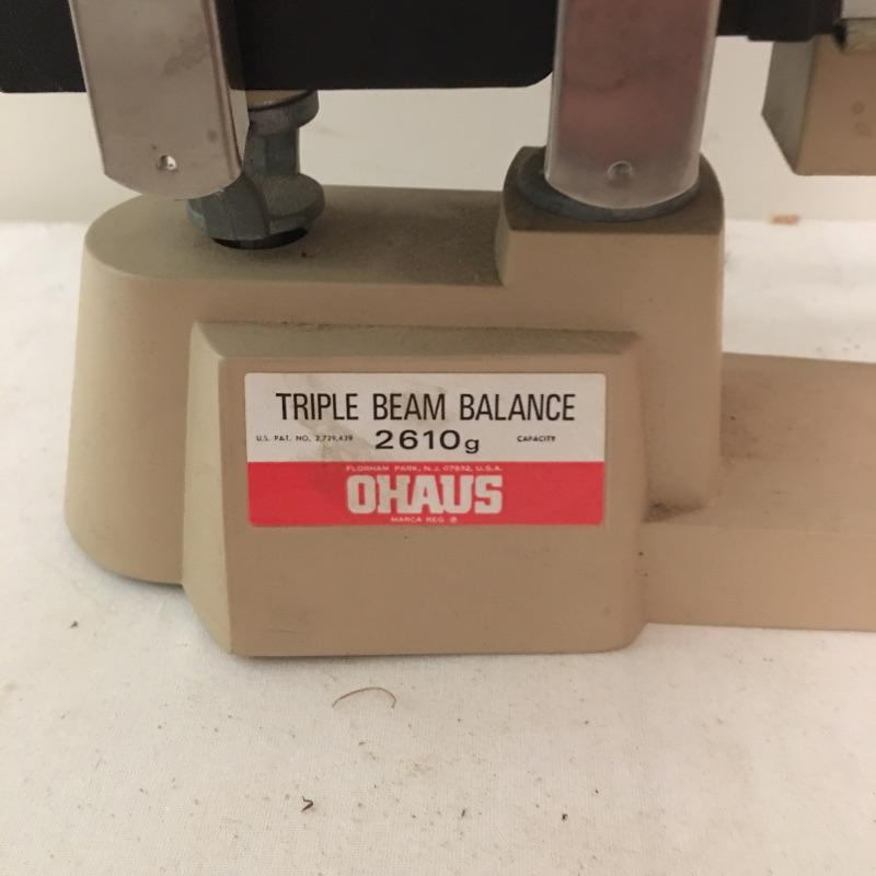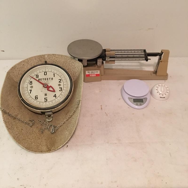 Ohaus triple beam scale, Detecto hanging scale, small battery powered scale was not tested as it has no batteries.