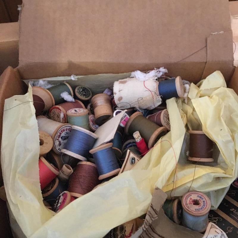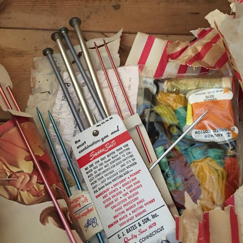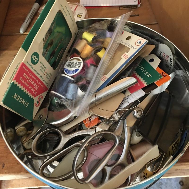Sewing and knitting lot includes oodles of thread, snaps, hooks, knitting needles, yarn, scissors, and more.