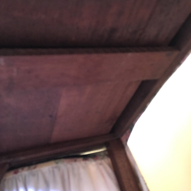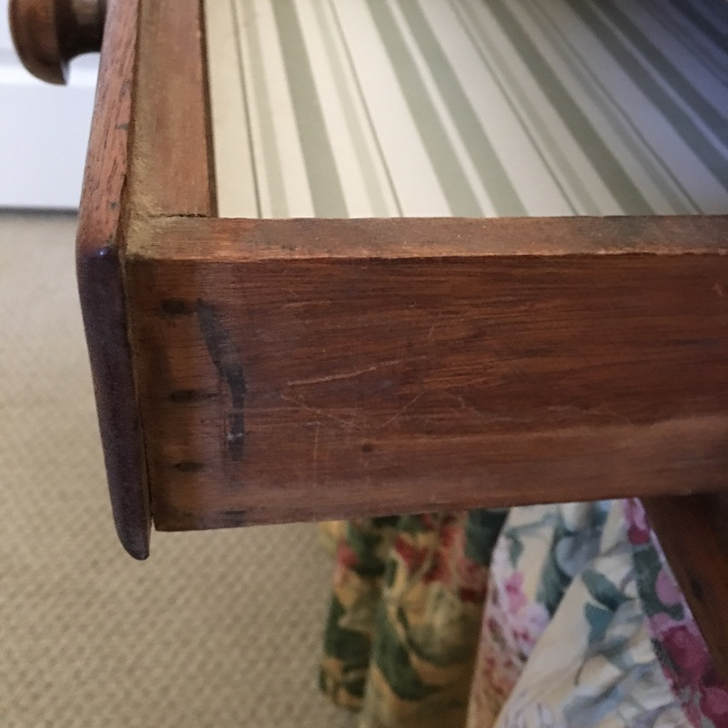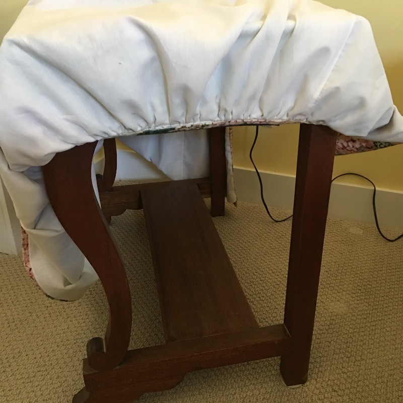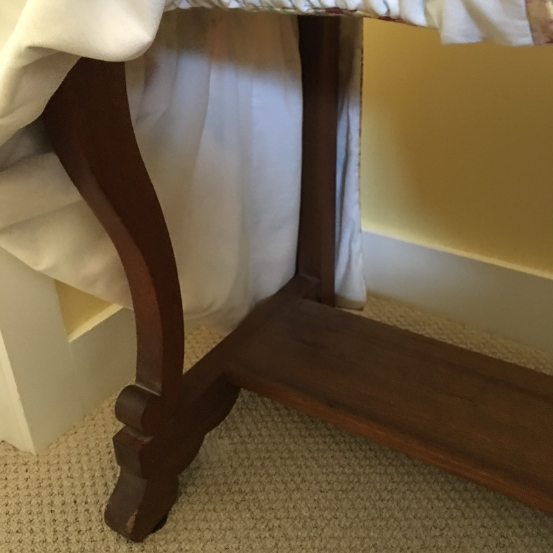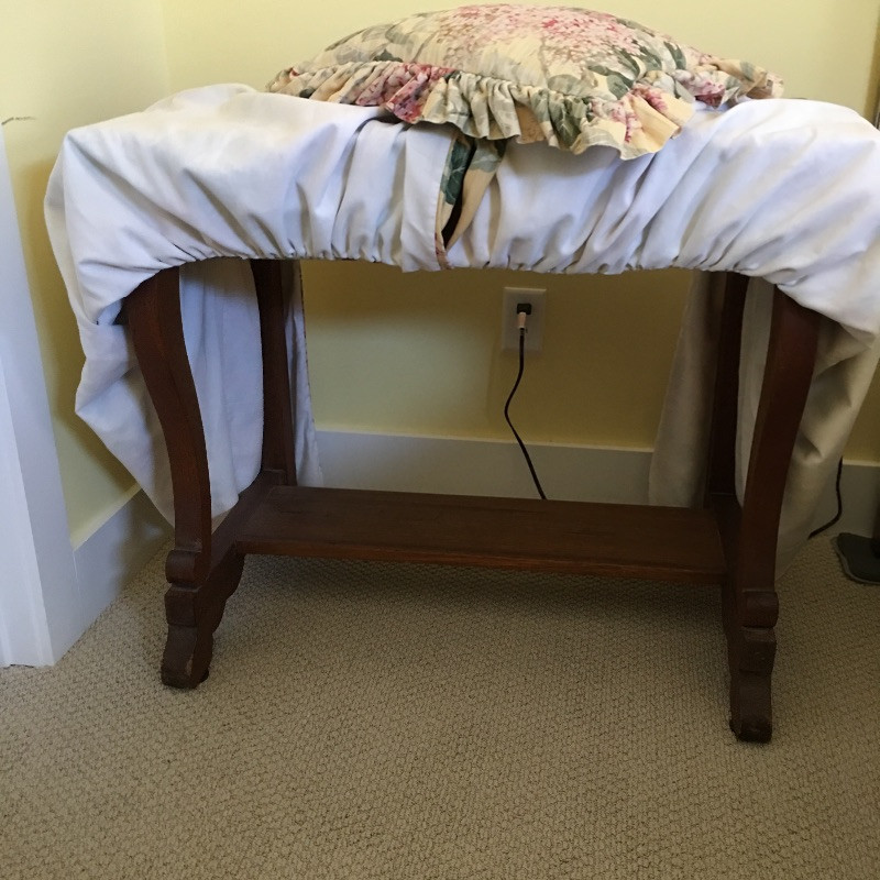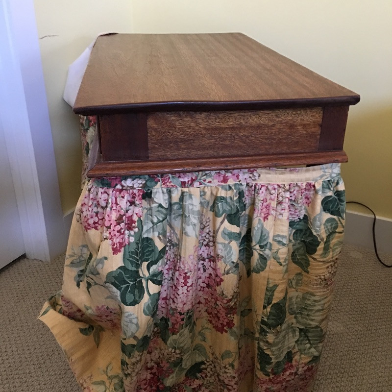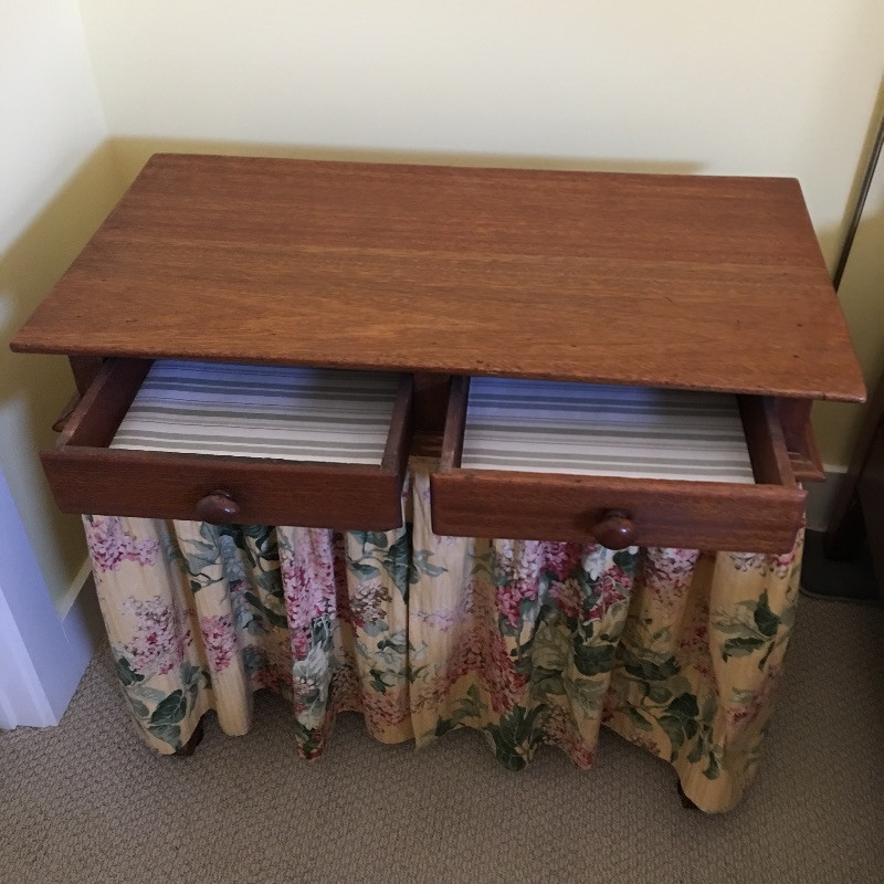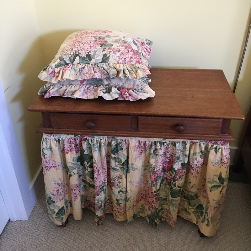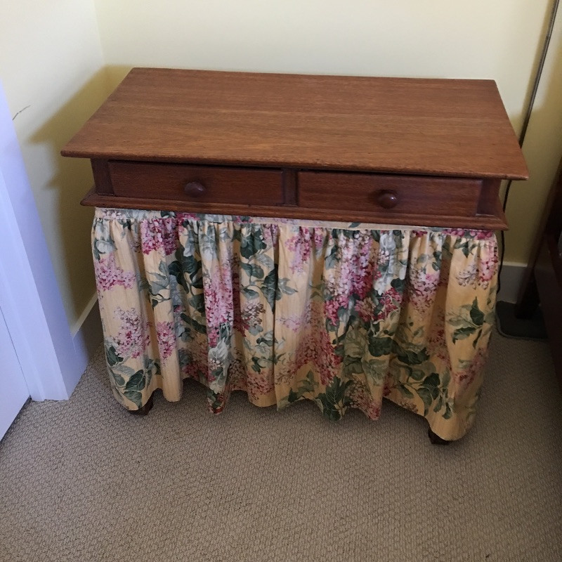 Quaint side table will look good in your home and keep things out of sight in style and comes with two matching decorative pillows. The table is a mid toned wood with 2 drawers and a floral themed skirt and measures 18.5” x 35” x 30”.