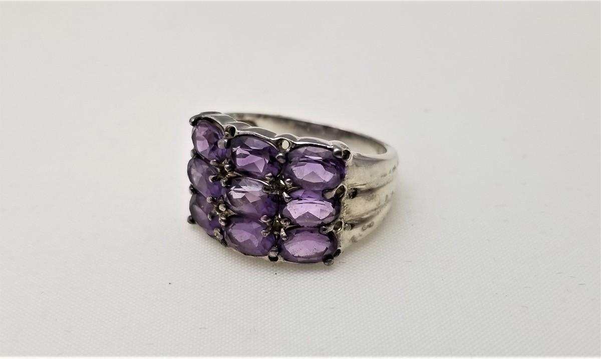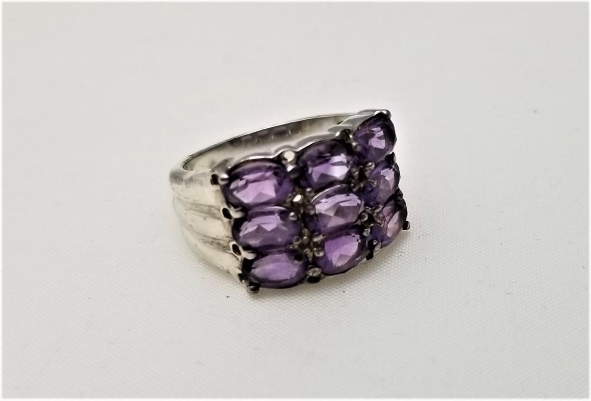 Three rows of pretty faceted amethysts in a sterling silver setting - size 7. .5" side. Good condition.