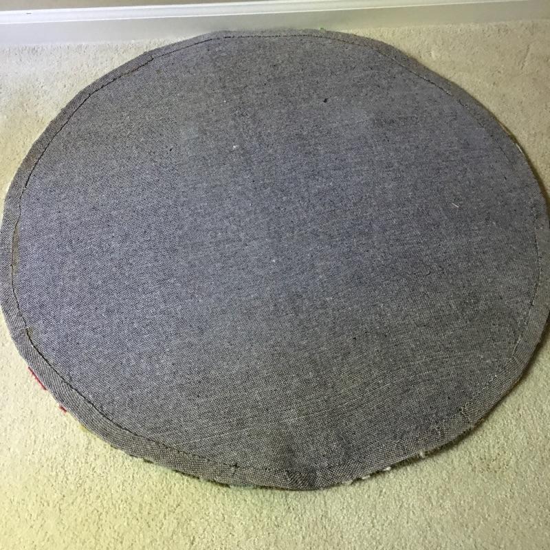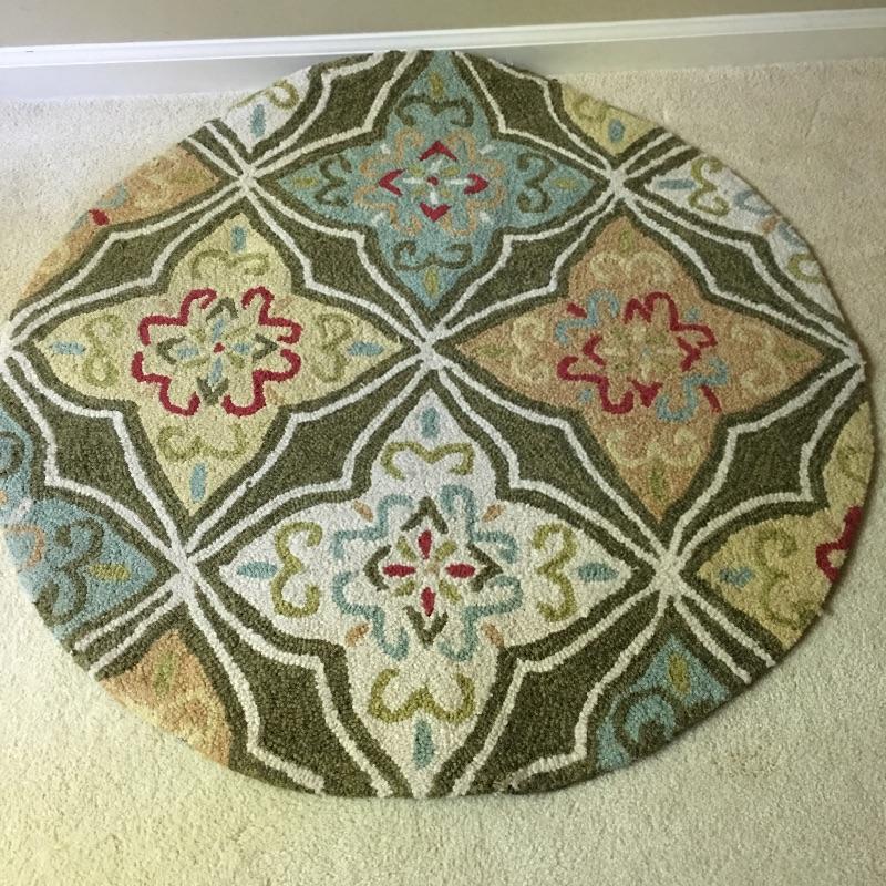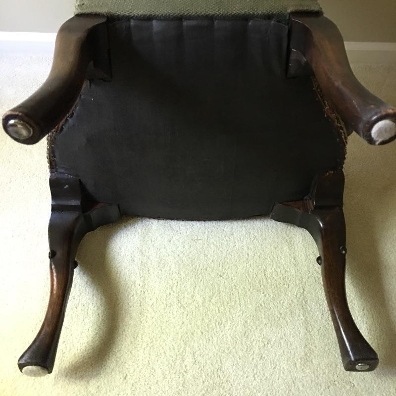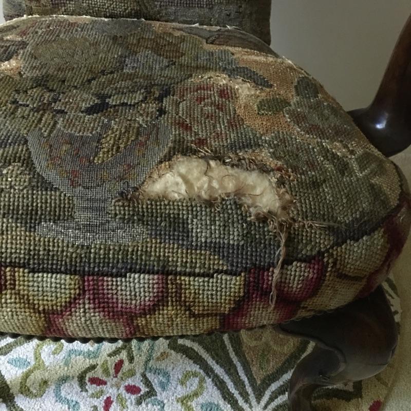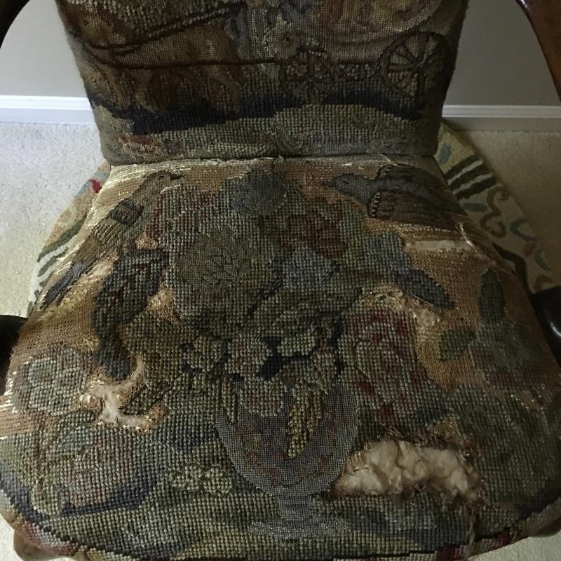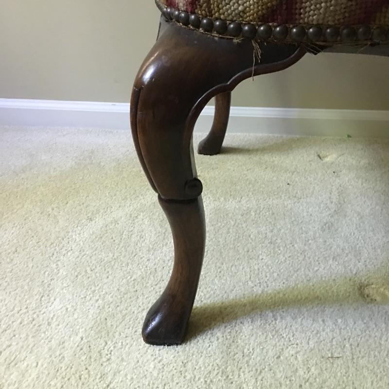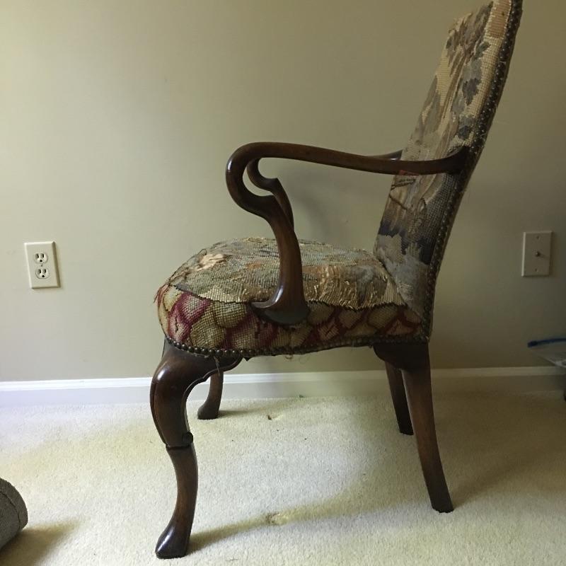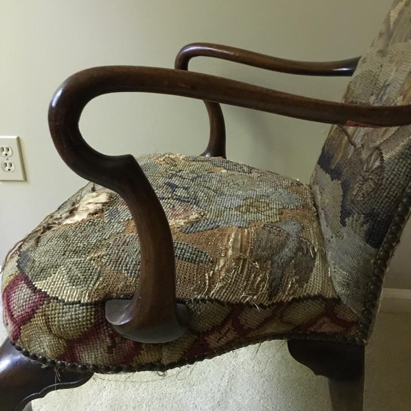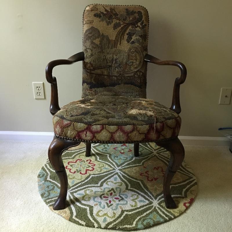 Lovely bent arm chair with brass tacks and needlepoint seat and a small 35” diameter circular rug. Chair has rips on seat and back but otherwise in great condition. Chair measures 21” x 22.75” x 35”. With a seat height of 18”.