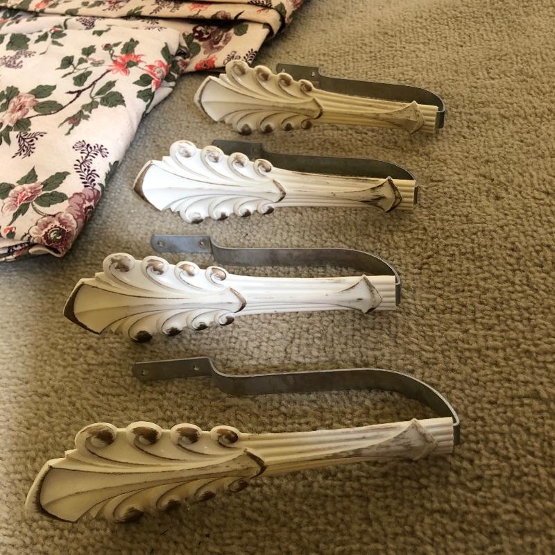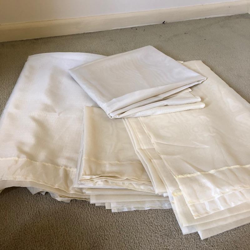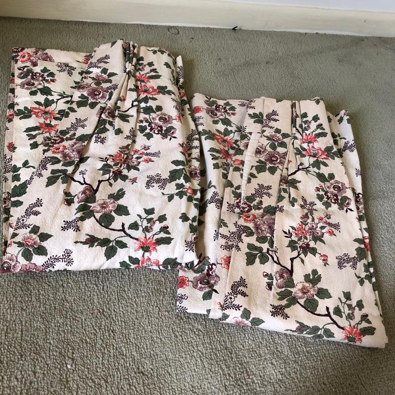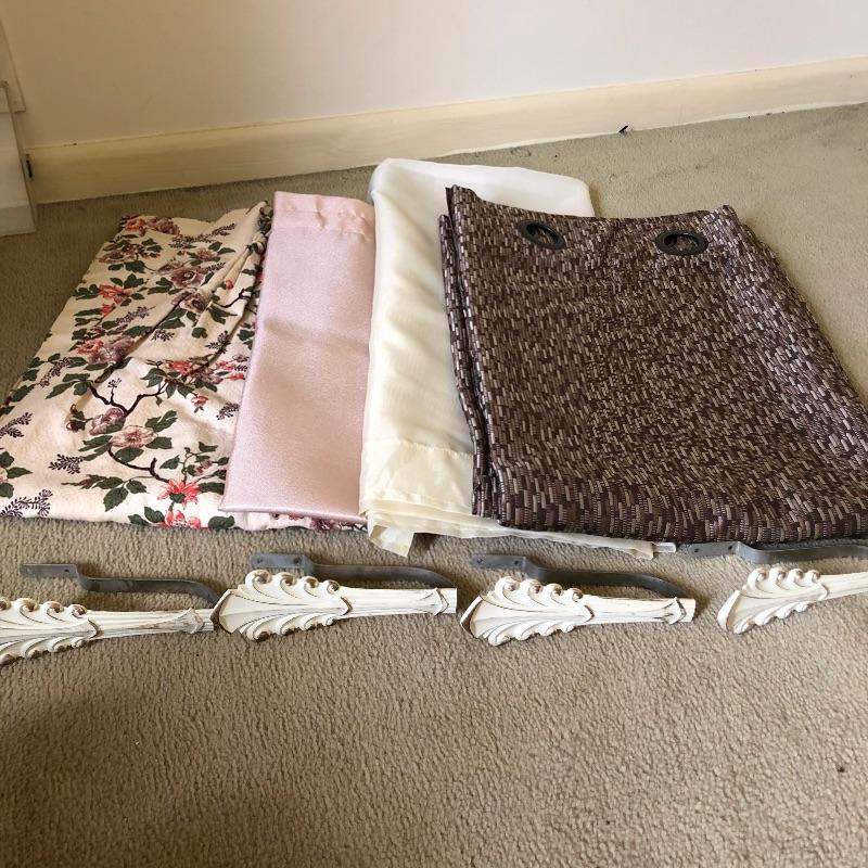 A great and varied assortment of curtains and sheets in this lot. The pair of floral patterned drapes are vintage and measure 25” x 80“, the 4 matching brown drapes hang off hooks and measure 54” x 84”. The coral vintage drape is shorter than the rest measuring 39” x 41“. The sheer drapes measure 60” x 95”. Also included are 4 vintage plastic decorative hooks.