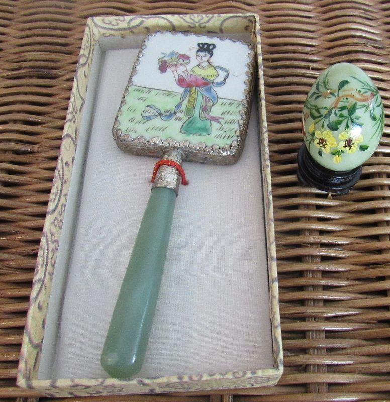 Lot 153 - Vintage Oriental Jade Mirror and Hand Painted Jade Egg