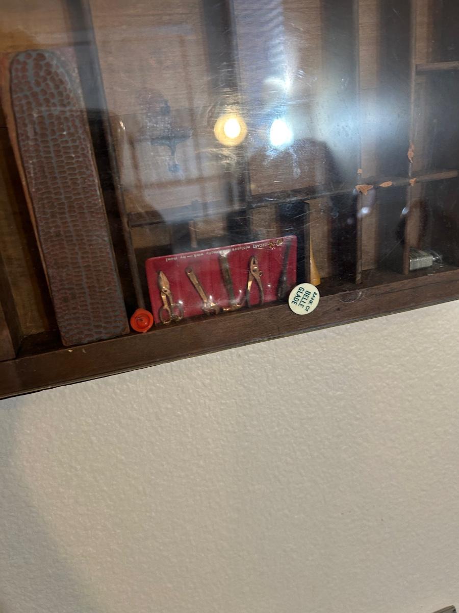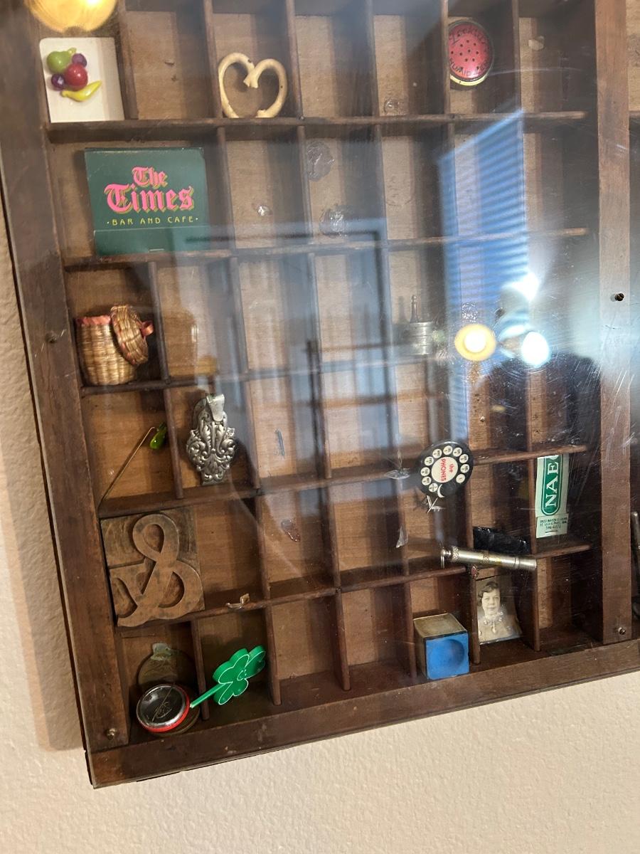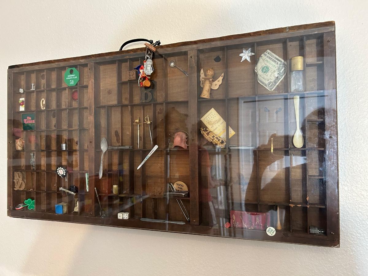 Vintage Printer Drawer being utilized as a shadow box, contents included. 32" x 16 1/2"