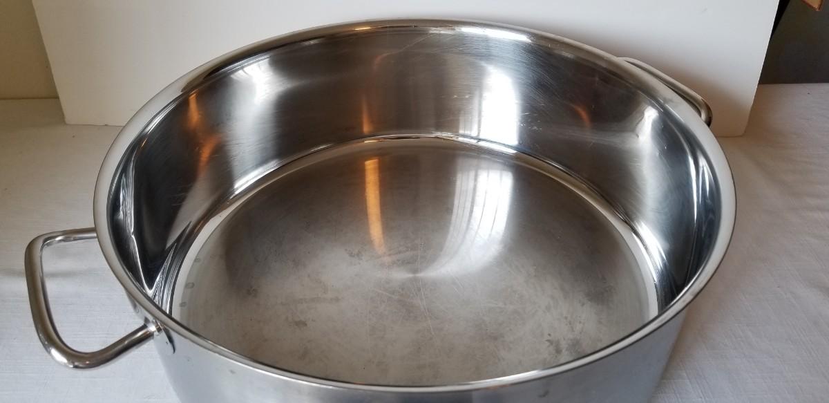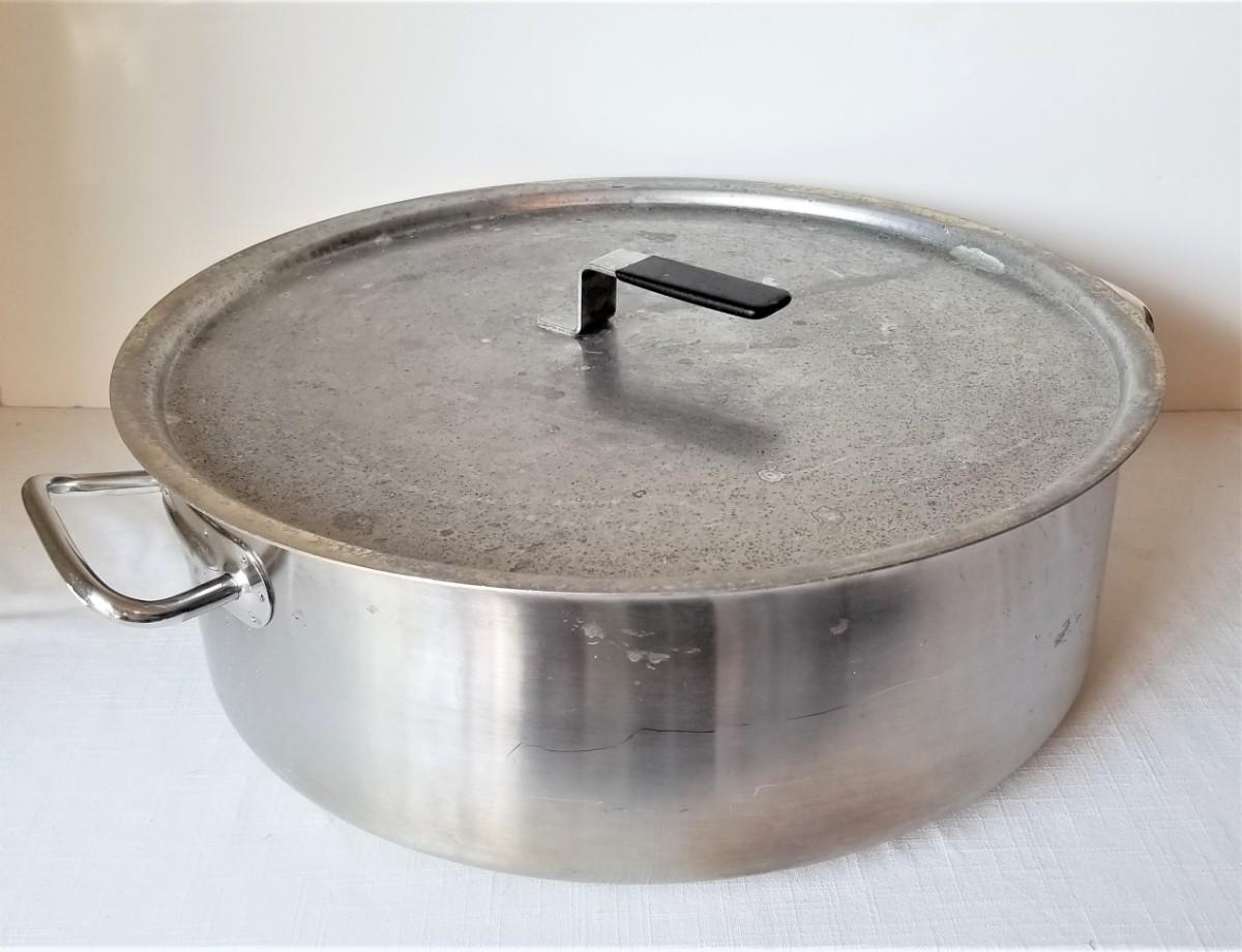 Gently used Vollrath Heavy Guage Stainless Steel Skillet with lid - handle to handle measures 20" across, 6" tall. It's a big one.