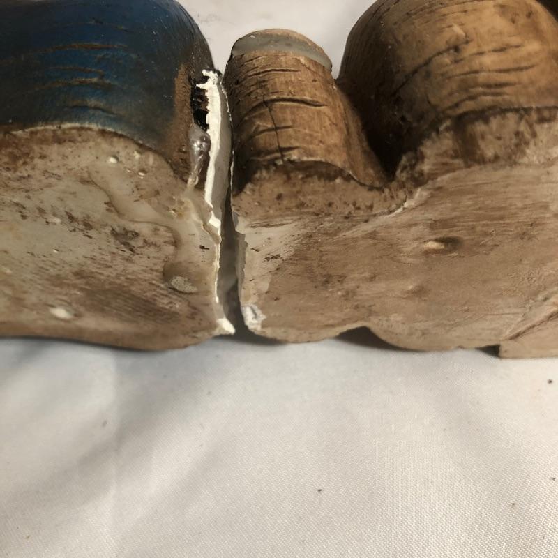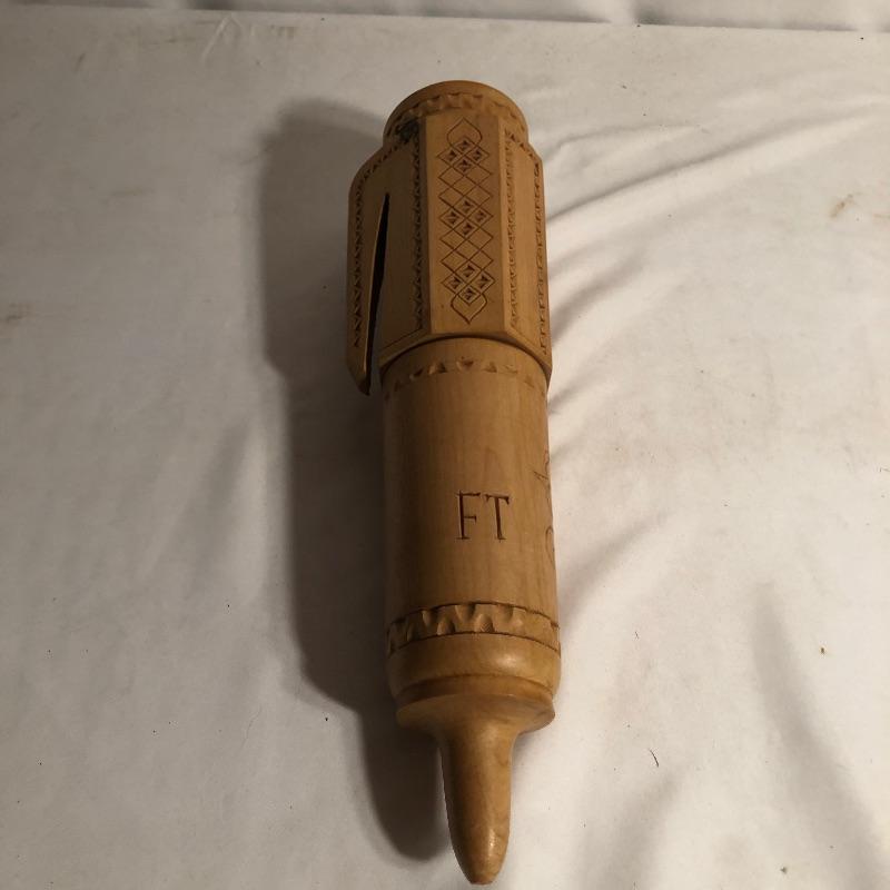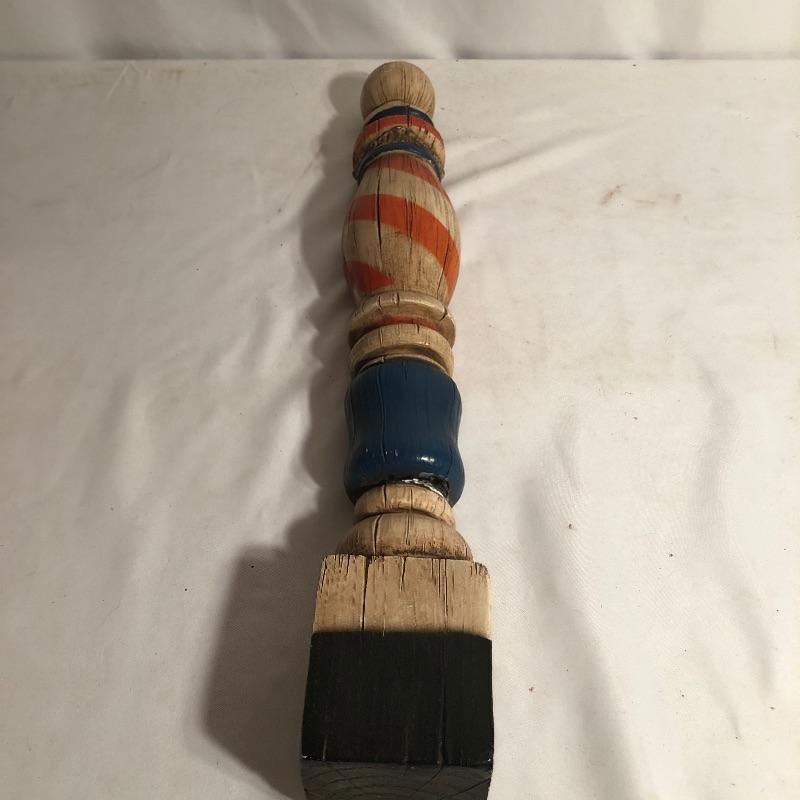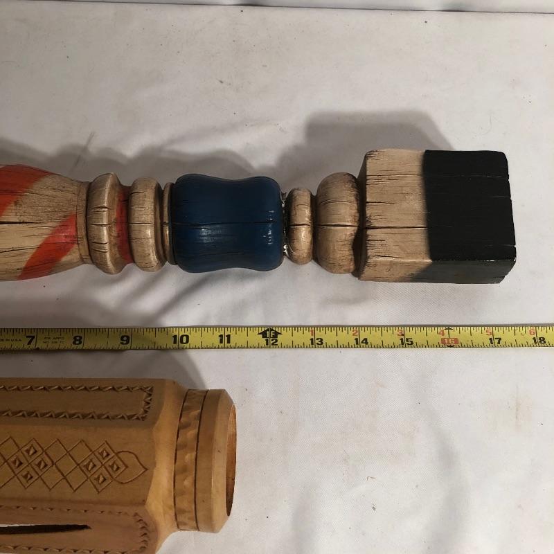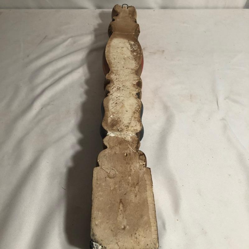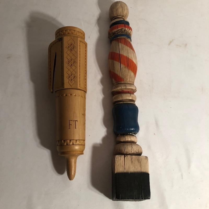 Two unique items in this lot. The shorter piece is a very light intricately carved wooden piece that is hollow inside and has two sets of initials carved into the sides and a hook to hang it. The taller piece also with a hanging hook looks like it is made of wood but it is actually a plaster like material and it does need to be glued in an area where it has split, see images. Resembles a barber shop sign!
