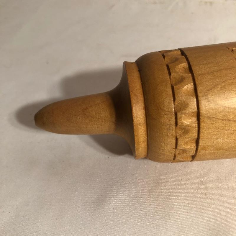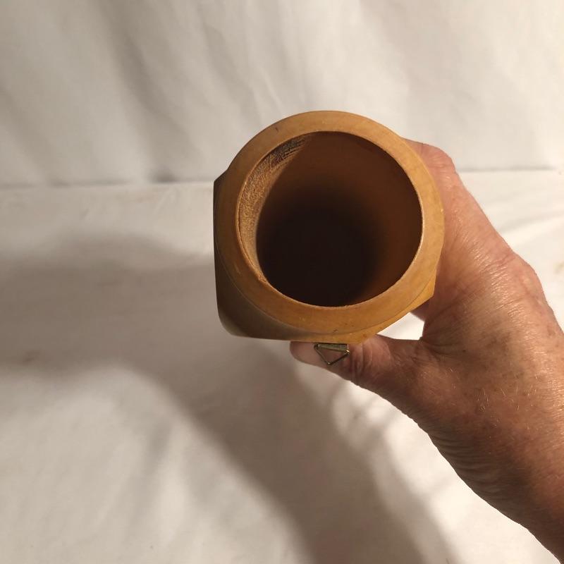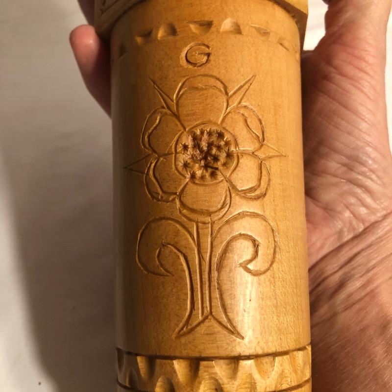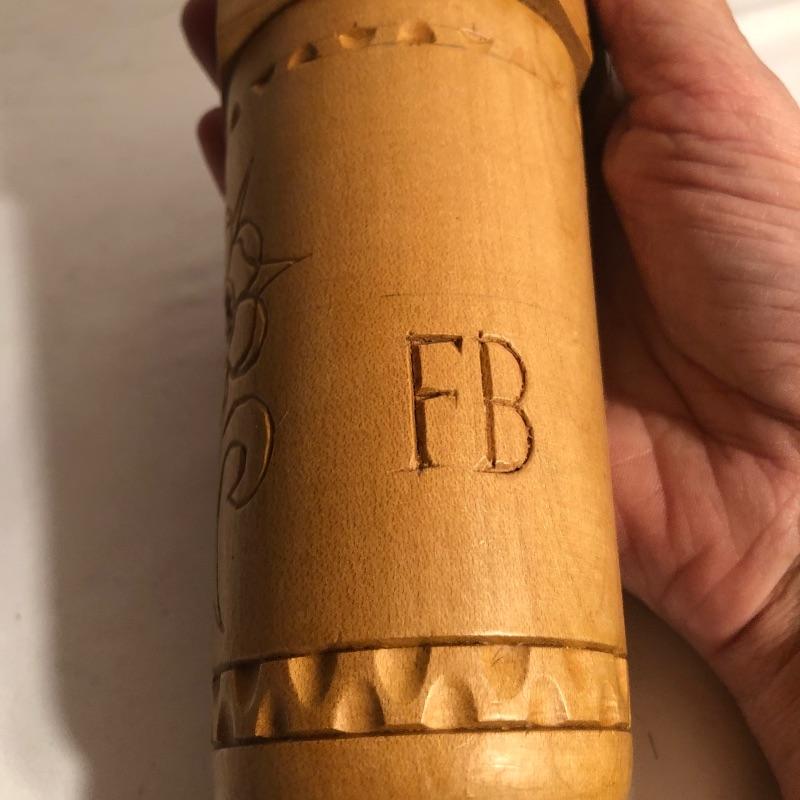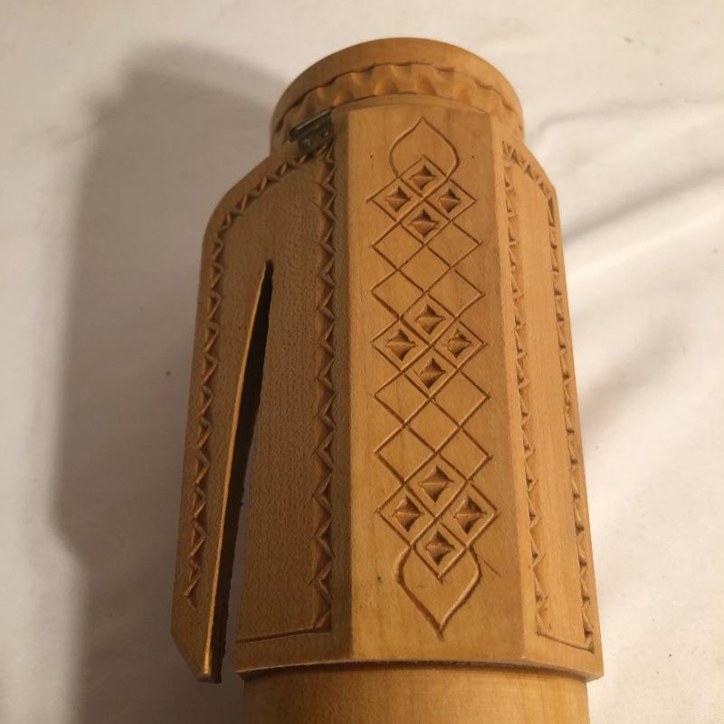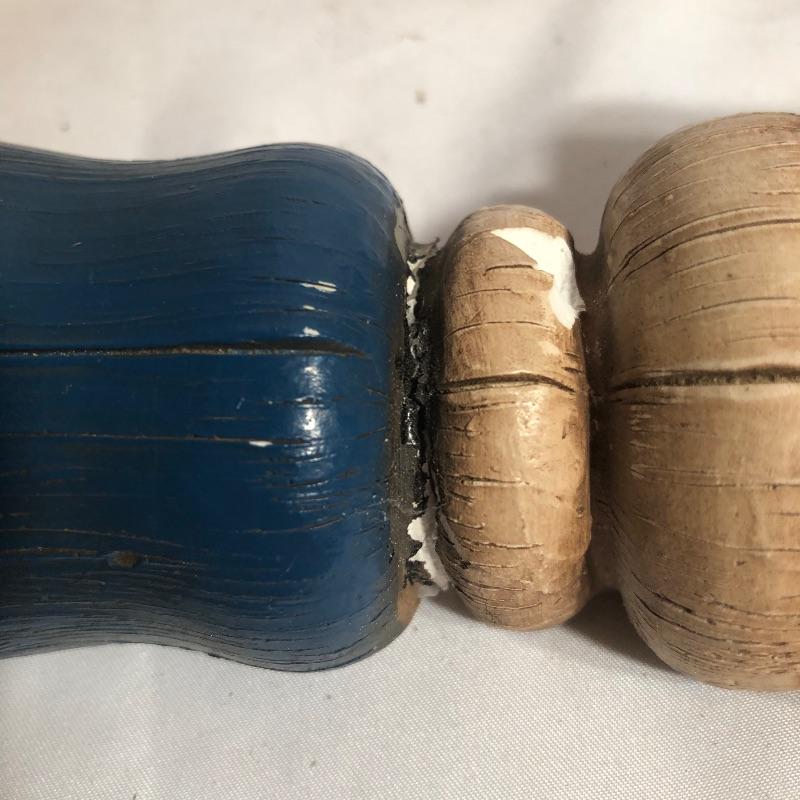 Two unique items in this lot. The shorter piece is a very light intricately carved wooden piece that is hollow inside and has two sets of initials carved into the sides and a hook to hang it. The taller piece also with a hanging hook looks like it is made of wood but it is actually a plaster like material and it does need to be glued in an area where it has split, see images. Resembles a barber shop sign!