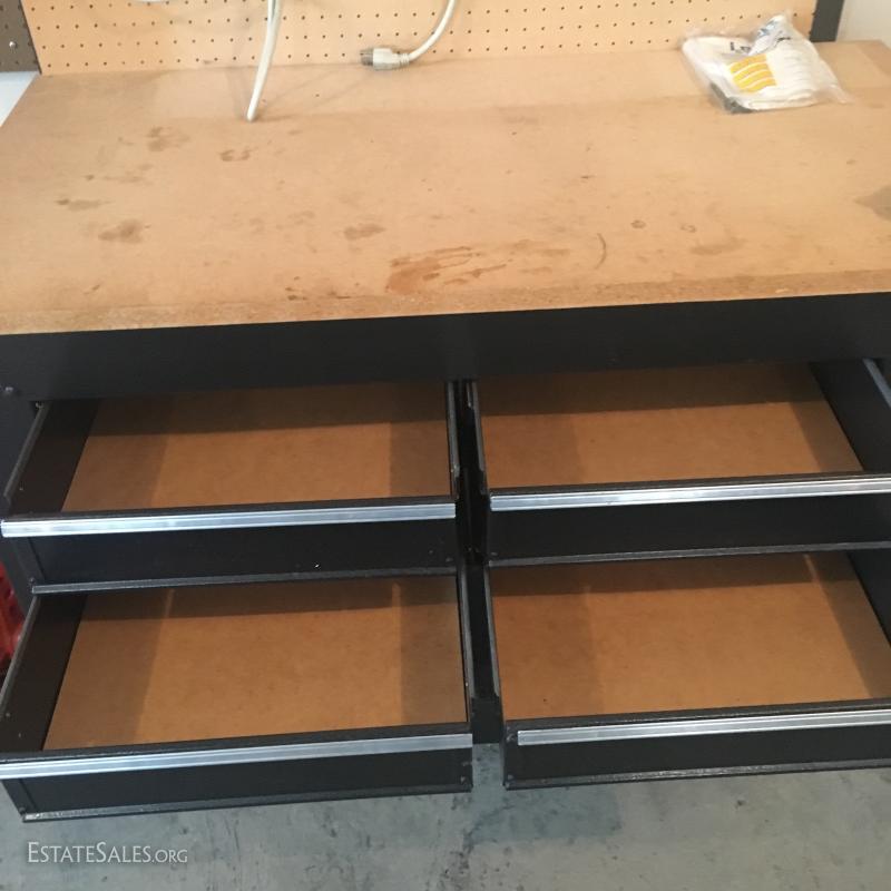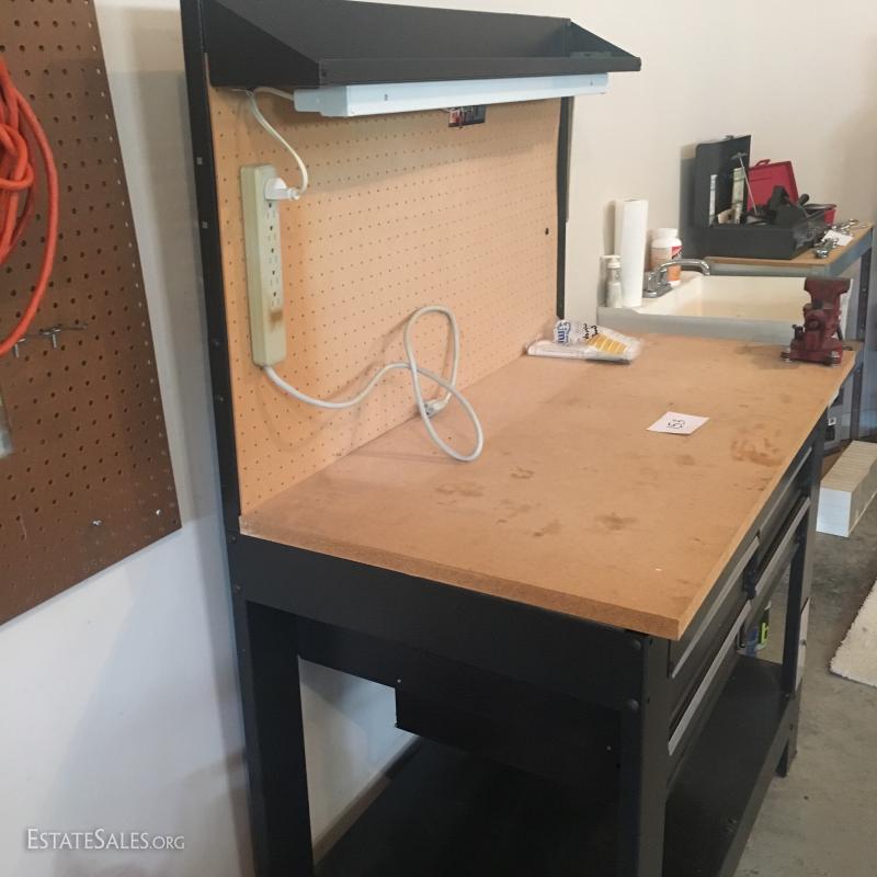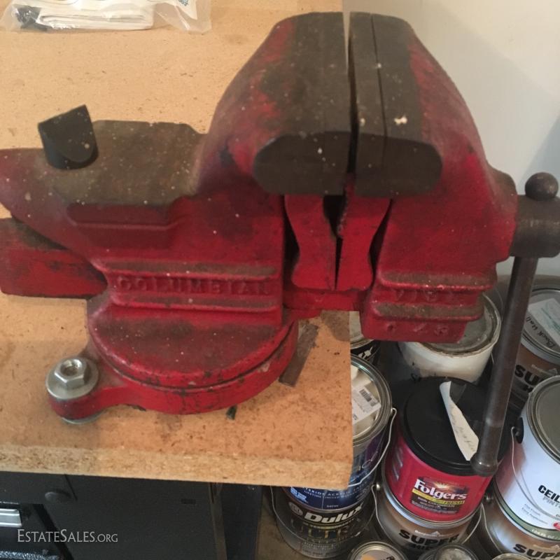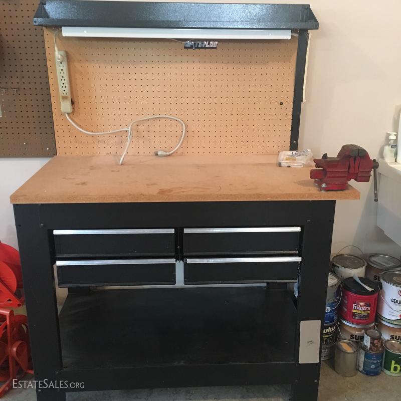 Workbench with a Columbian Vise C43. Florencant work lamp attached.