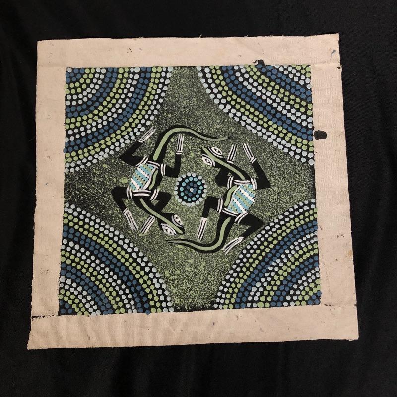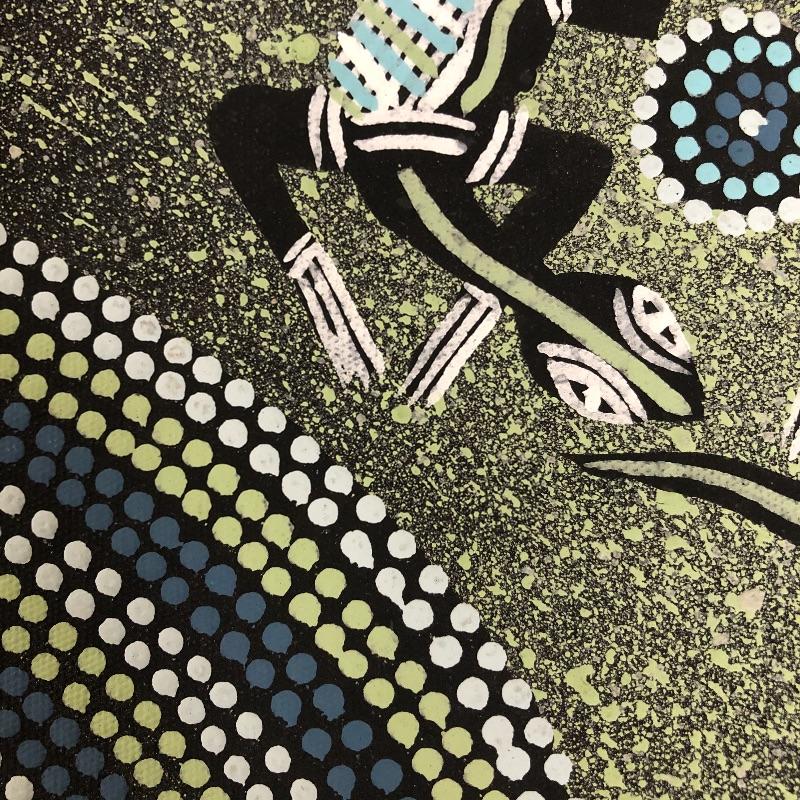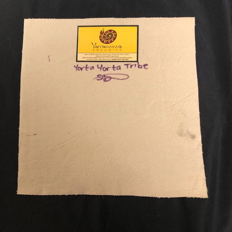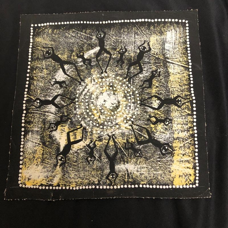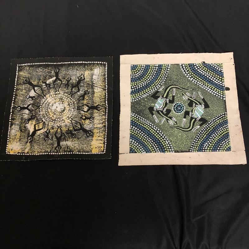 This lot includes two small canvas paintings. The first (10” x 9.75”) is a painting with people dancing around a circle with a black colored edge. The words “Yorta Yorta Tribe” are written on the back. The second (10.75” x 11”) seems to depict two salamanders or geckos crawling around a circle. There is pen signature on the back.