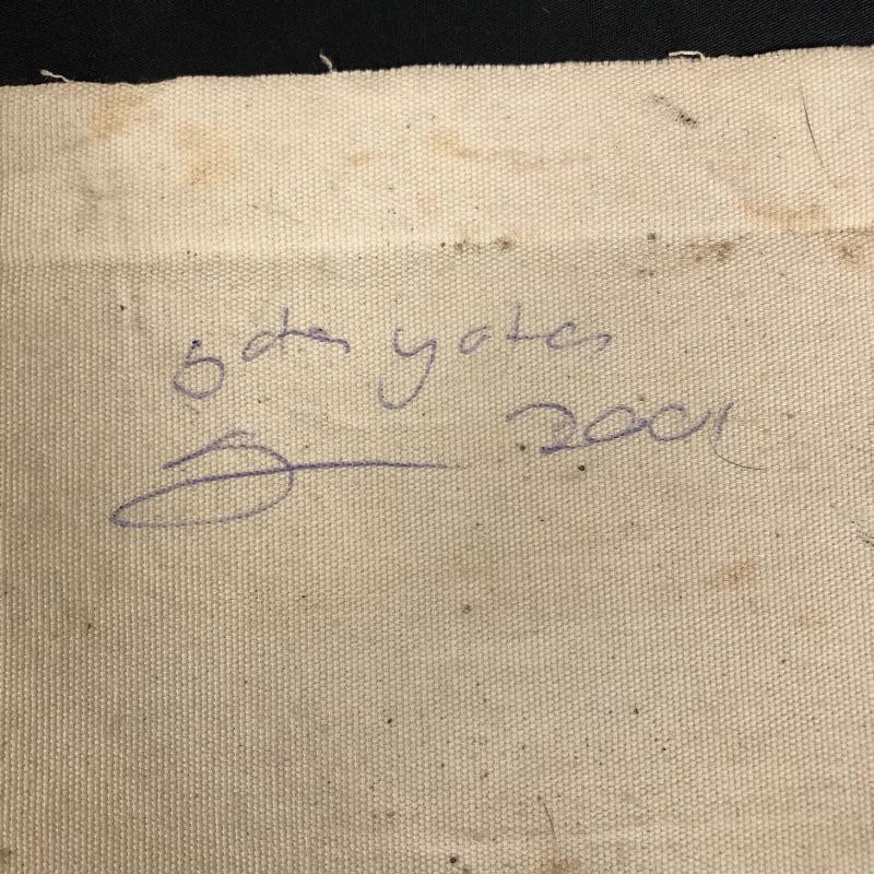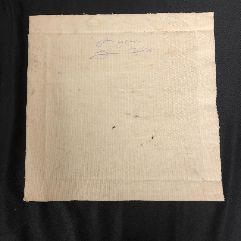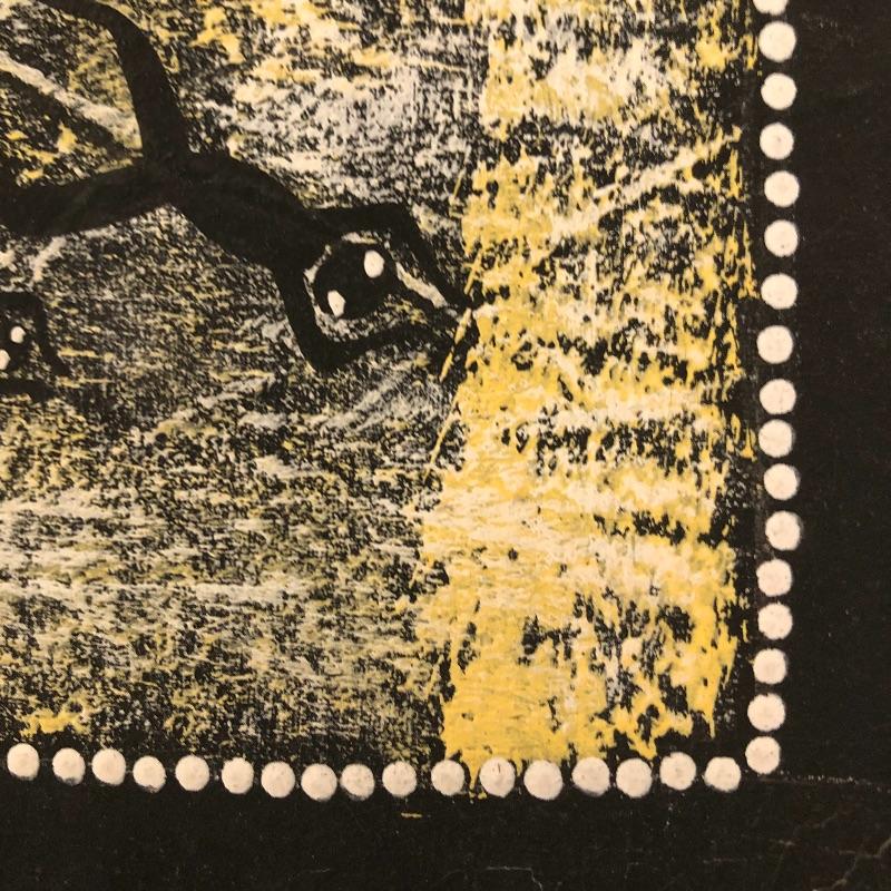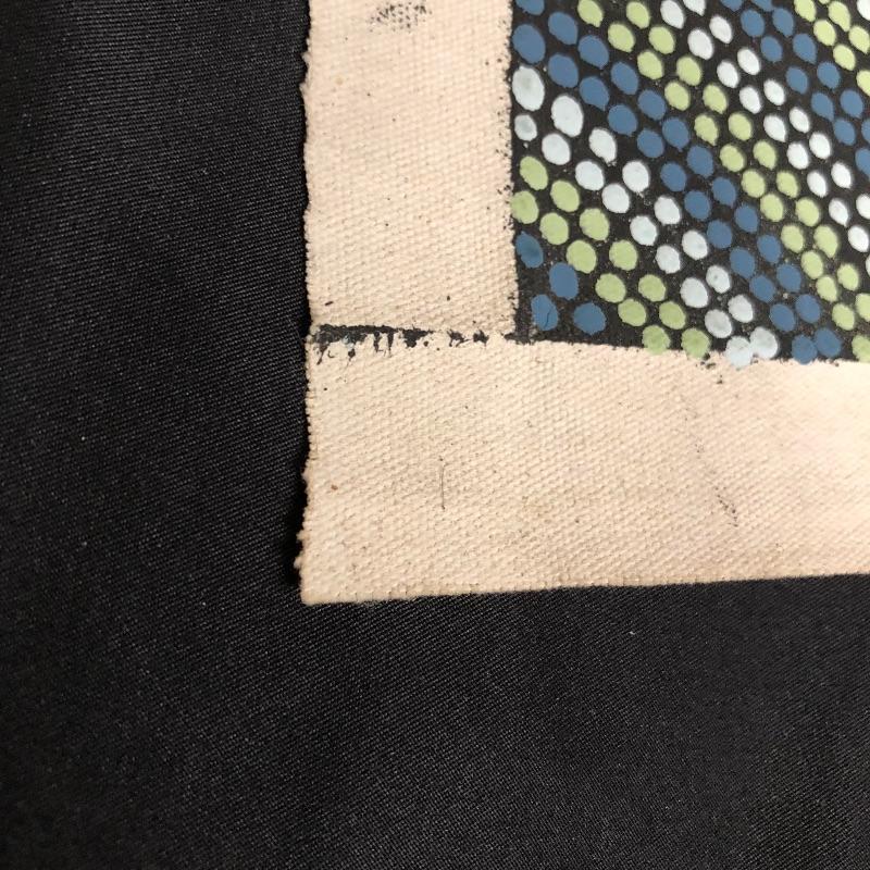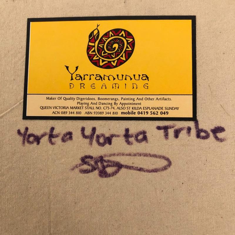 This lot includes two small canvas paintings. The first (10” x 9.75”) is a painting with people dancing around a circle with a black colored edge. The words “Yorta Yorta Tribe” are written on the back. The second (10.75” x 11”) seems to depict two salamanders or geckos crawling around a circle. There is pen signature on the back.
