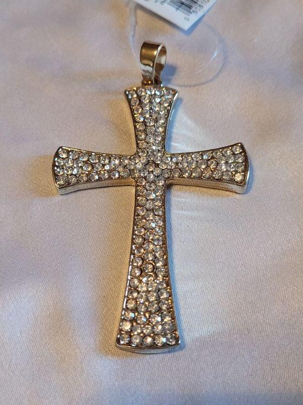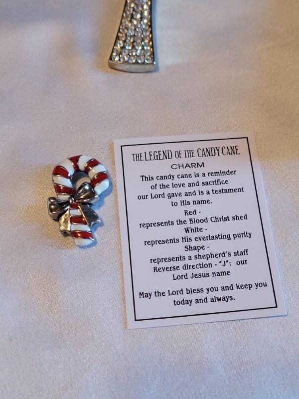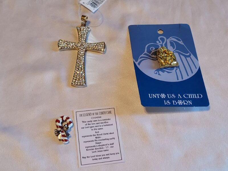 Lot 154: New Large Rhinestone Cross Pendant, Nativity Pin and Candy Cane Charm