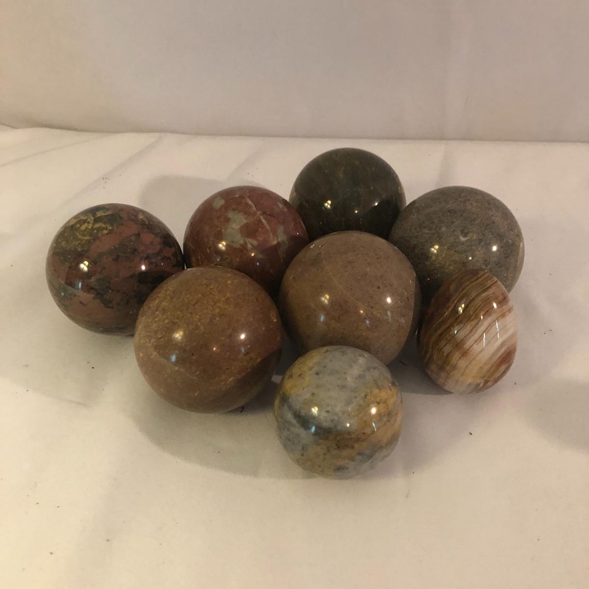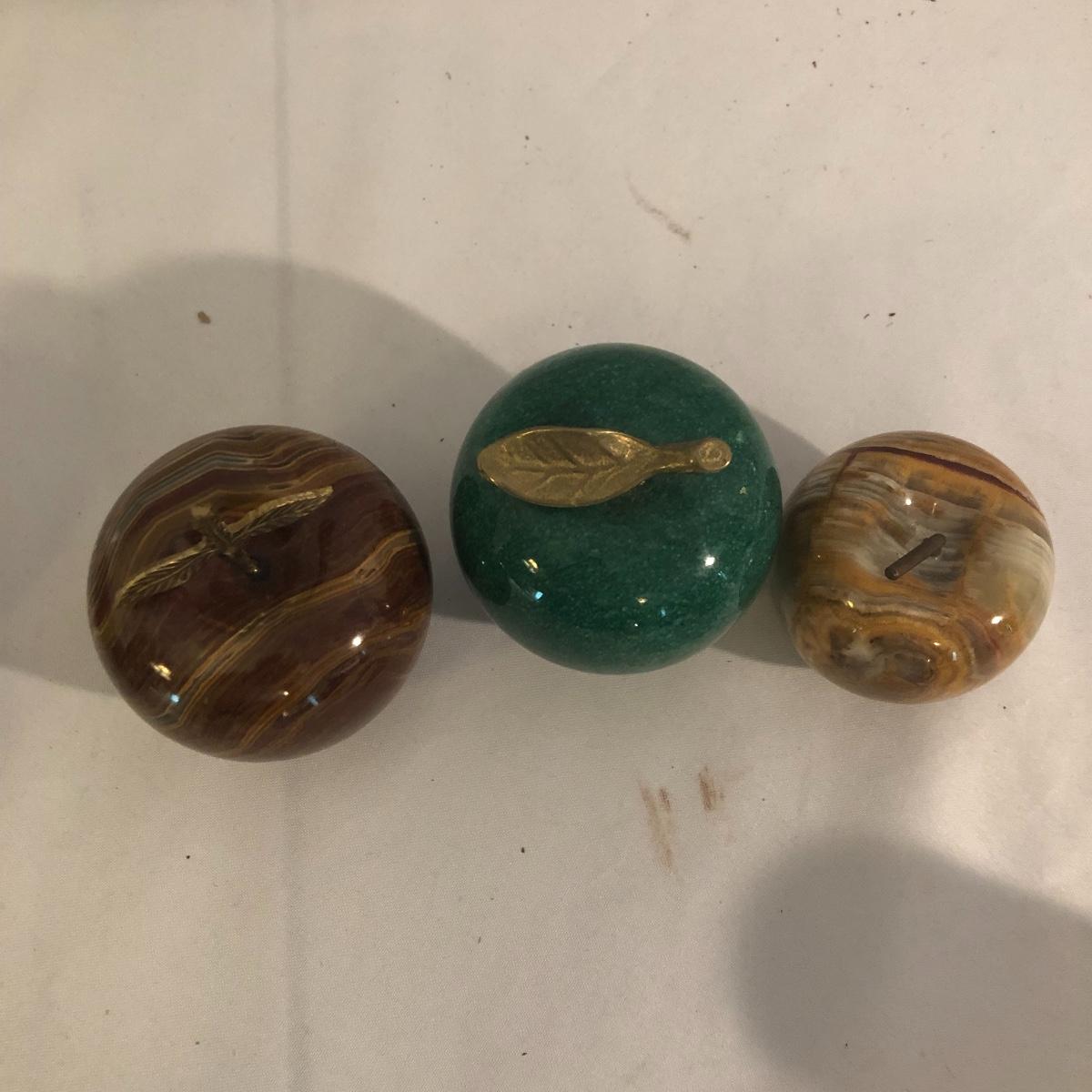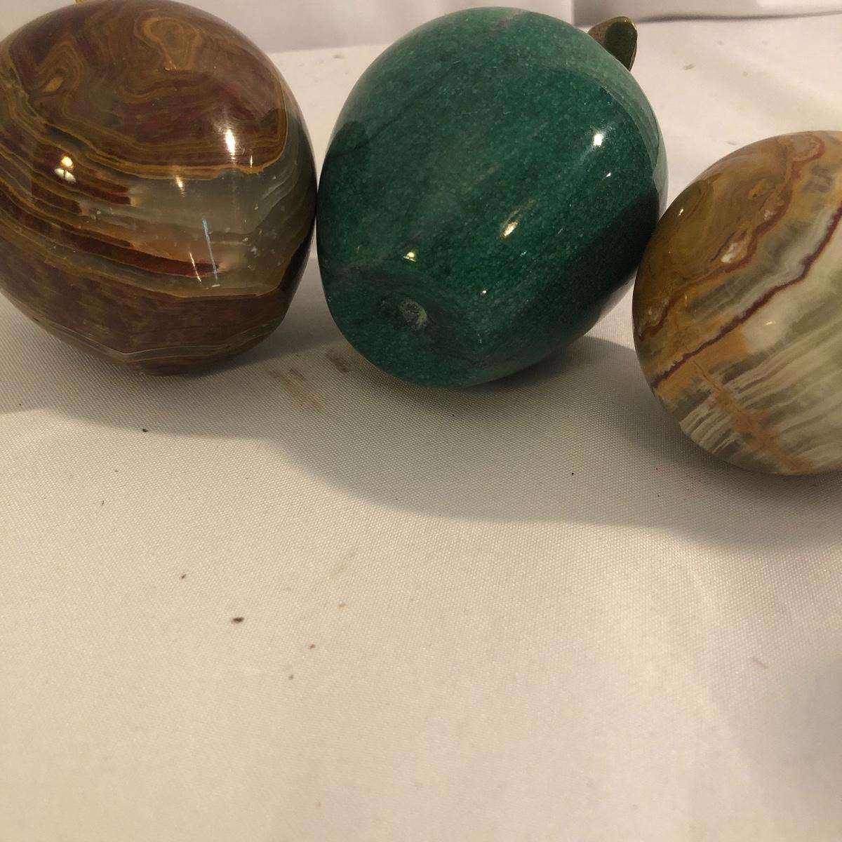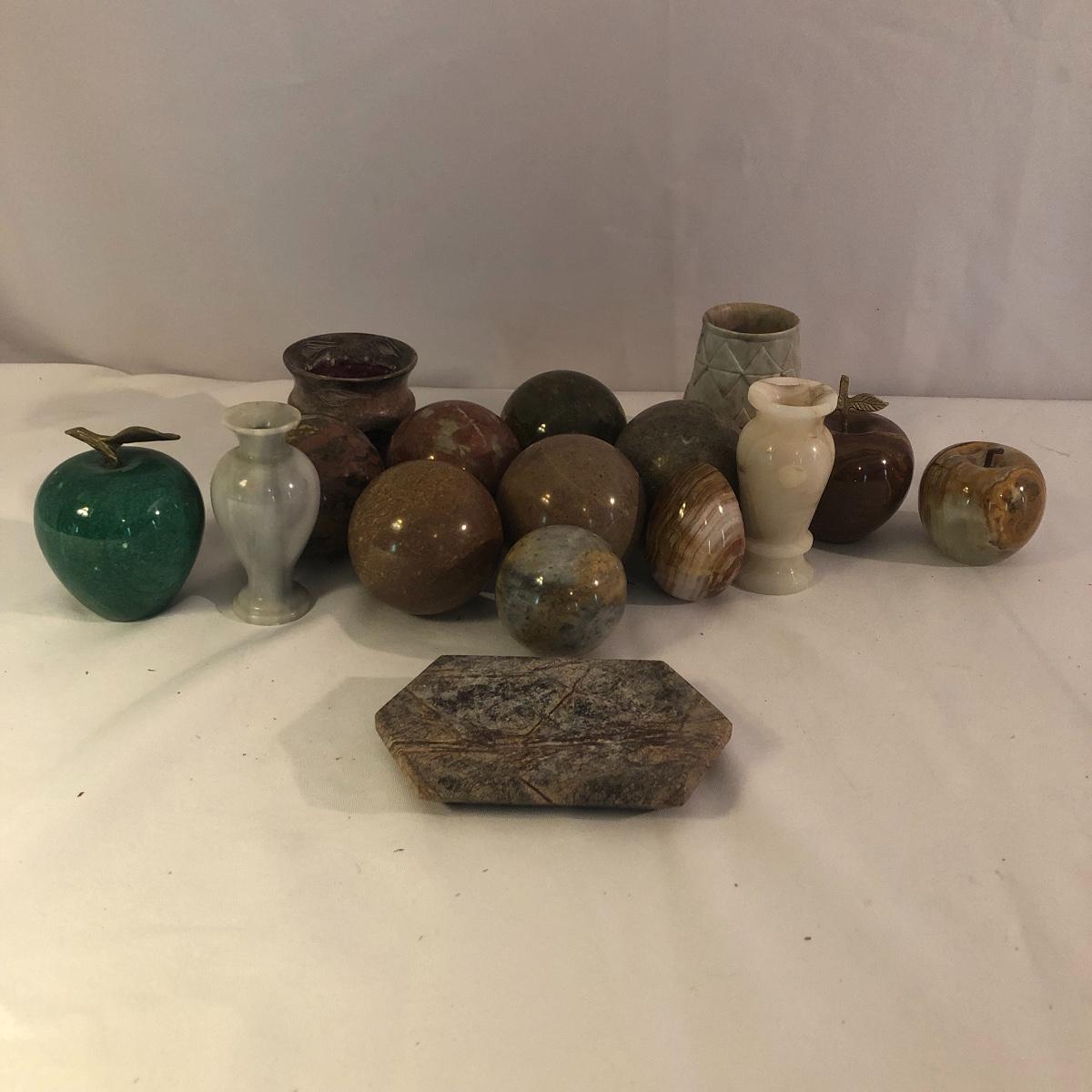 Lot includes six 3”D stone balls in a variety of colors, three apples, small tray, tee we o mini stone urns and two small pots. Largest spheres measure 3”D.