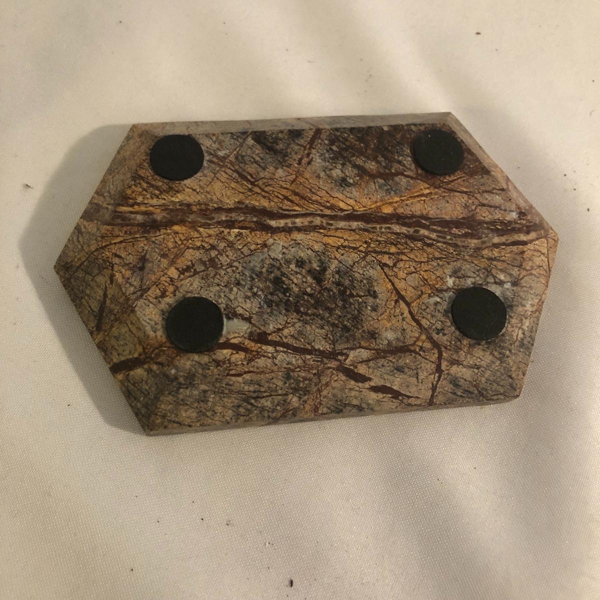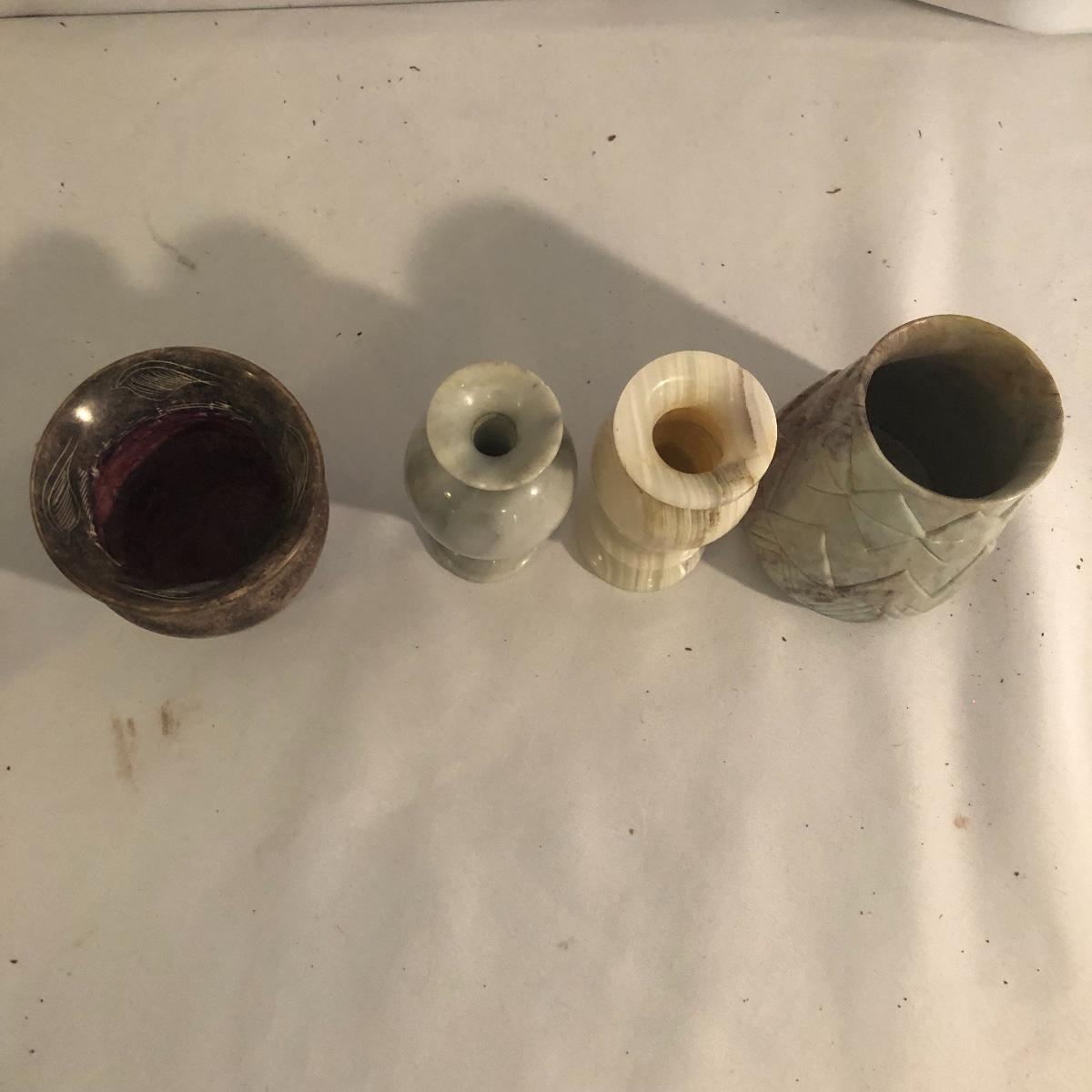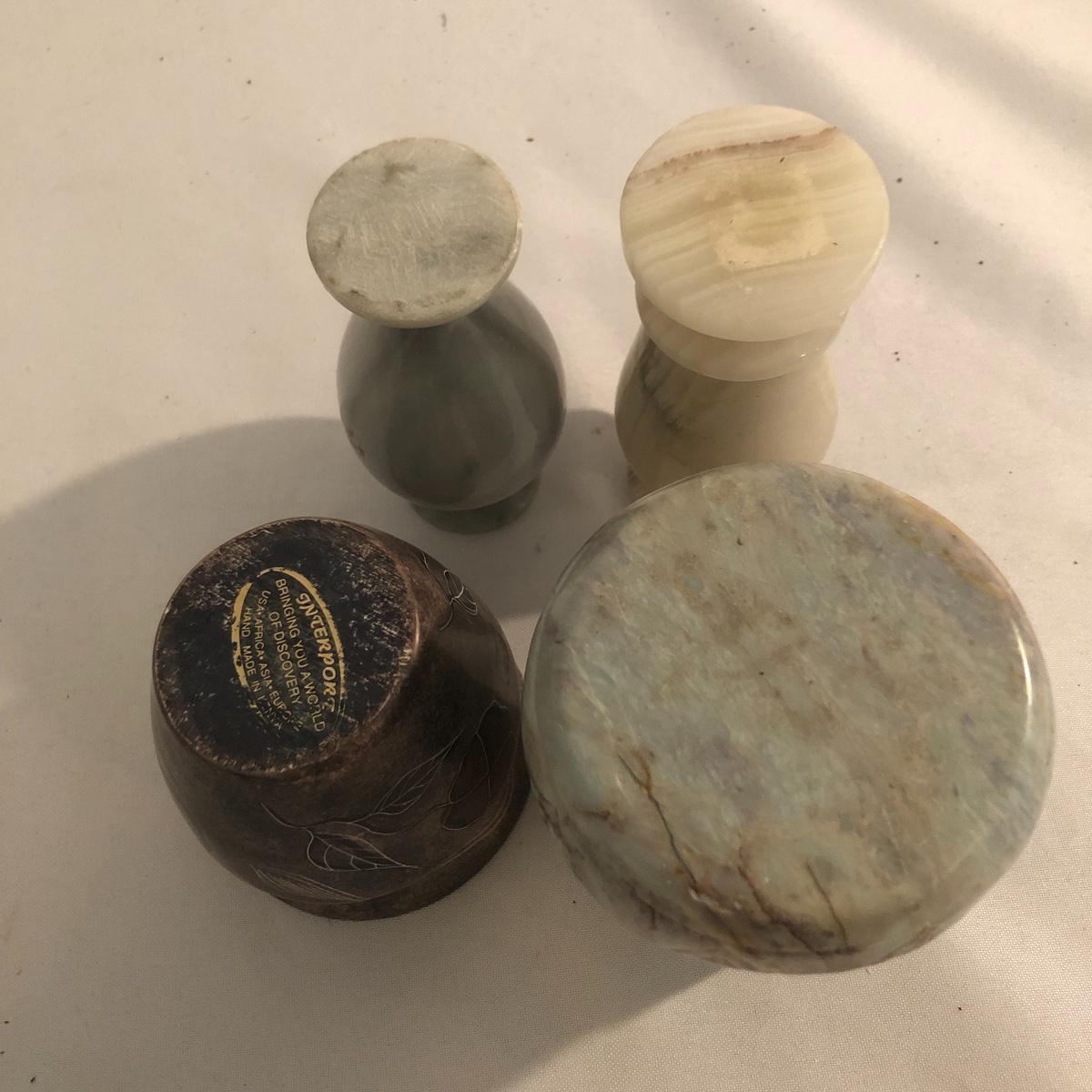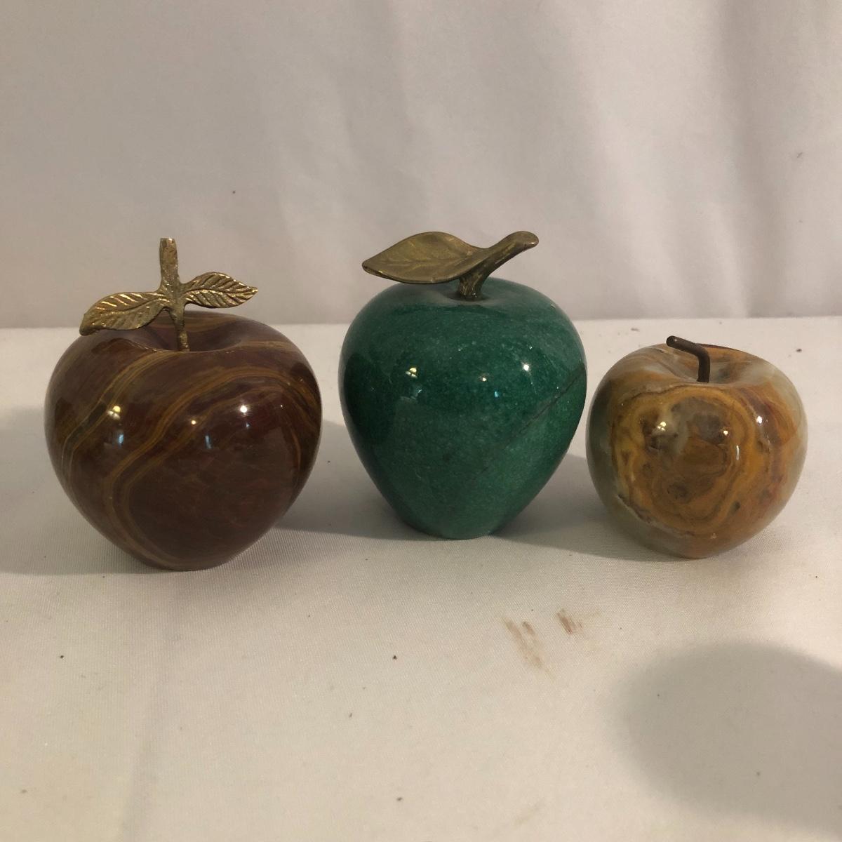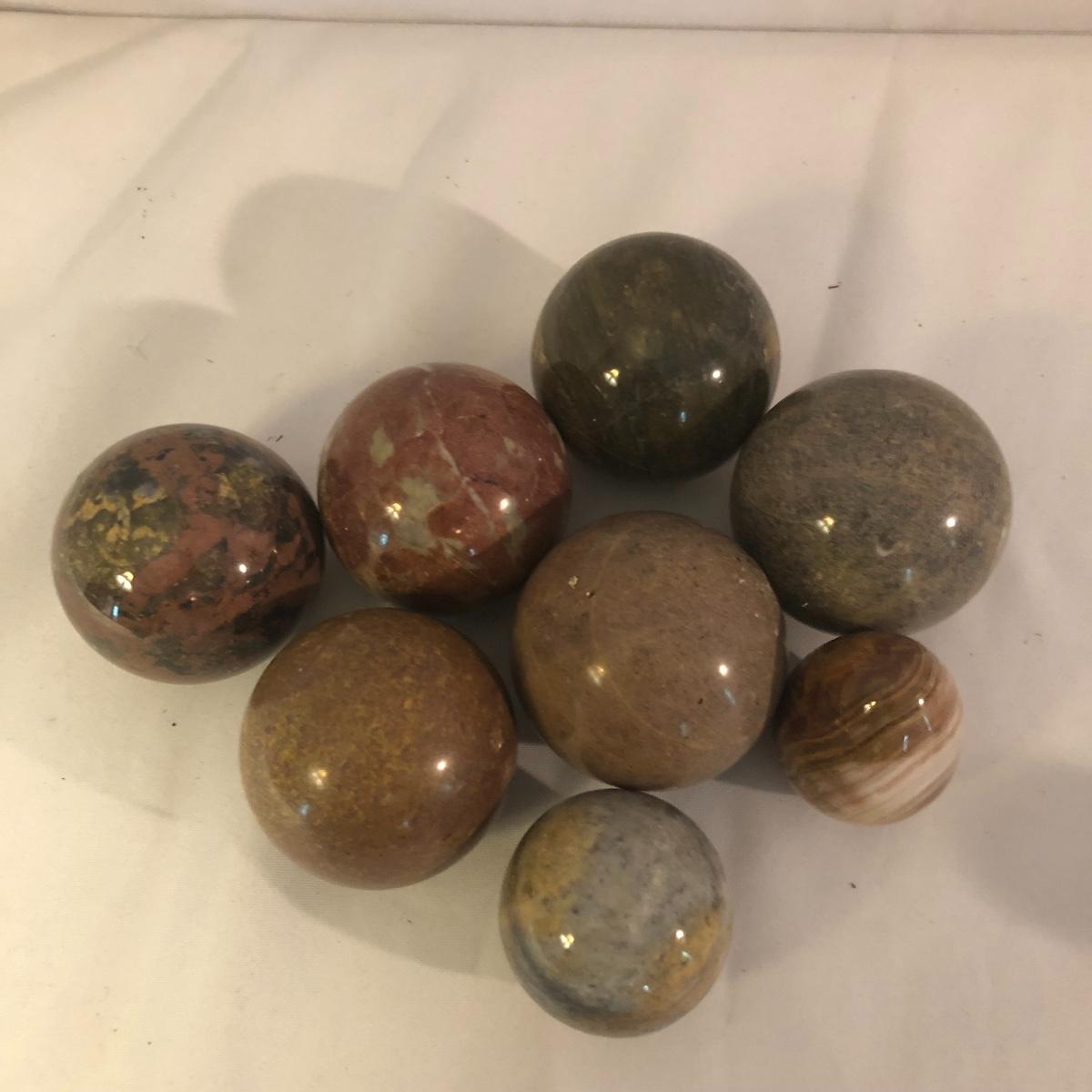 Lot includes six 3”D stone balls in a variety of colors, three apples, small tray, tee we o mini stone urns and two small pots. Largest spheres measure 3”D.