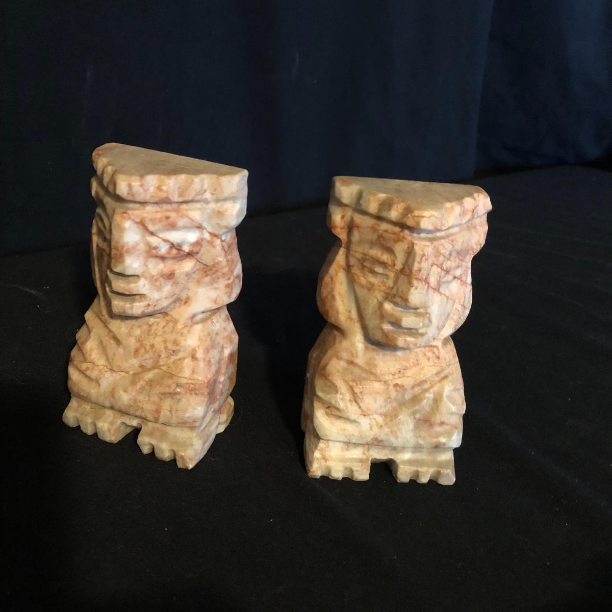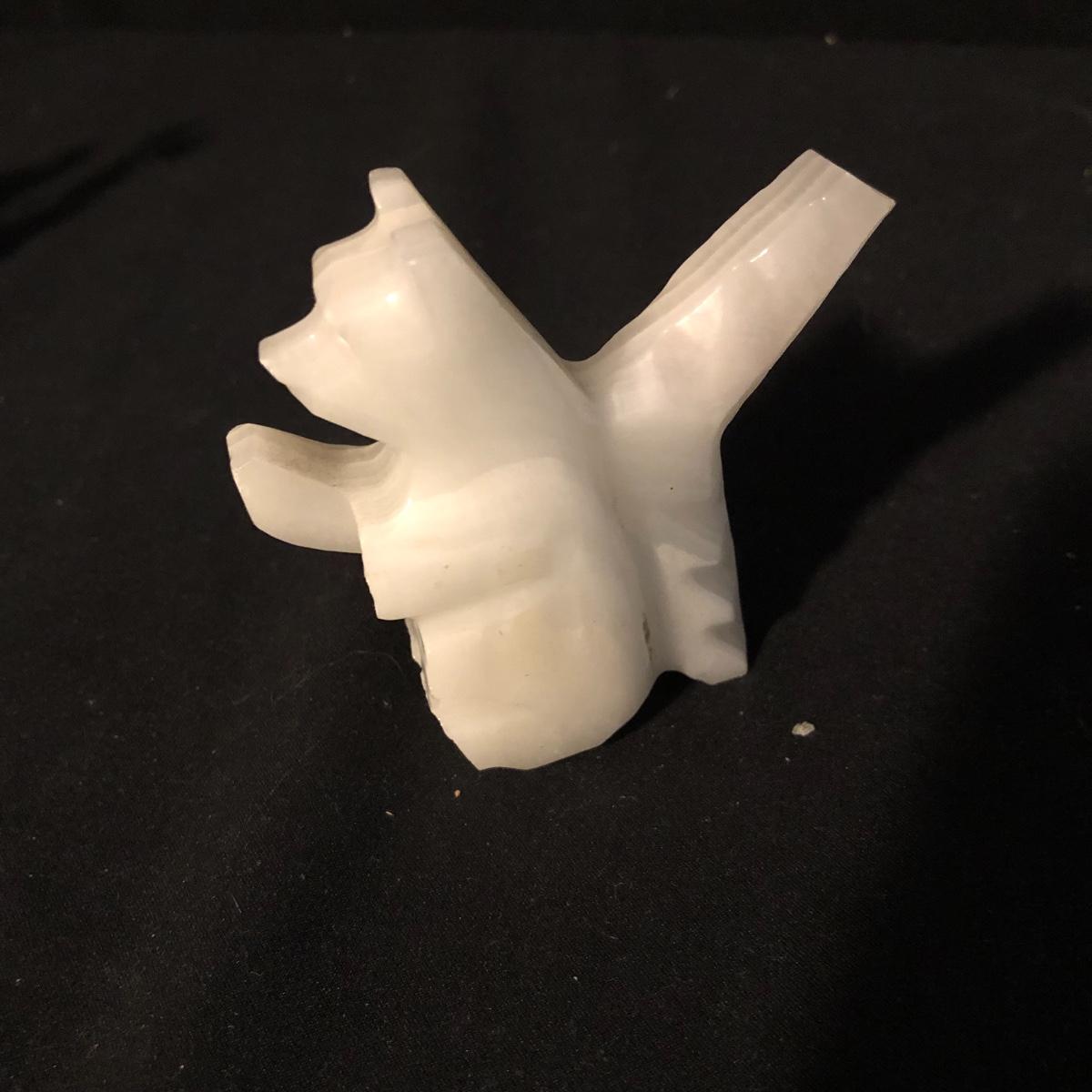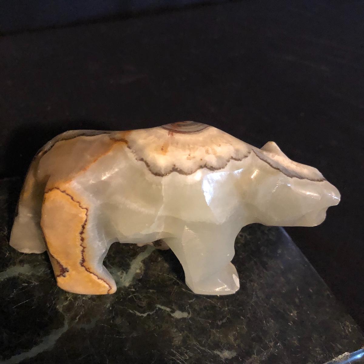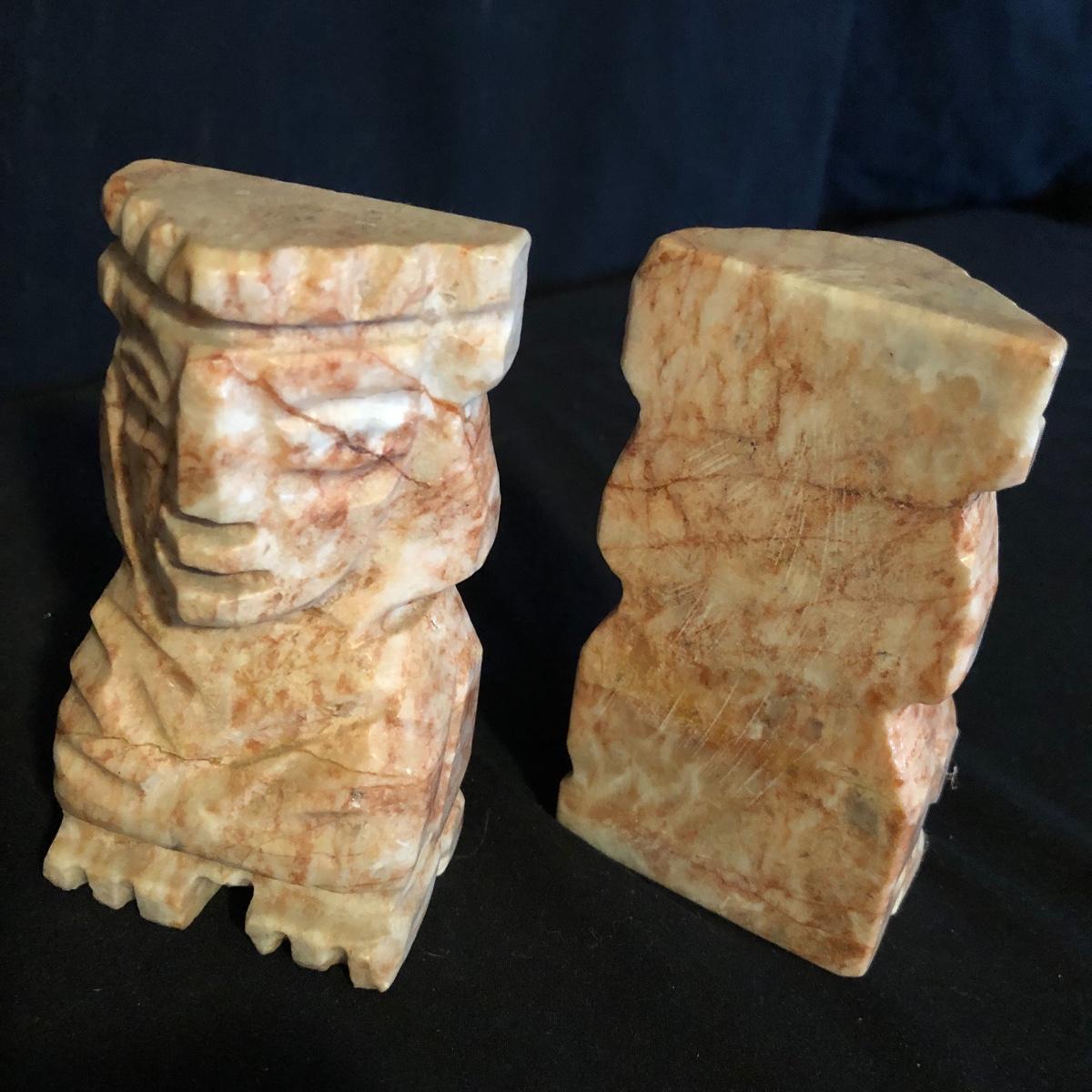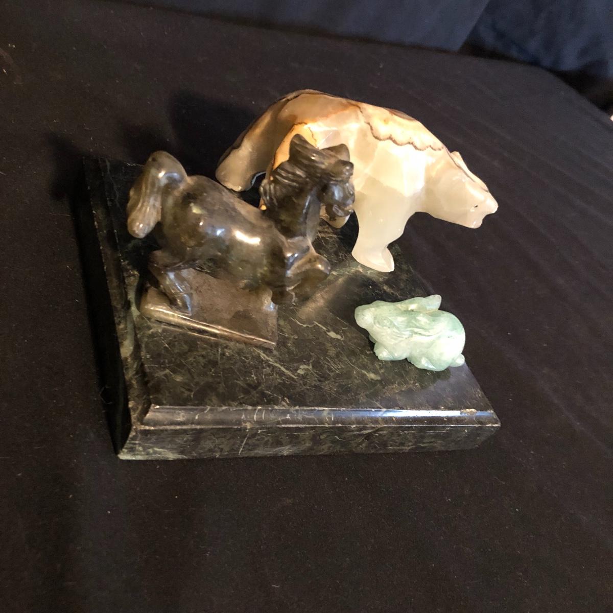 Enjoy the beauty of marble with this lot. It includes three plants, two Aztec style book ends, four figurines and a black marble base. The plants consist of a flower pot that is 6” tall and two trees on stone bases. The leaves or petals on the trees appear to be gems or rocks with stone bases. The pink and white book ends are approximately 4.5” tall. The polar bear appears to have a chip on his face and The squirrel is missing one of its’ front arms. Shipping Available.
