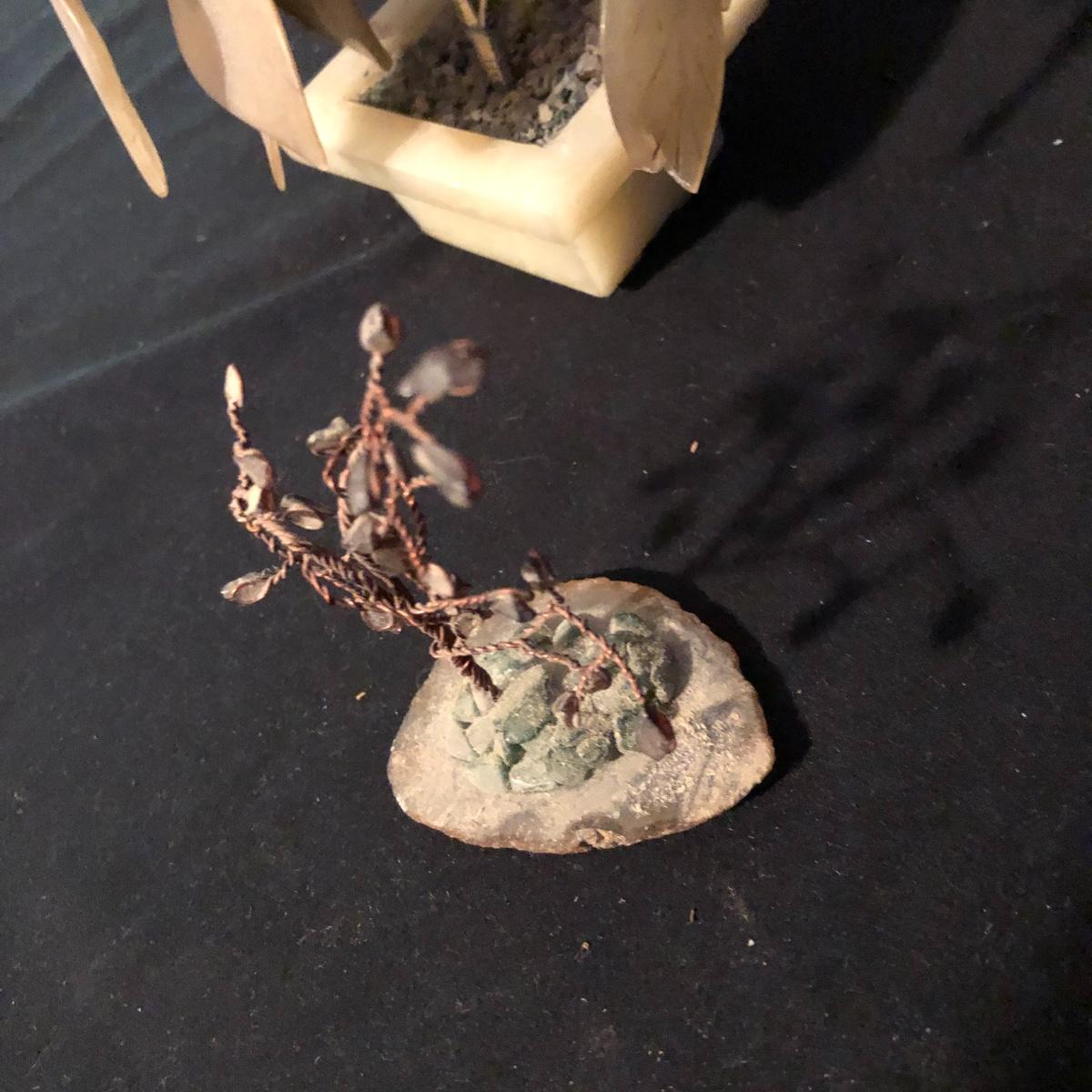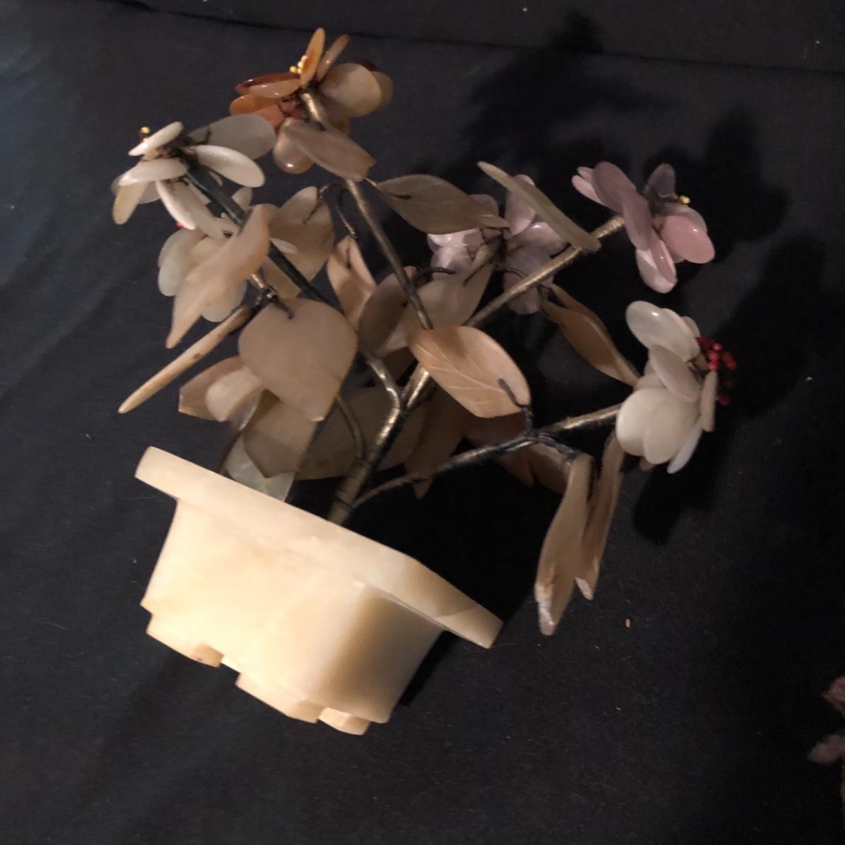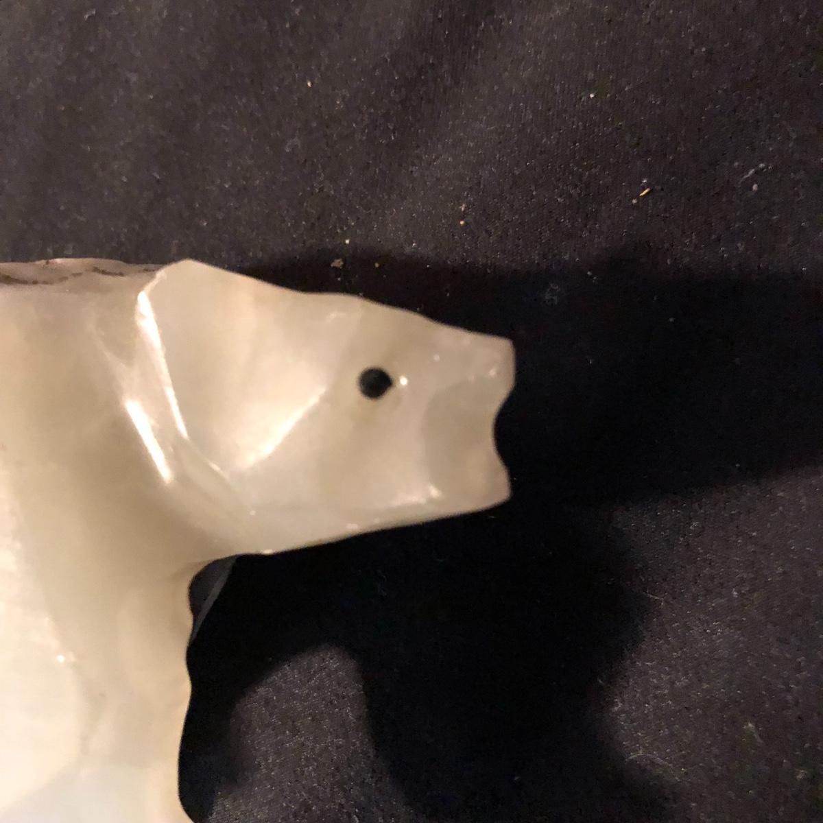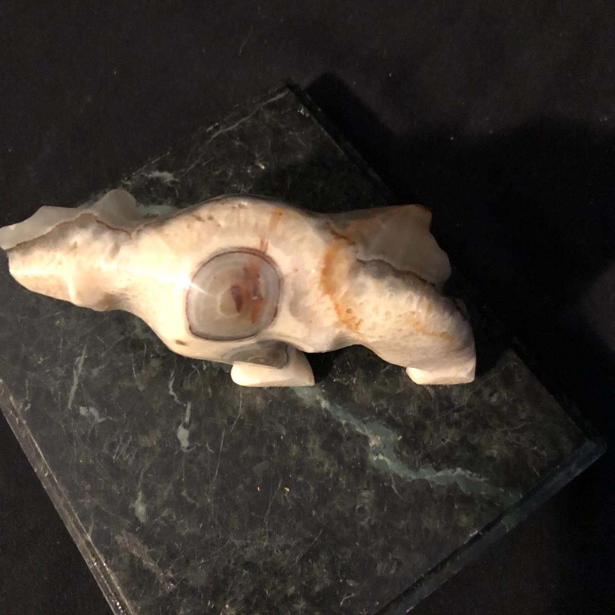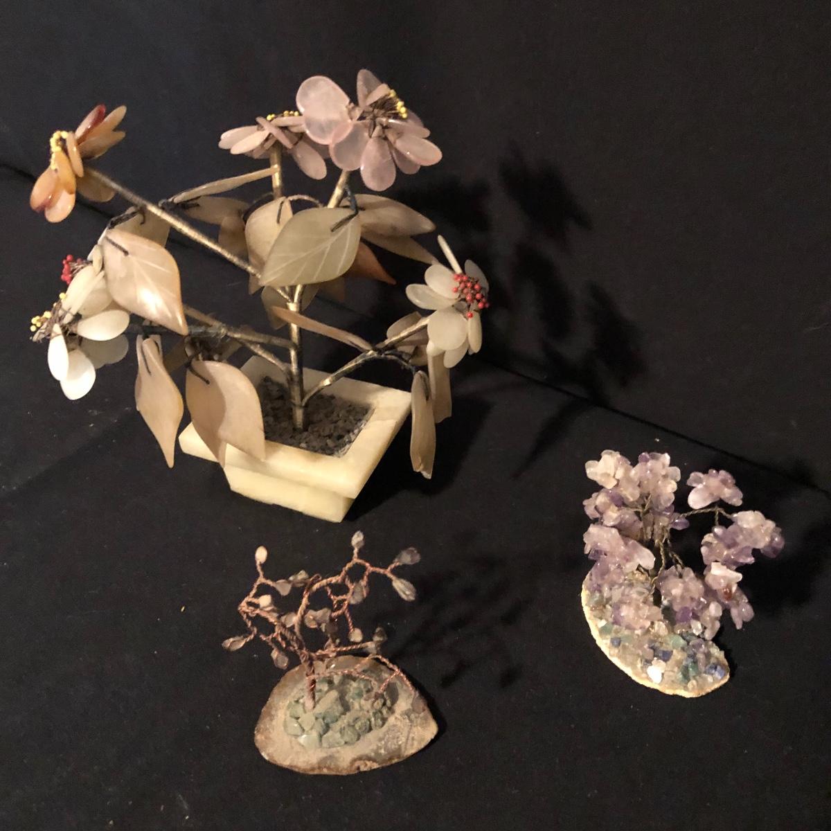 Enjoy the beauty of marble with this lot. It includes three plants, two Aztec style book ends, four figurines and a black marble base. The plants consist of a flower pot that is 6” tall and two trees on stone bases. The leaves or petals on the trees appear to be gems or rocks with stone bases. The pink and white book ends are approximately 4.5” tall. The polar bear appears to have a chip on his face and The squirrel is missing one of its’ front arms. Shipping Available.