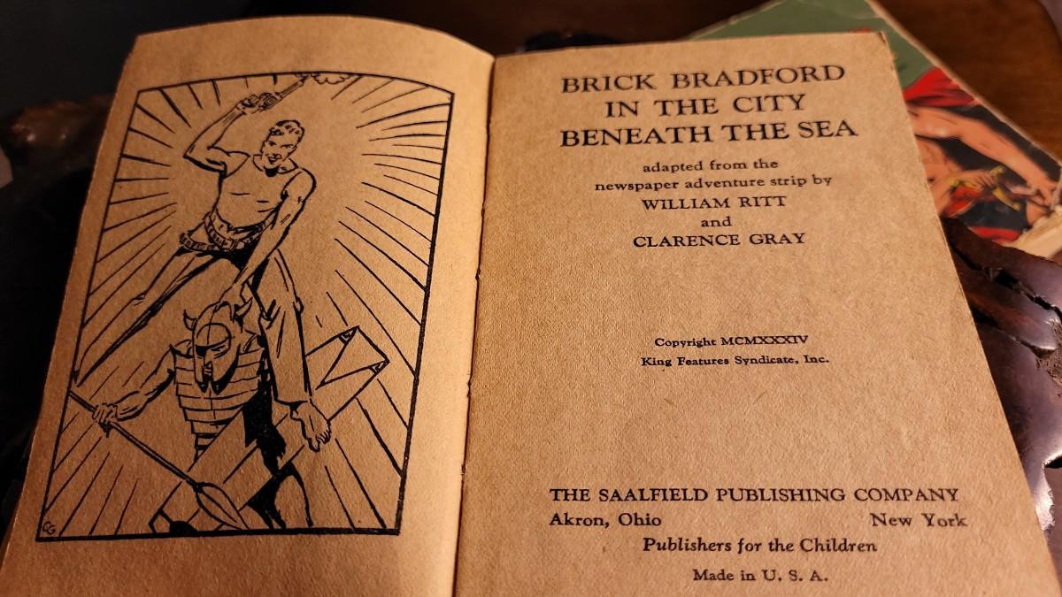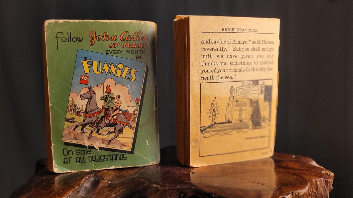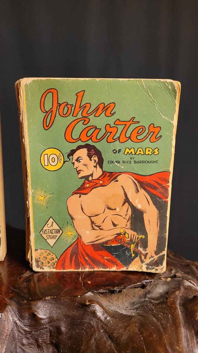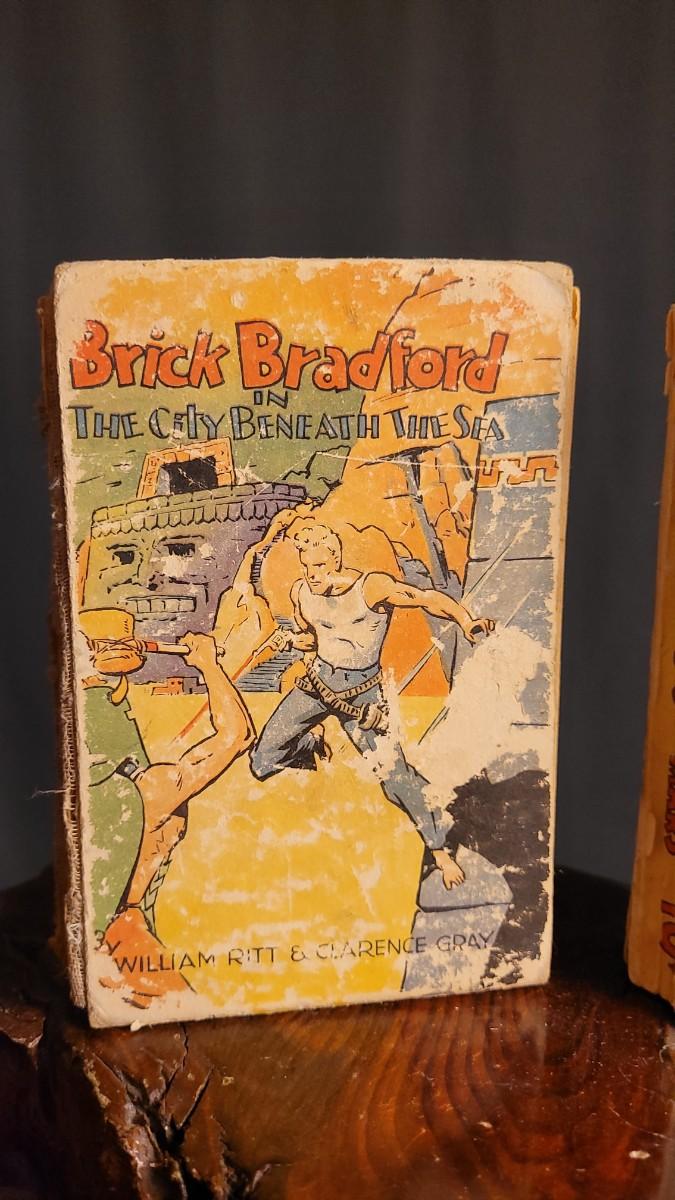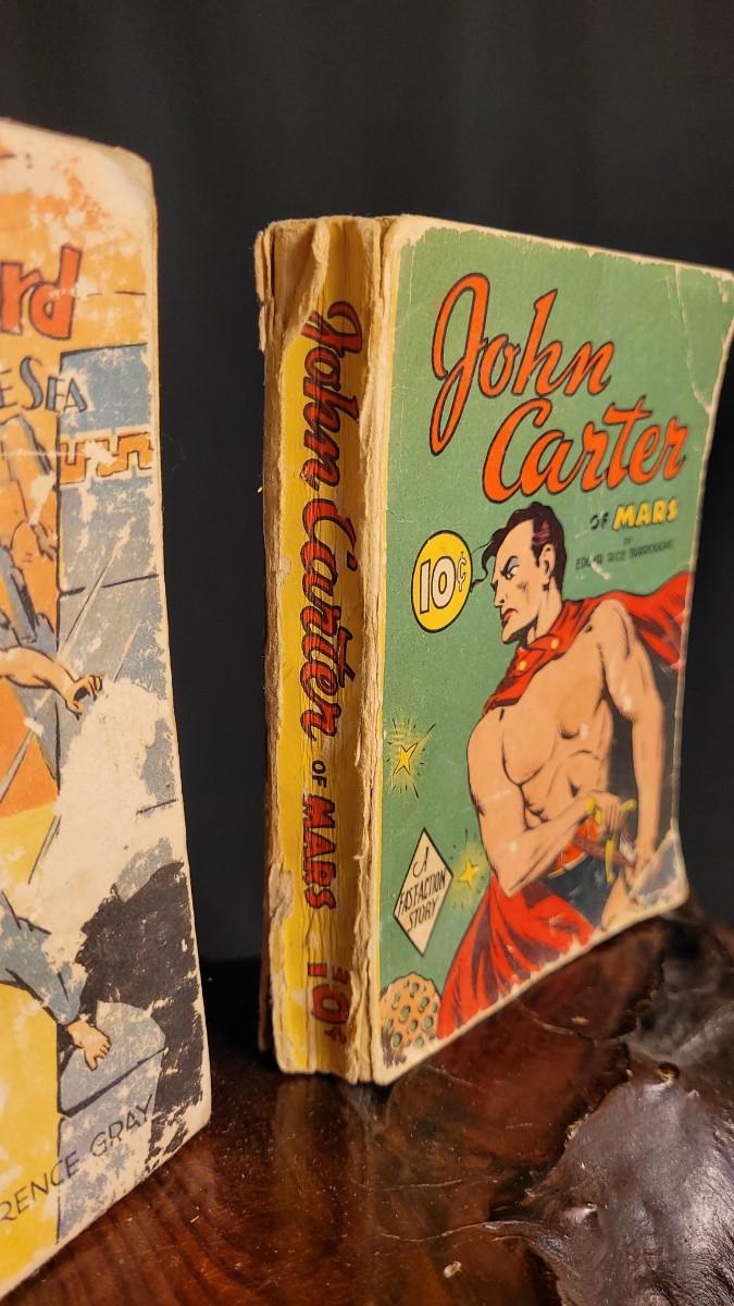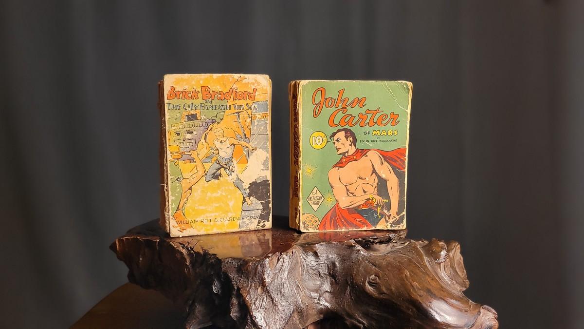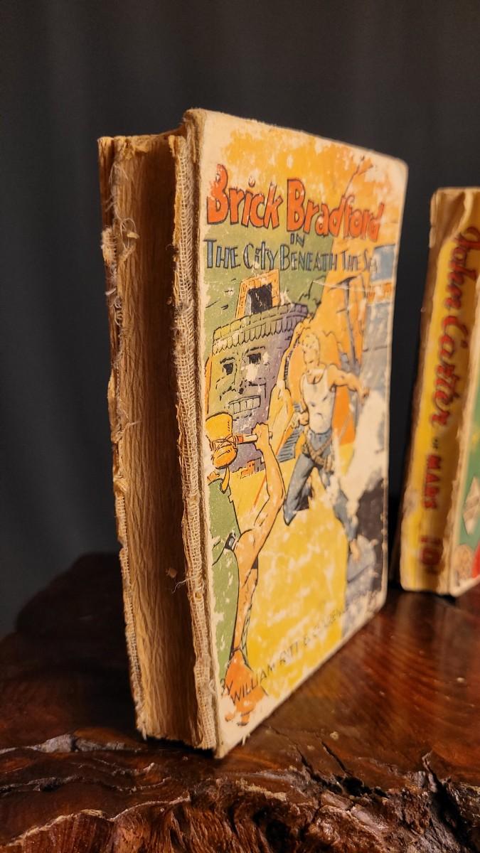 This lot features (2) Vintage Hardback small action stories. JOHN CARTER of Mars from 1940 is in good shape for age. The copy of BRICK BRADFORD is missing spine cover and reverse side of cover - needs some TLC.