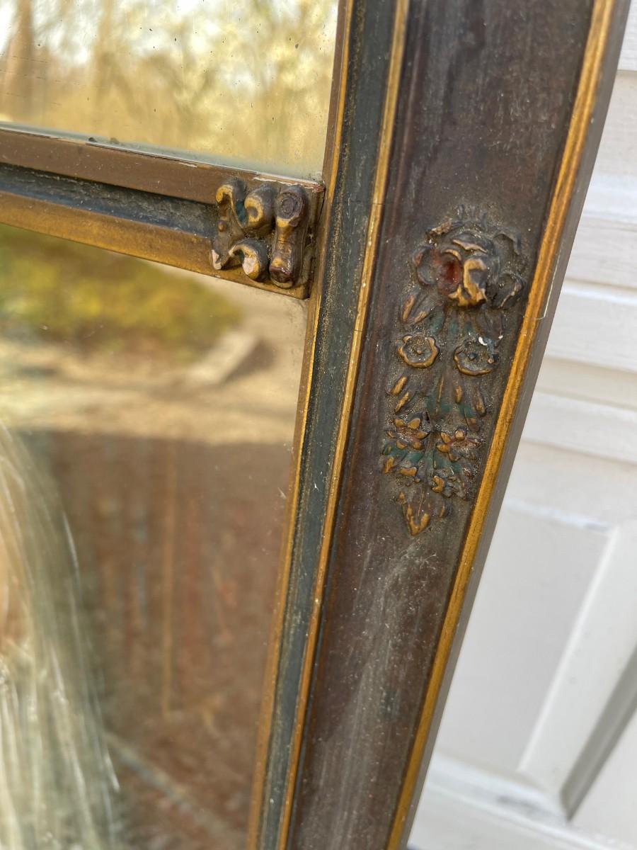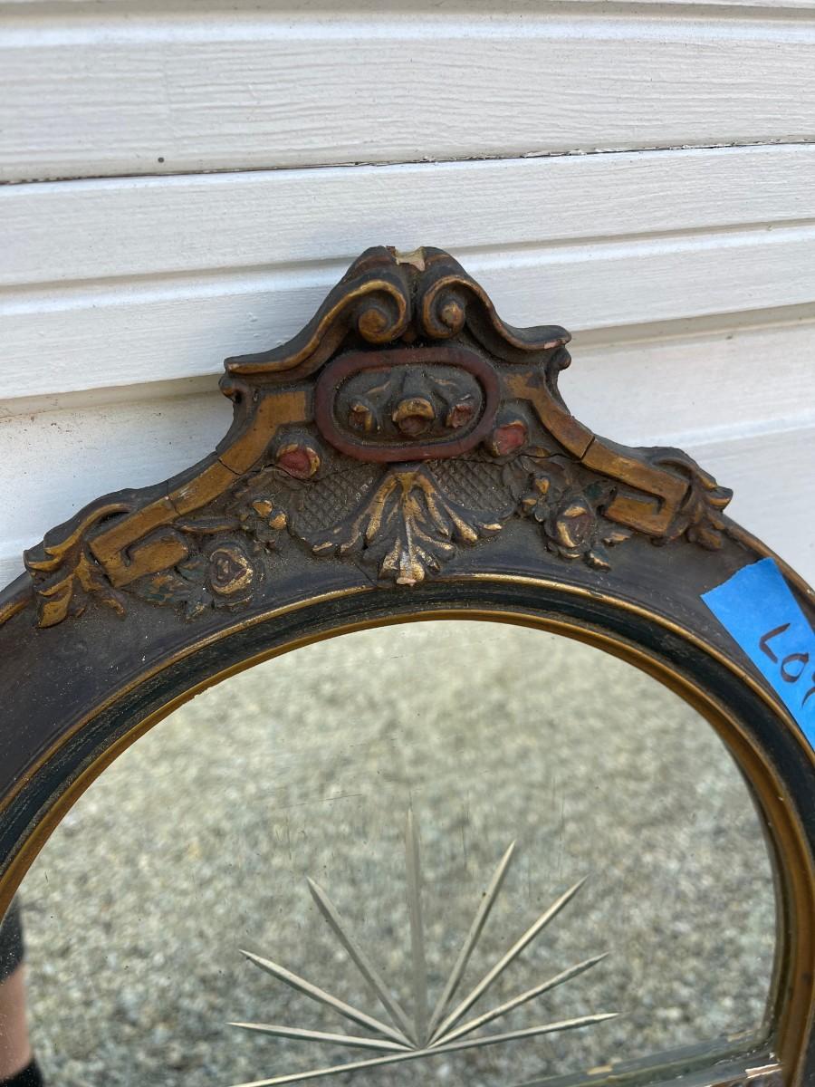 1920's-1930's, beautiful bride, frame in craved wood with half moon mirror with half of a star burst like design etched in.