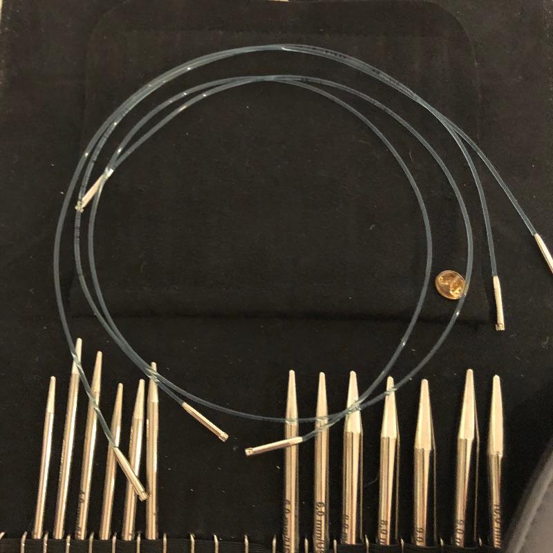 This Addi Click set is almost all there with just a few missing; as you will see from the last image we did find 2 of the 4 missing needles and included them and the project they are attached to. This kit comes with three different lengths of extremely pliable blue cord plus the 4th that is in the yellow wool. The Click tips require no tools to change, simply insert the cord deep into the tip, twist and release. The tips will remain secure until you change them. We have added a bunch of flexible knitting needles still in their original packaging, see images.