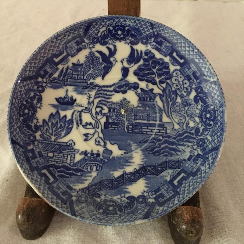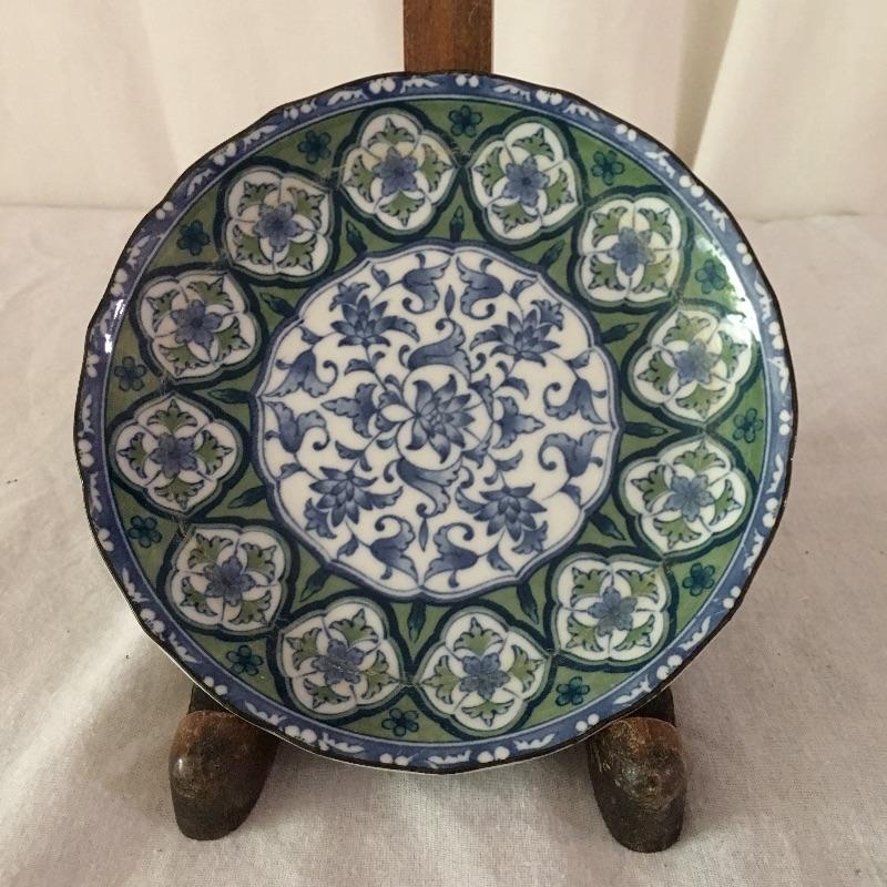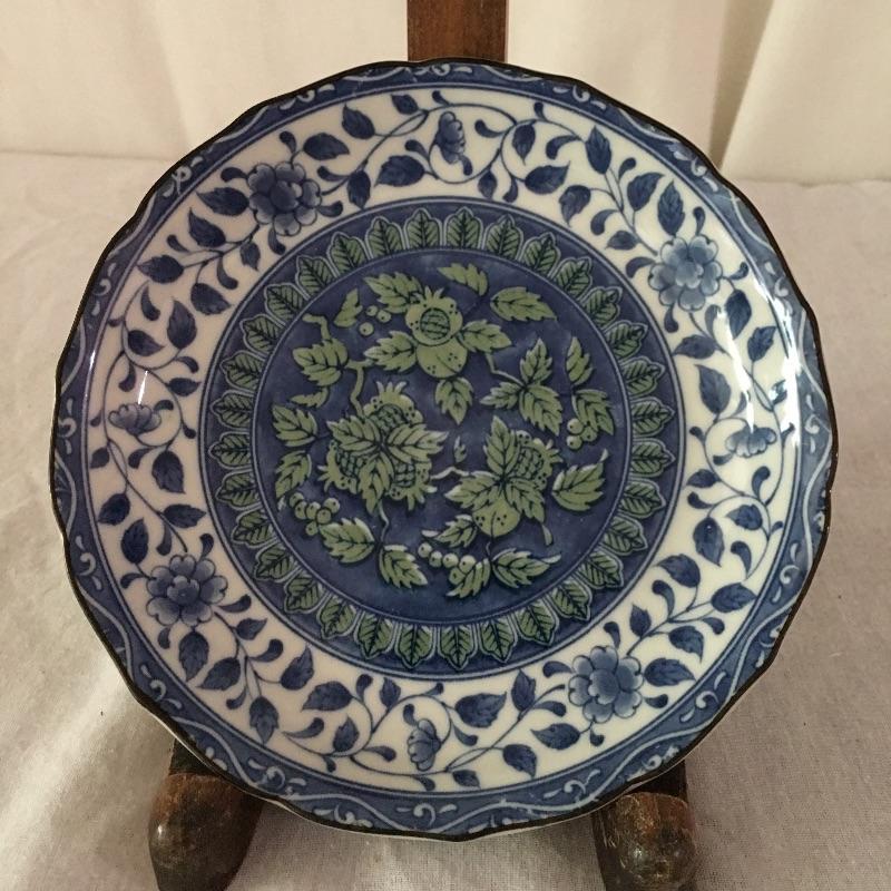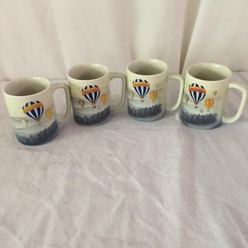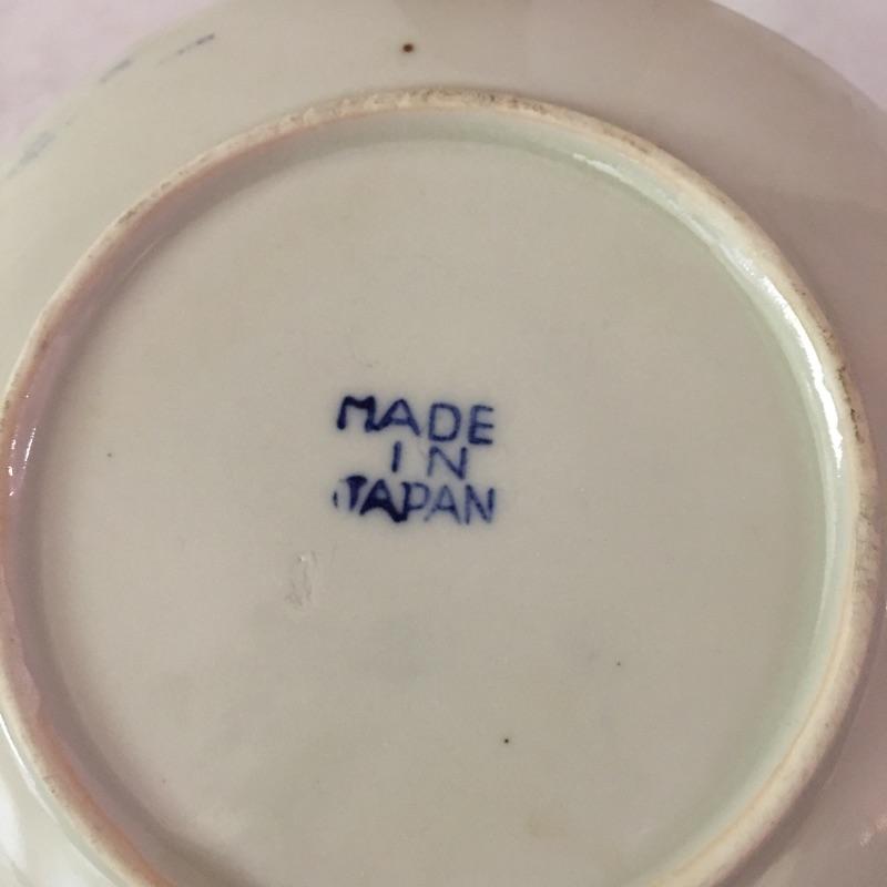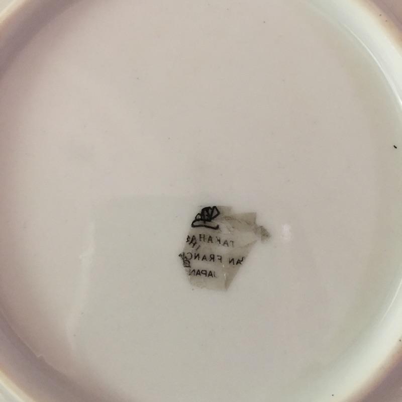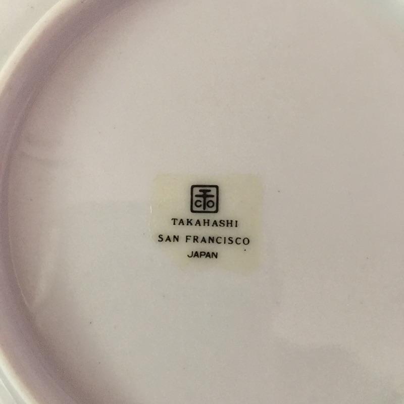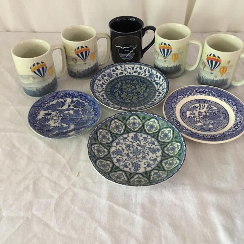 This eclectic mix of plates and mugs includes five coffee cups by Otagiri, two small plates by Takahashi, one plate by Royal China and one marked made in Japan. Largest plate measures 6.5”D.