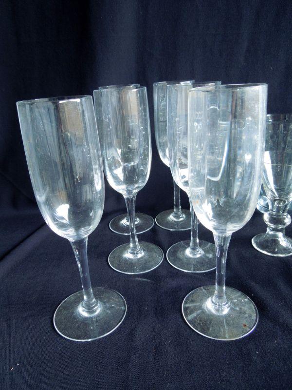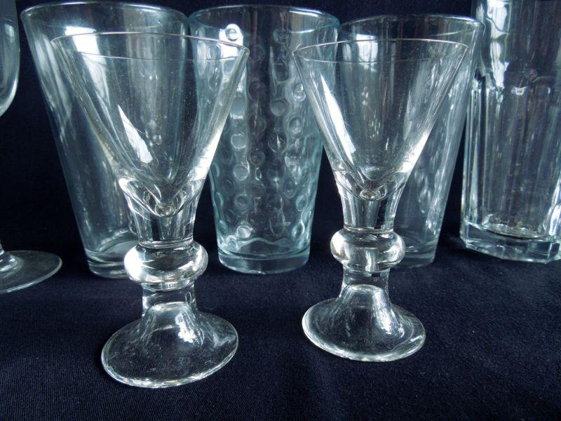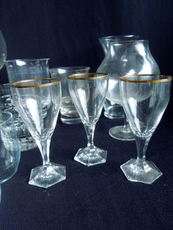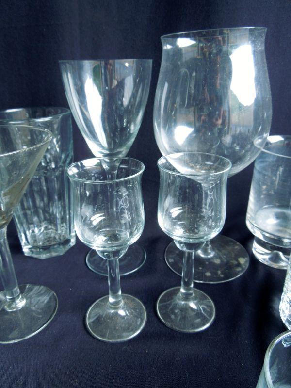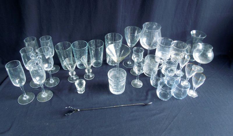 Six matching 8" 10oz. wine glasses; three matching 20 oz. pint glasses; two banded stem apertifs; four rocks glasses; three matching gold rimmed sherry glasses; a brandy snifter;a martini; soda fountain glass; embossed mug; pressed glass tumblers. Many are unmatched. Also an Italian Stag head silver plated long handled stirrer.