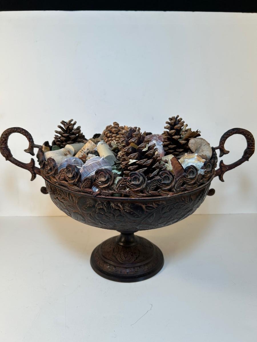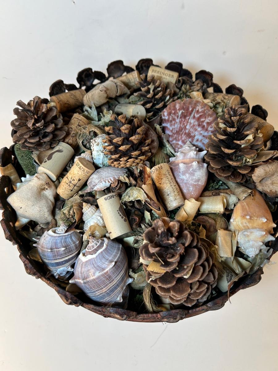 Bowl measures 11"H x 18 1/2"W includes the shells, wine corks and pine cones.