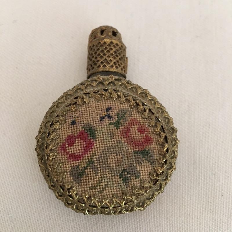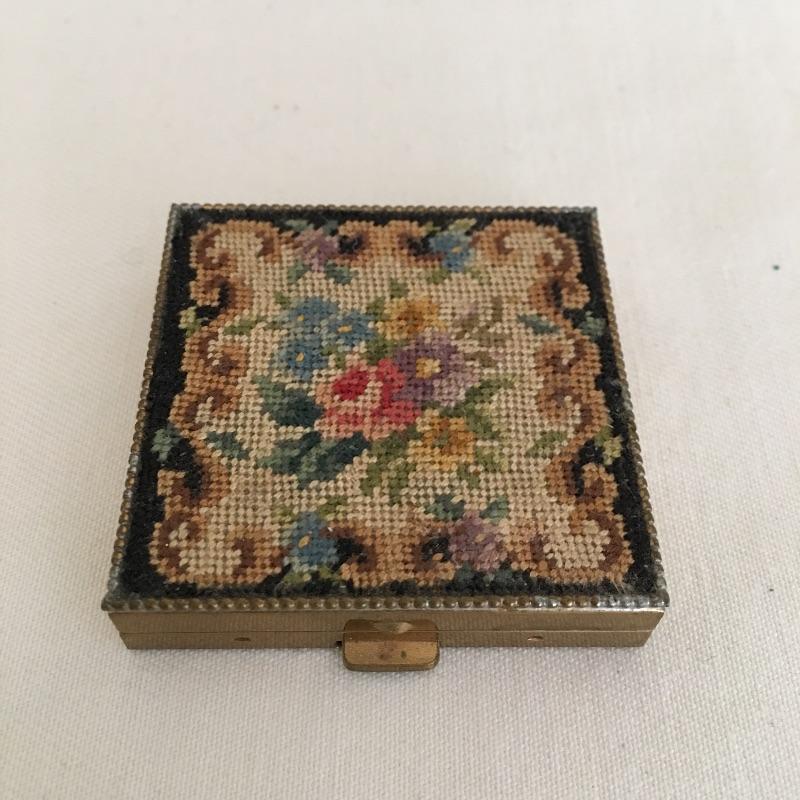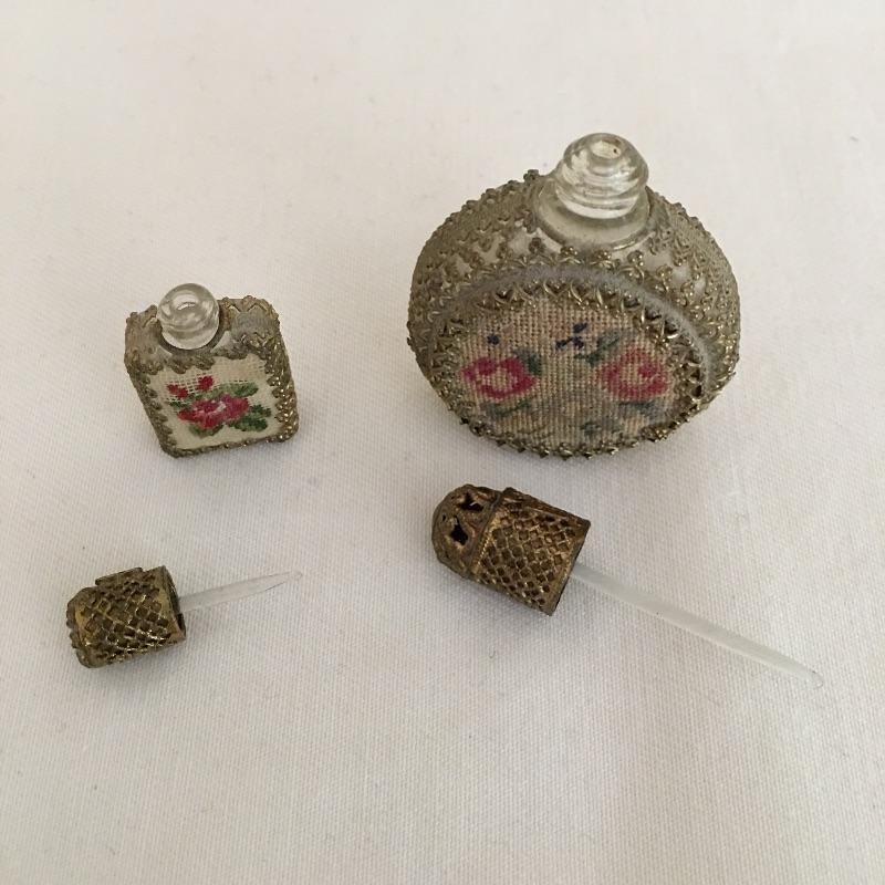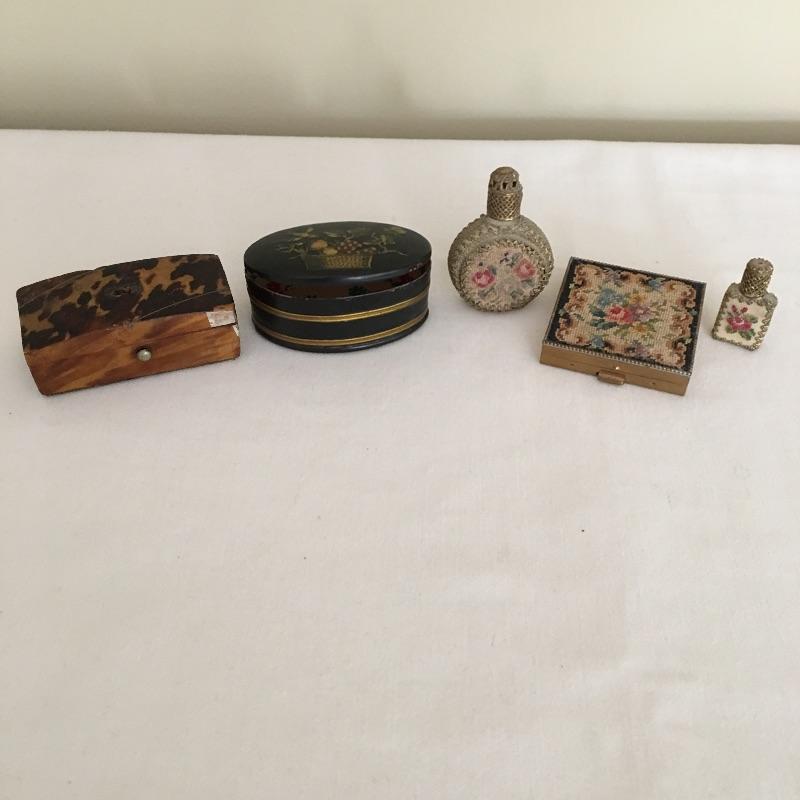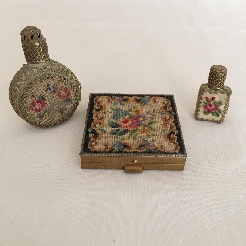 Embroidered metal makeup box with two embroidered perfume bottles with a small wooden box and an metal oval box - see pictures. Embroidered box measures 2” x 2” x .50”.