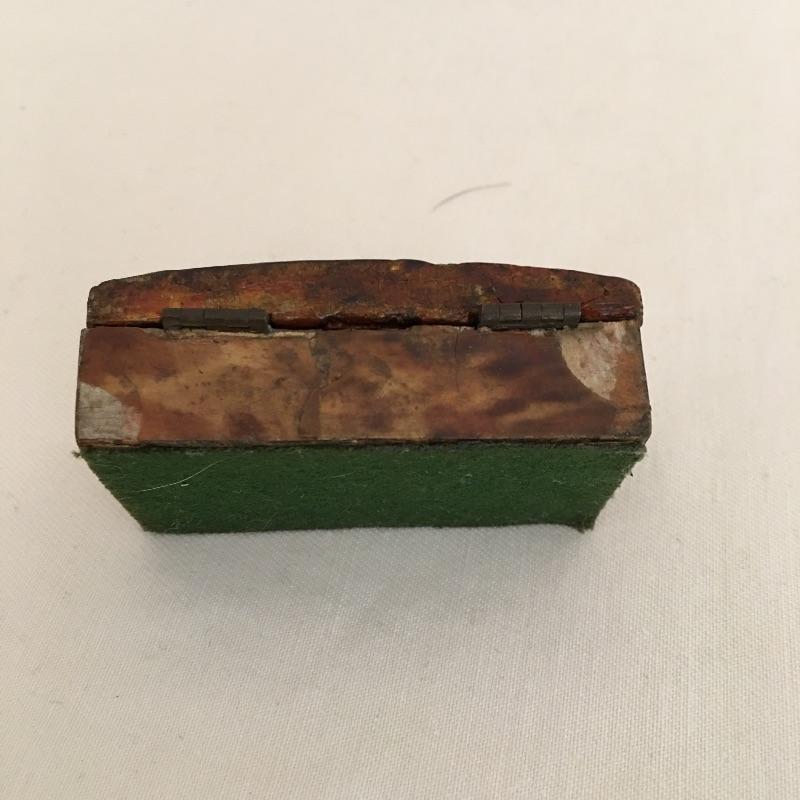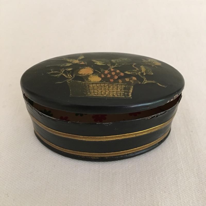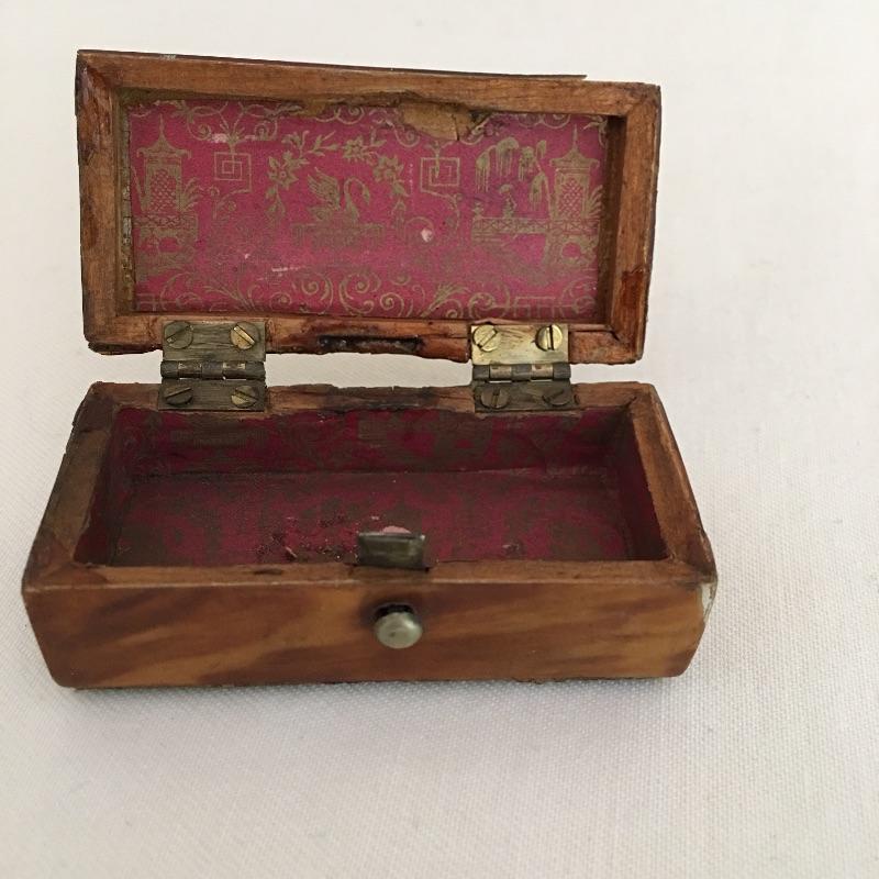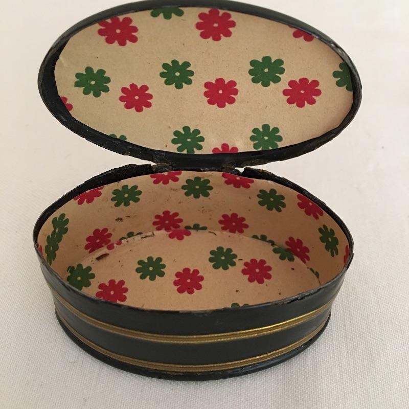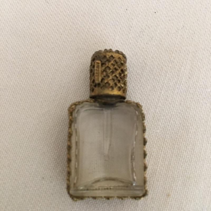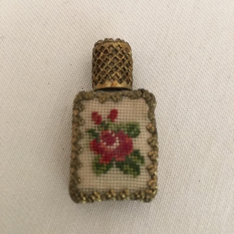 Embroidered metal makeup box with two embroidered perfume bottles with a small wooden box and an metal oval box - see pictures. Embroidered box measures 2” x 2” x .50”.