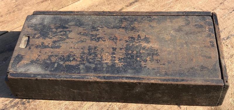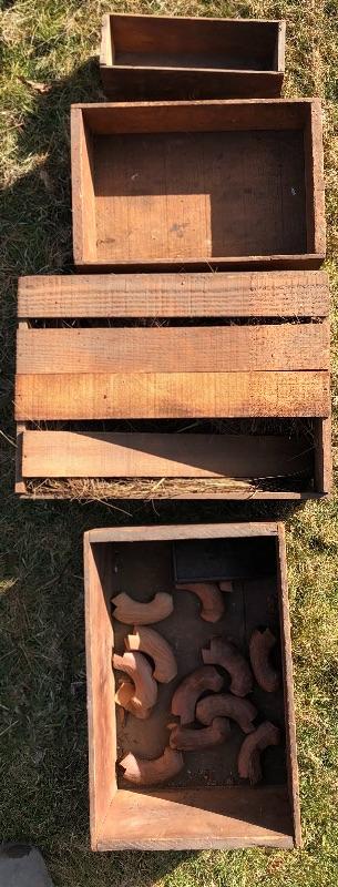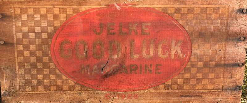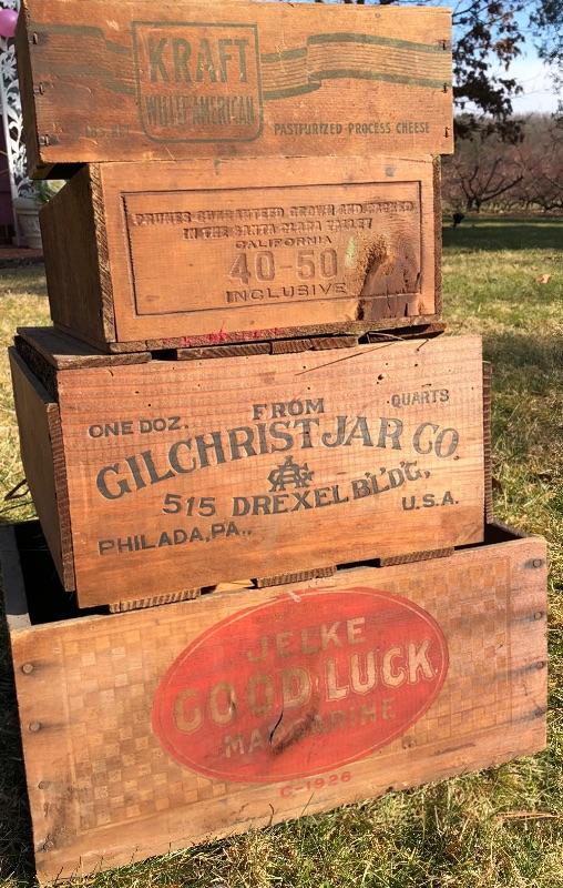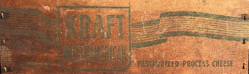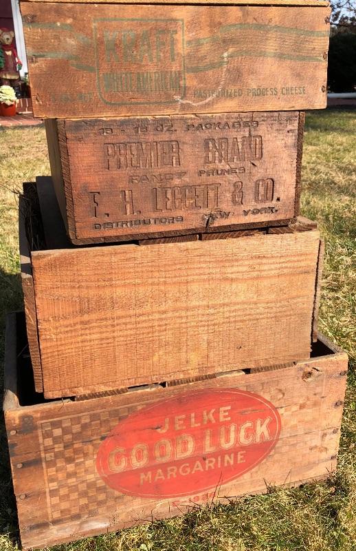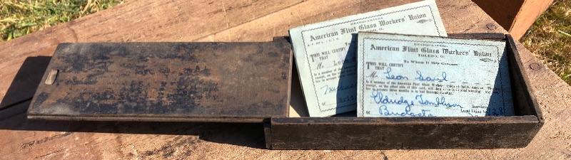4 antique wooden crates, one wooden box and 12 wooden cane handles. Jelly Good Luck Margarine box 17” L x 11” W x 7-1/2” H. Gilchrist Jar Co. box 18” L x 13” W x 7” H. Premier Brand Fancy Prunes F.H. Leggett & Co. box 15-1/2” L x 10” W x 5” H. Kraft White American cheese box 11-1/2” L x 3-3/4” W x 4” H. Small wooden box with sliding lid 6-1/2” L x 3” W x 1-1/8” W. Multiple American Flint Glass Workers Union Certificates inside. 12 custom wooden cane handles 4” L x 1” W x 2” H.
