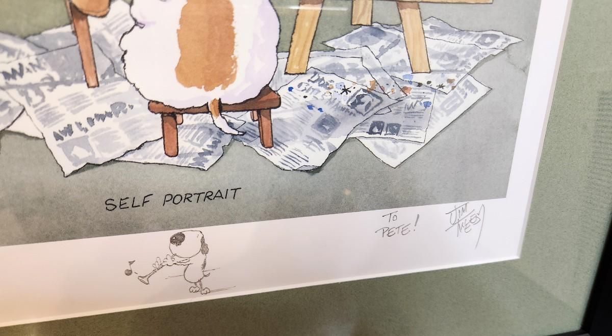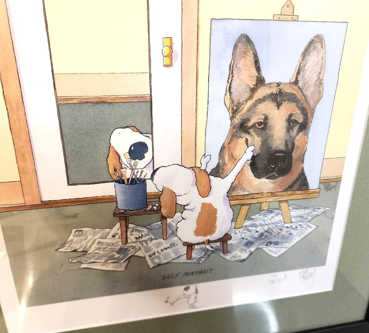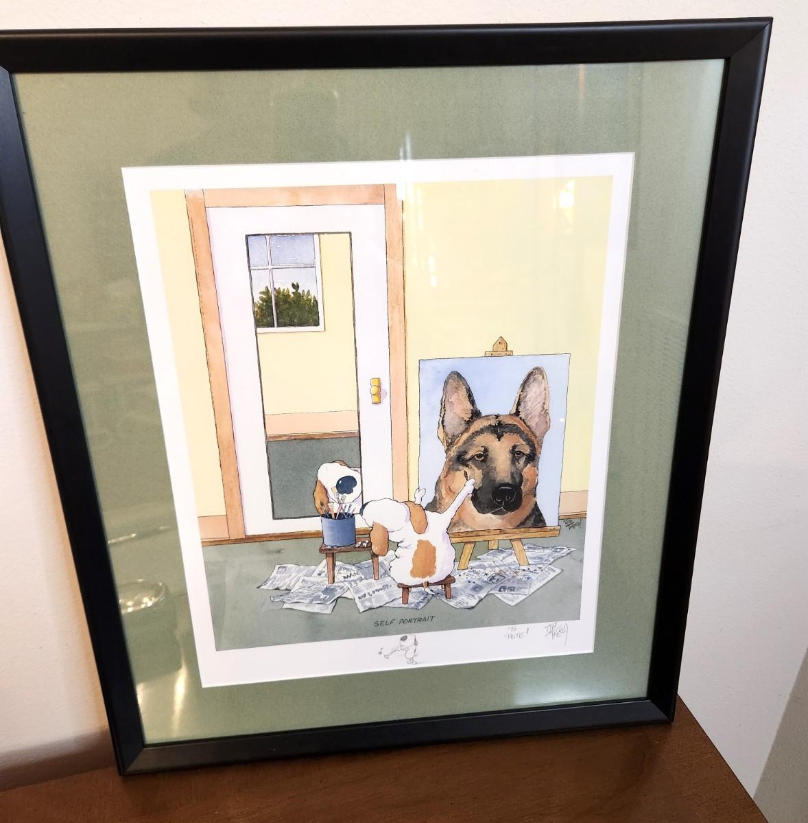A real cutie that reveals how every dog feels about himself - "Self Portrait" print by Jim Tweedy - a takeoff on the famous Norman Rockwell painting - Inscribed to Pete with a cute extra hand drawn doodle in the margin. 21" x 18" - framed.
