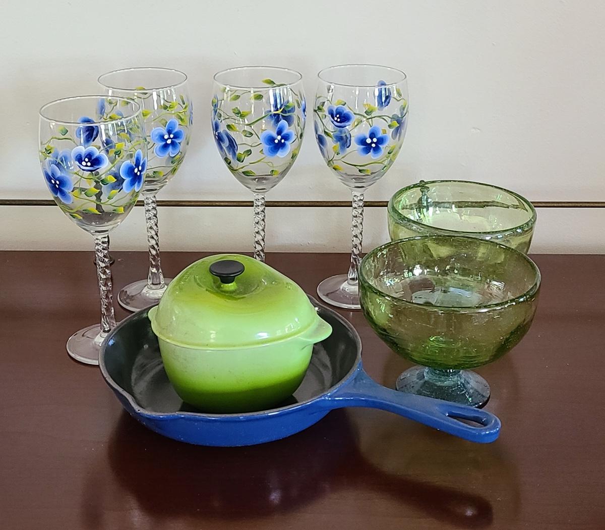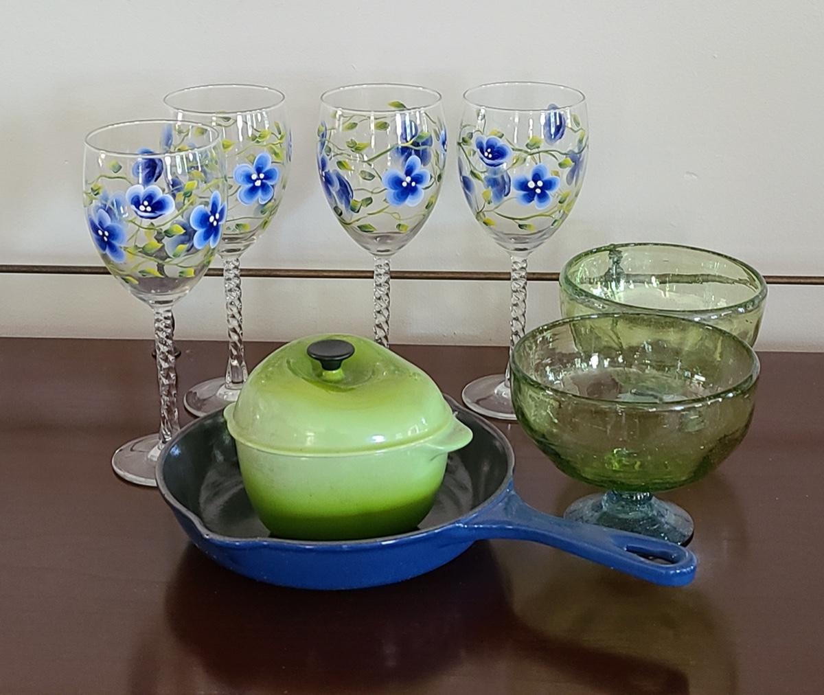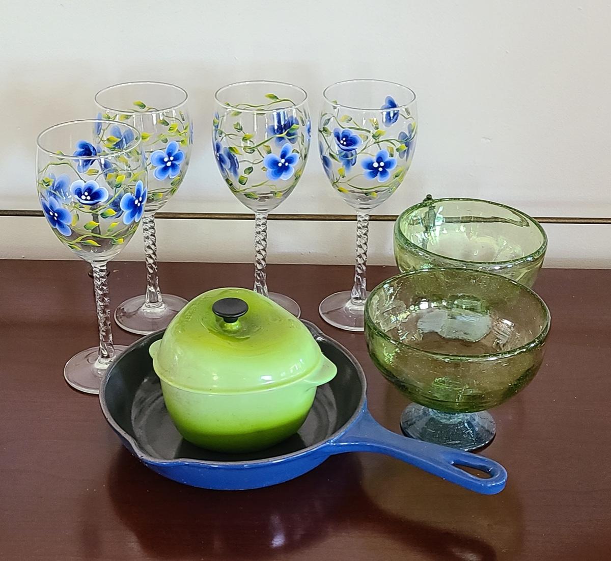 Handpainted wine glasses, handblown dessert bowls, and La Creuset small, covered baking dish and frying pan. Please see all pictures as they are the best representation of the items. The pictures show condition, measurements if taken, and what is included in the lot. Due to the large amount that we photograph and the time frame, we are not always able to take measurements. All items unless noted, are pre-owned and have been used. If you purchased furniture, you must bring help. We do not allow one person to carry large furniture out on their own. Bring help, tools and a truck for the safety of our client’s homes, and your personal safety. Company policy. Thank you.