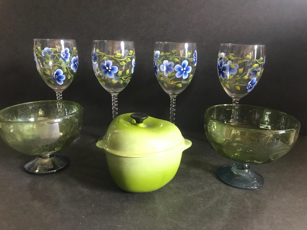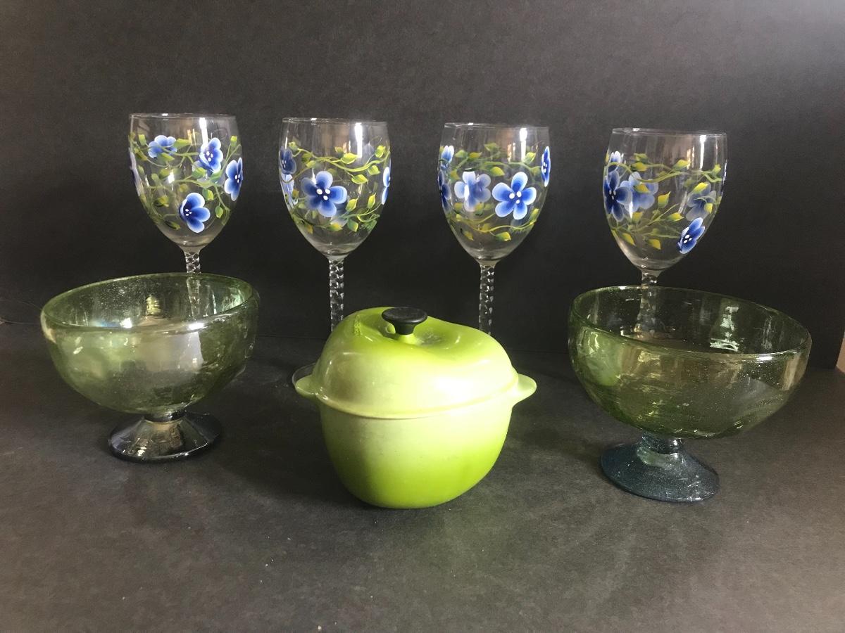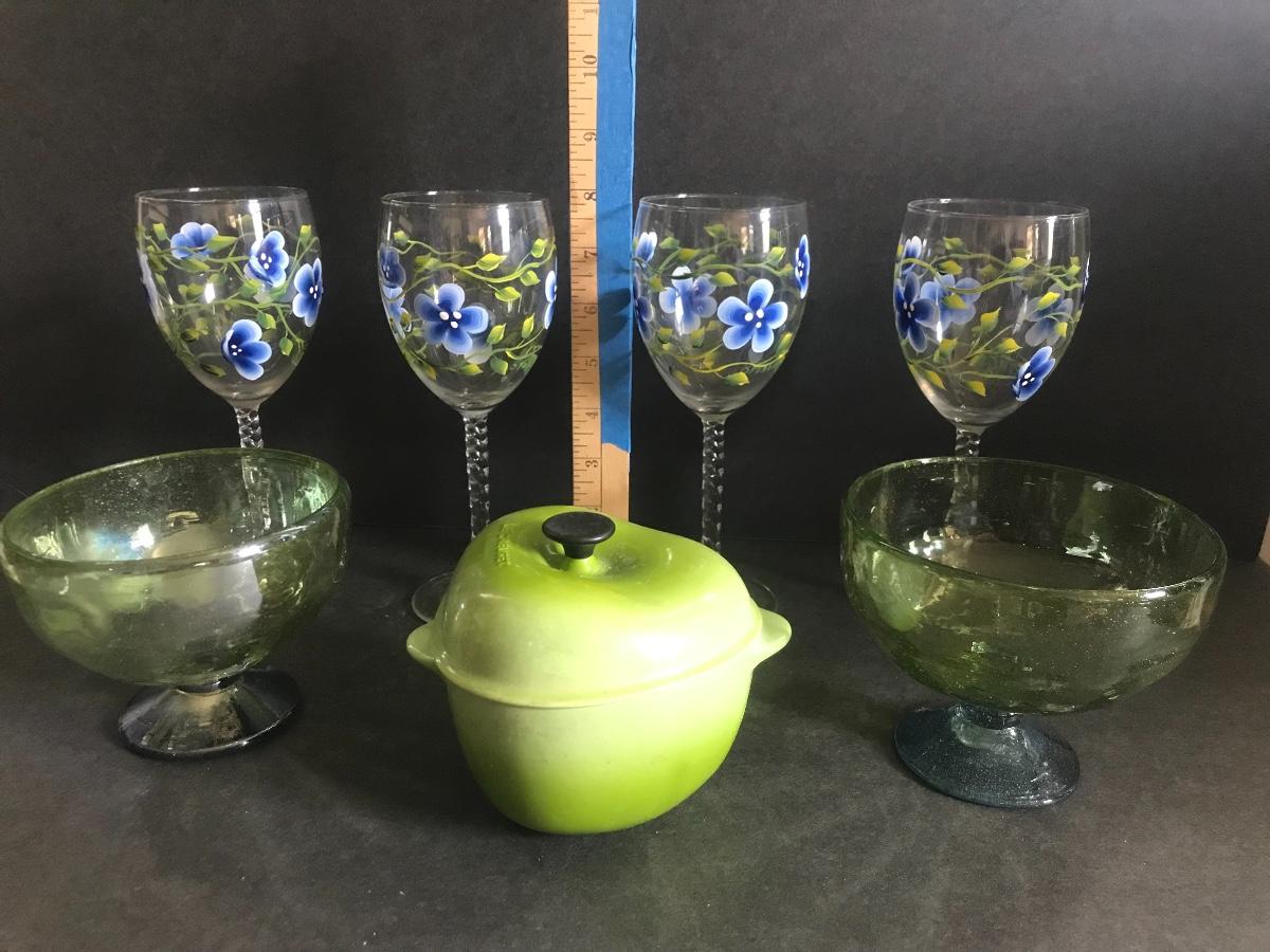 Handpainted wine glasses, handblown dessert bowls, and La Creuset small, covered baking dish and frying pan. Please see all pictures as they are the best representation of the items. The pictures show condition, measurements if taken, and what is included in the lot. Due to the large amount that we photograph and the time frame, we are not always able to take measurements. All items unless noted, are pre-owned and have been used. If you purchased furniture, you must bring help. We do not allow one person to carry large furniture out on their own. Bring help, tools and a truck for the safety of our client’s homes, and your personal safety. Company policy. Thank you.