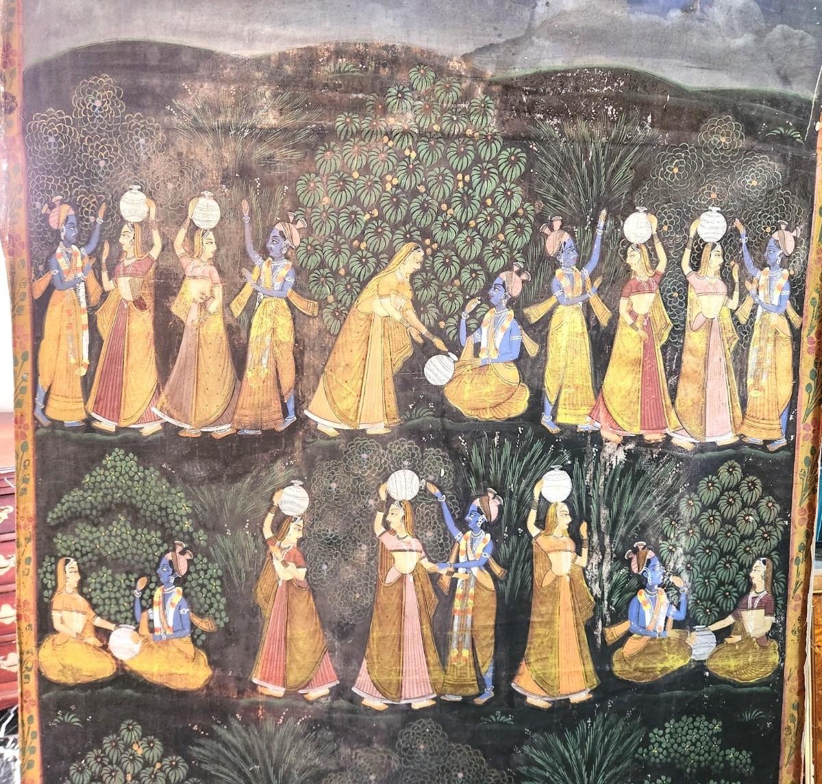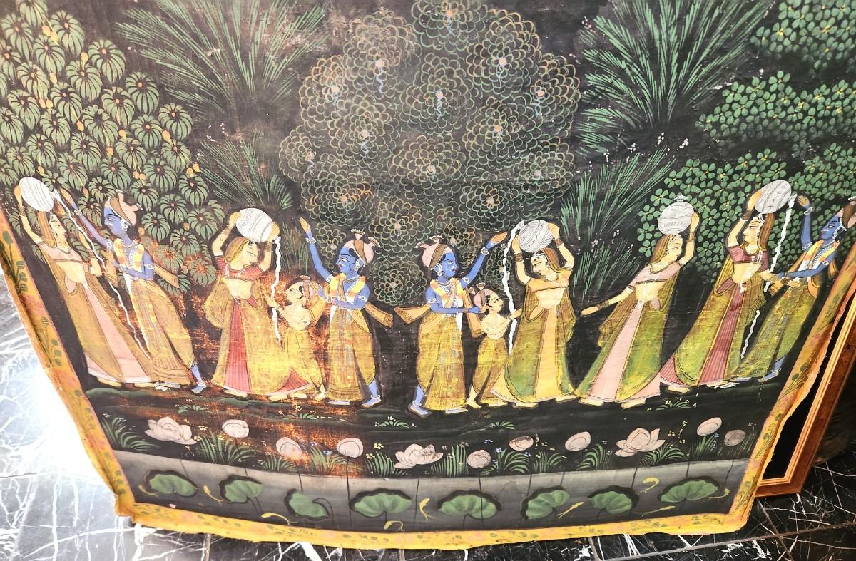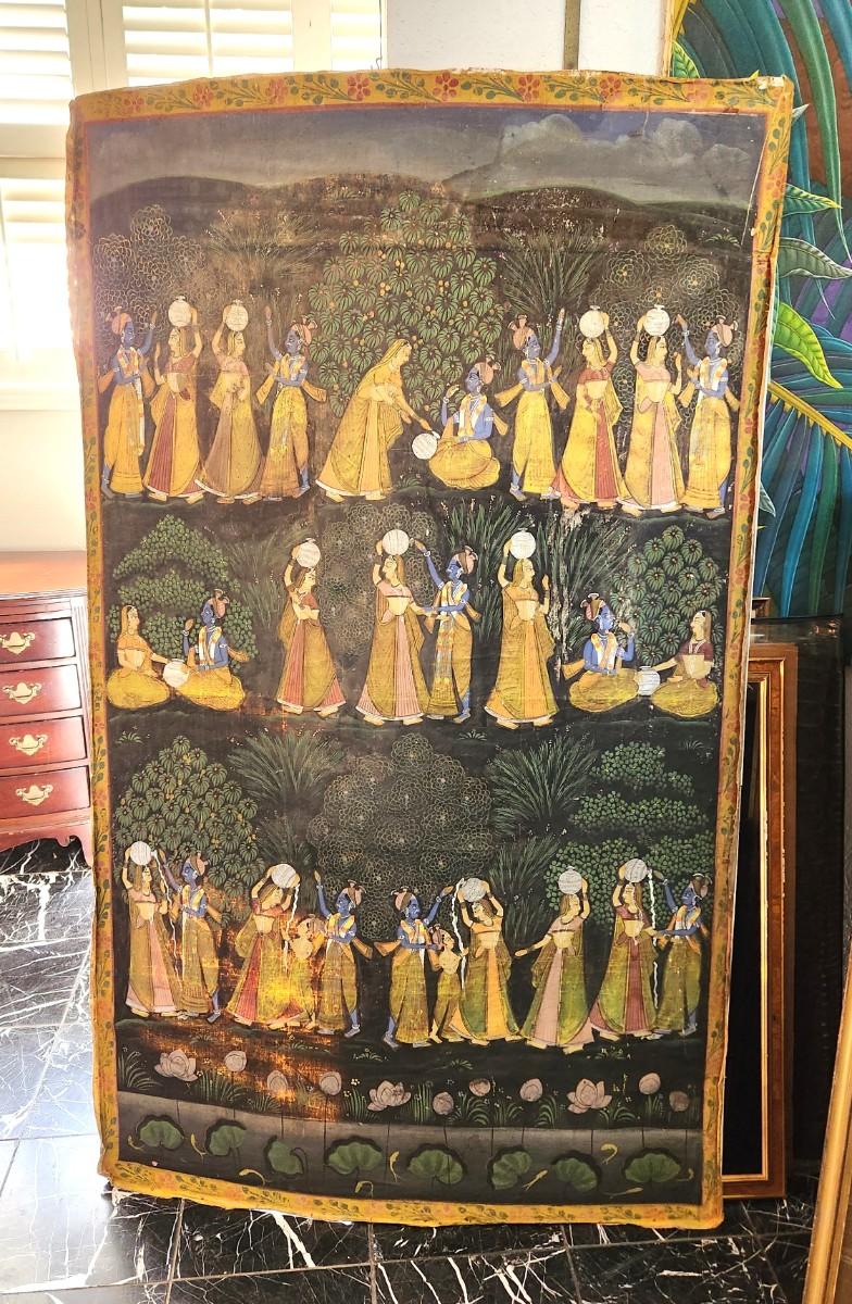 This large Indian cotton cloth from the Jaipur School features KRISHNA (blue figure). Late 19th, early 20th century. 69" tall, 41.5" across. Depicts the dearest of KRISNA'S consorts and his constant companion Radha the milkmaid. This would be quite striking if it were framed. Attic find - note there is some discoloration at the top of the back of the foam core. Does not affect the fabric.