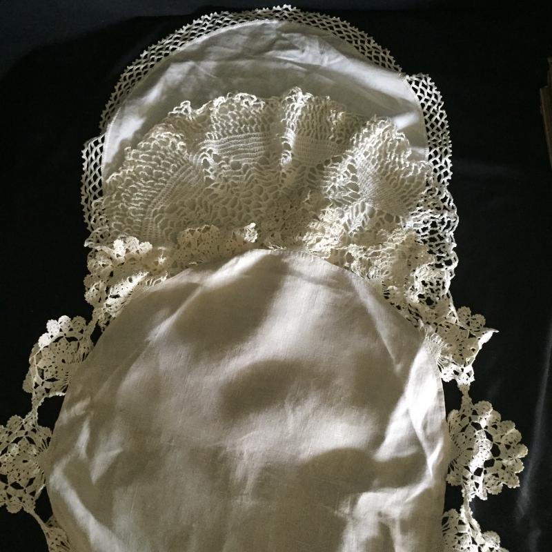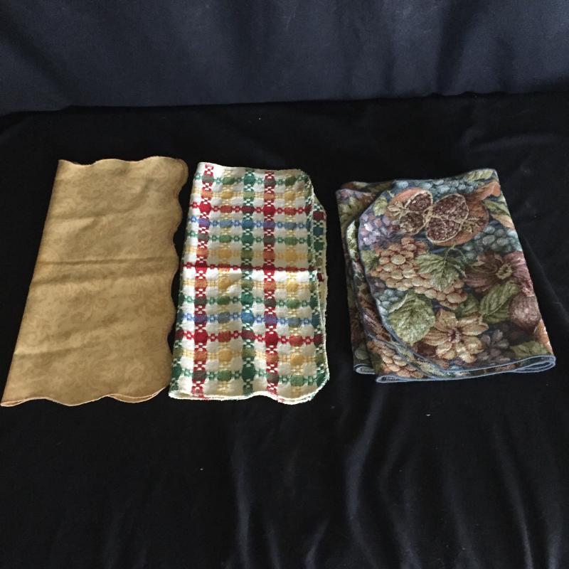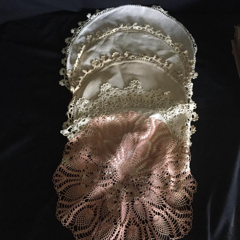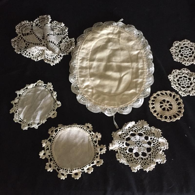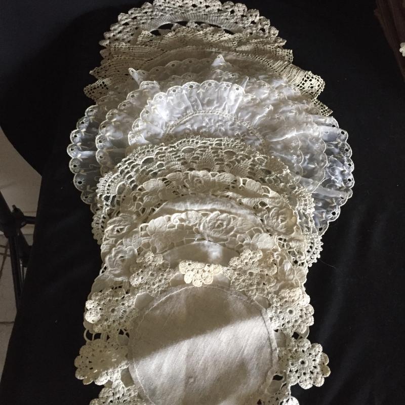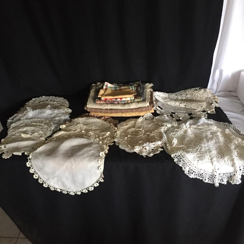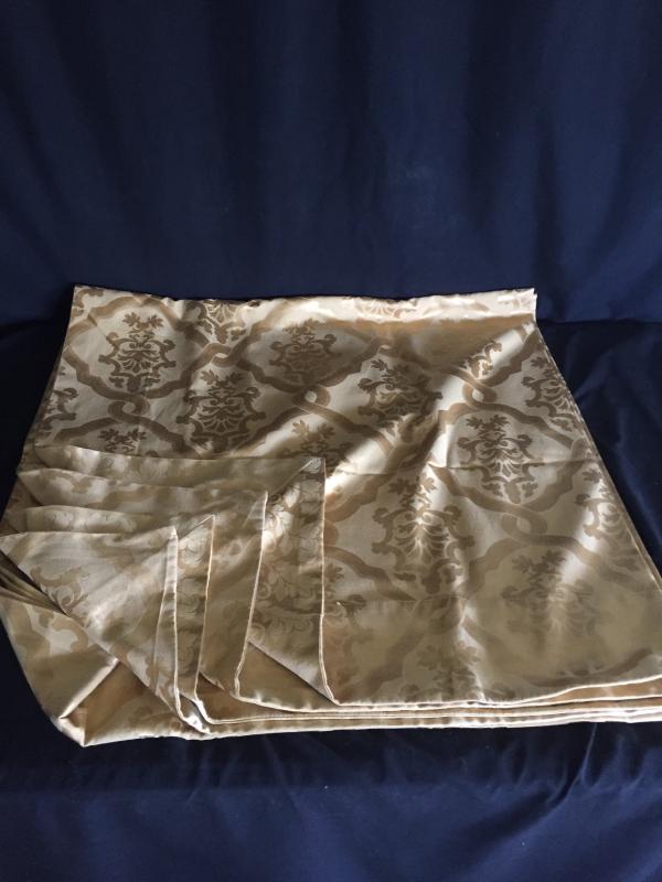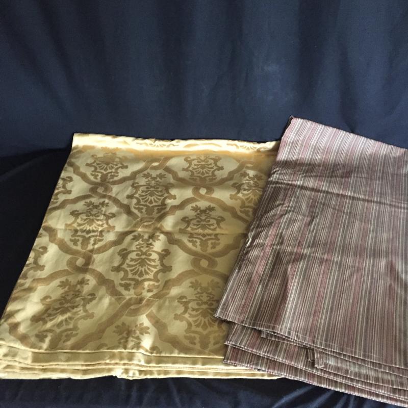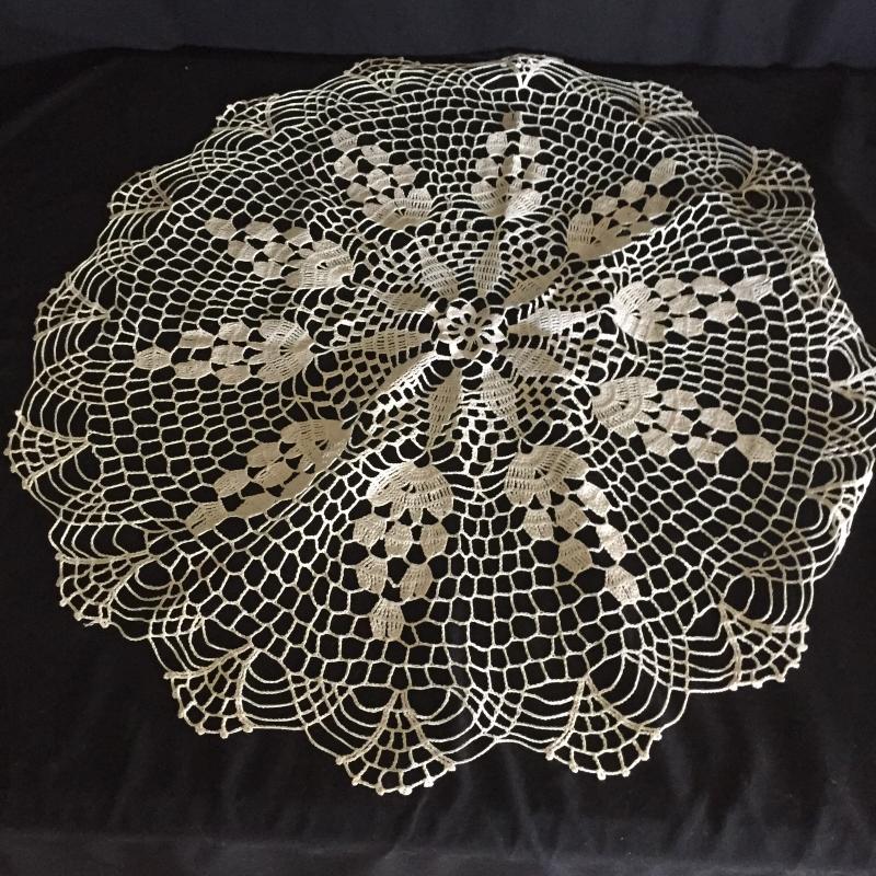 Largest Doily Measures 27” D Gold Tablecloth Measures 96” x 57.5”.
