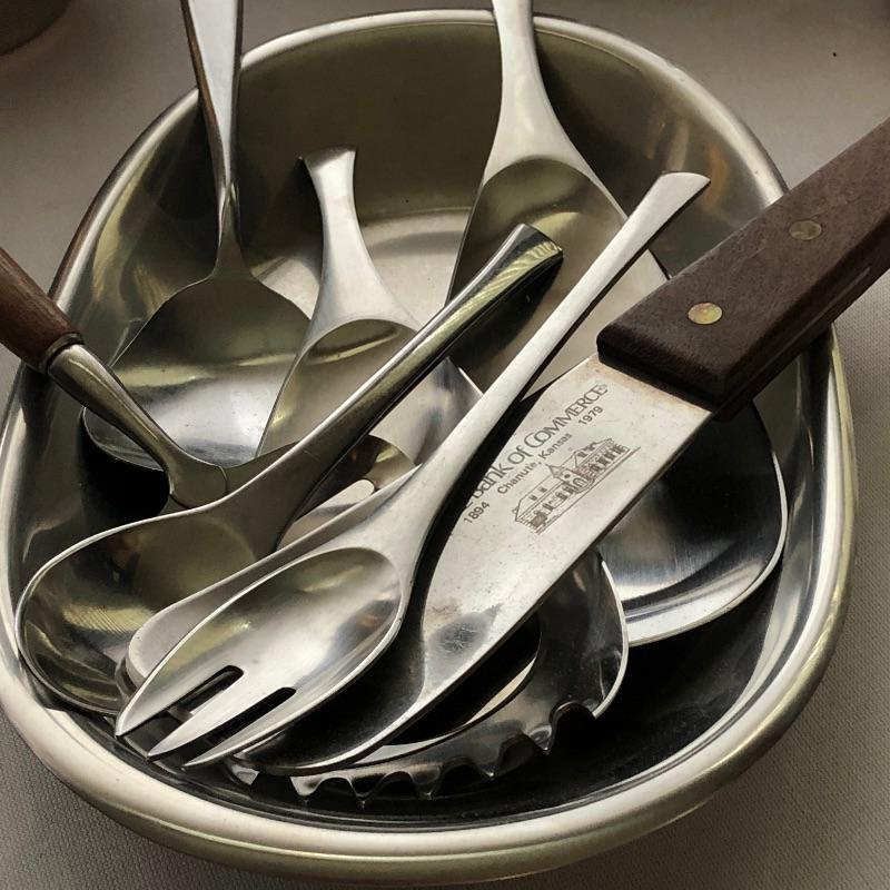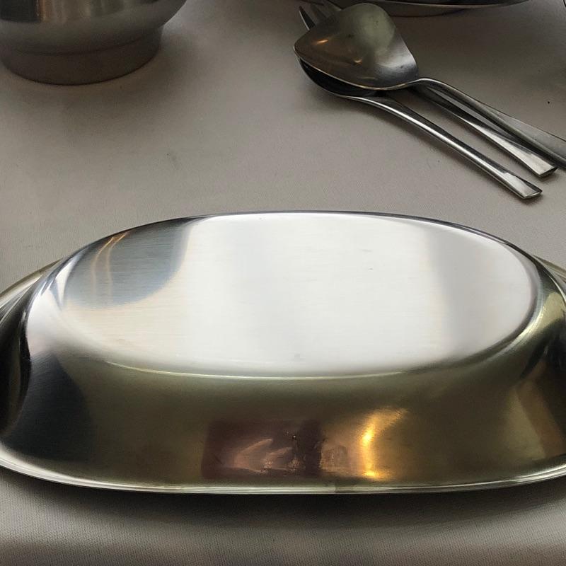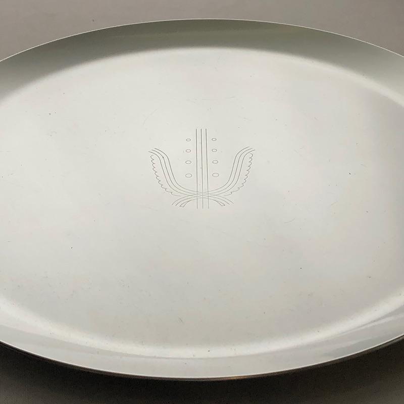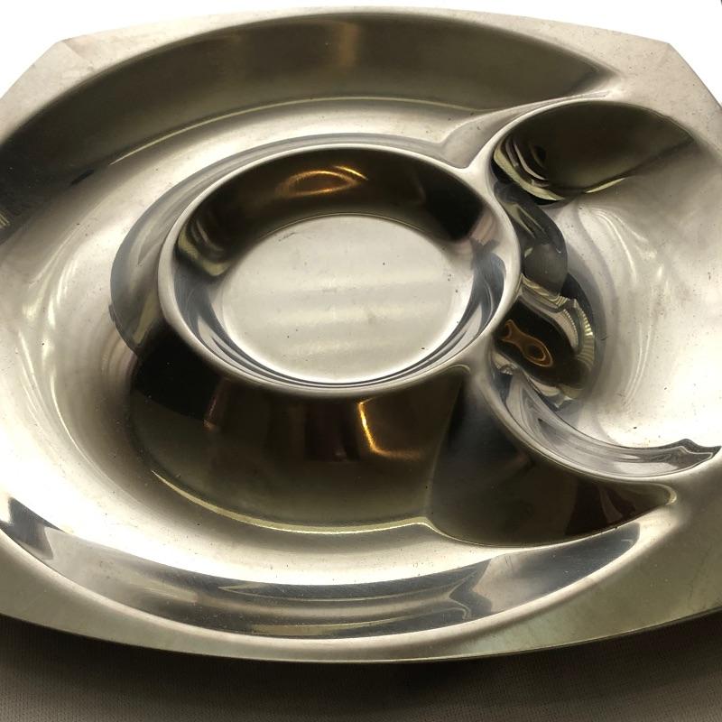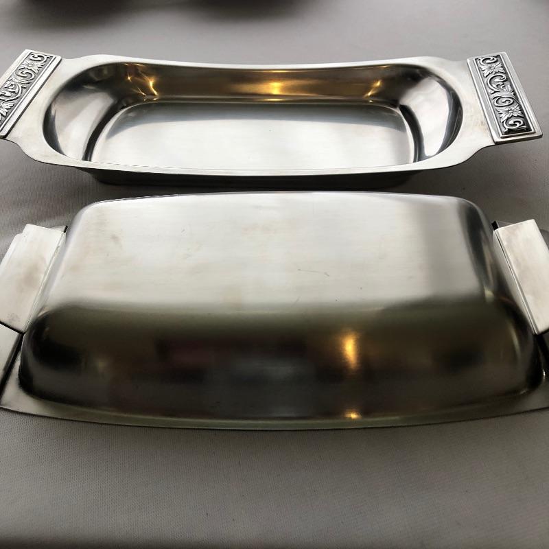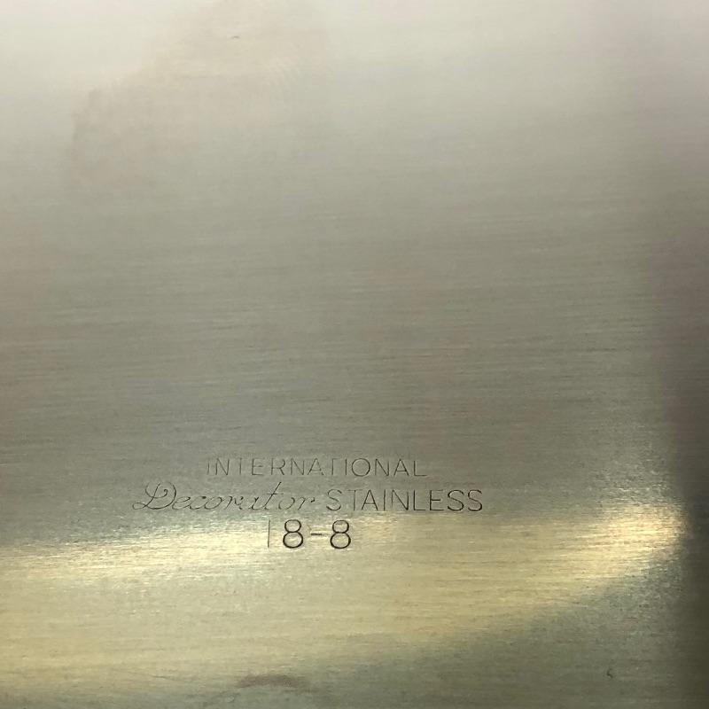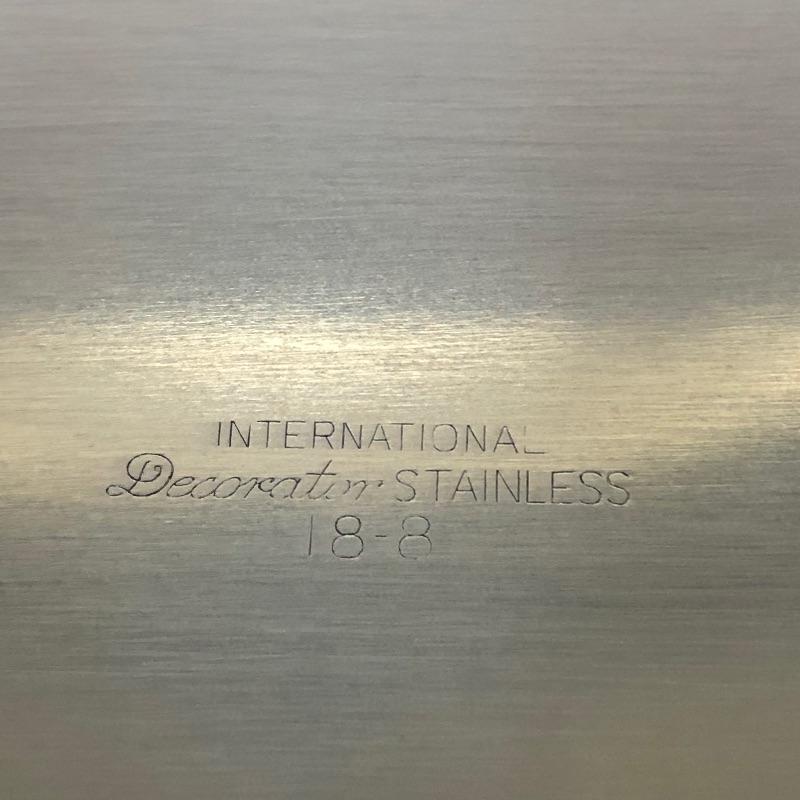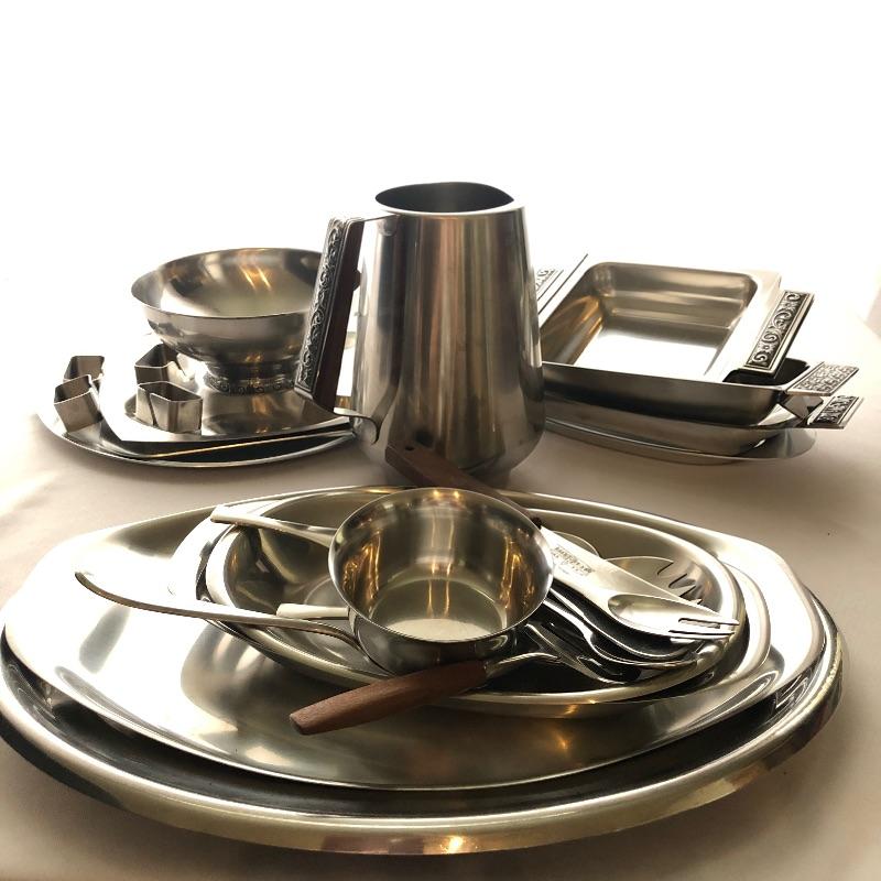 Super cool set of mid century modern stainless service ware, much of which is International Decorator and Danskas well as Swedish and German designs. Carafe does not have a lid see photos. Oval platter measures 12” x 17”. Shipping available.