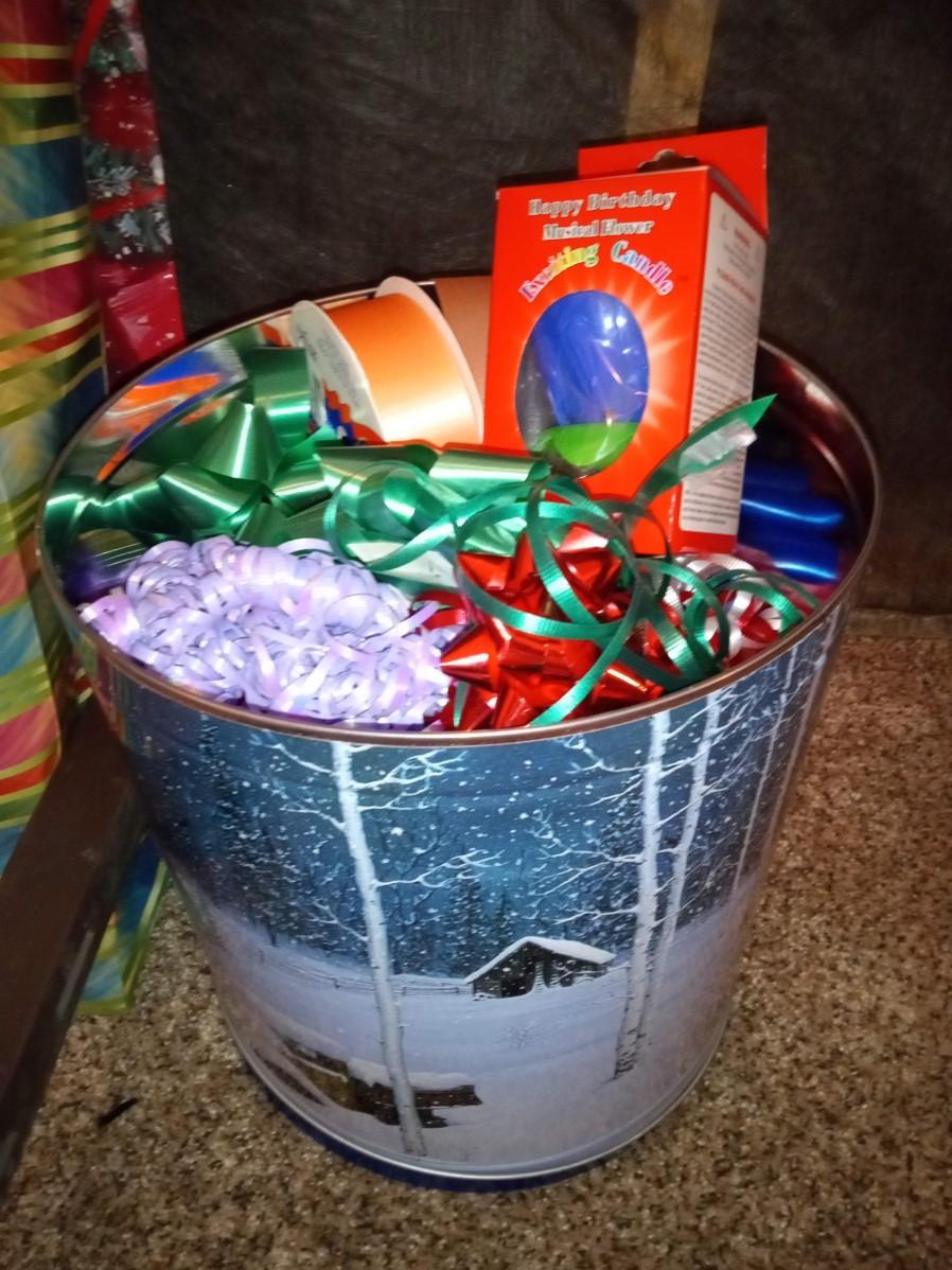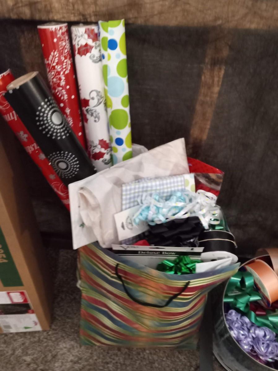LOT 154 NEW 3' TREE, GIFT WRAP, BOWS AND SERVING DISHES