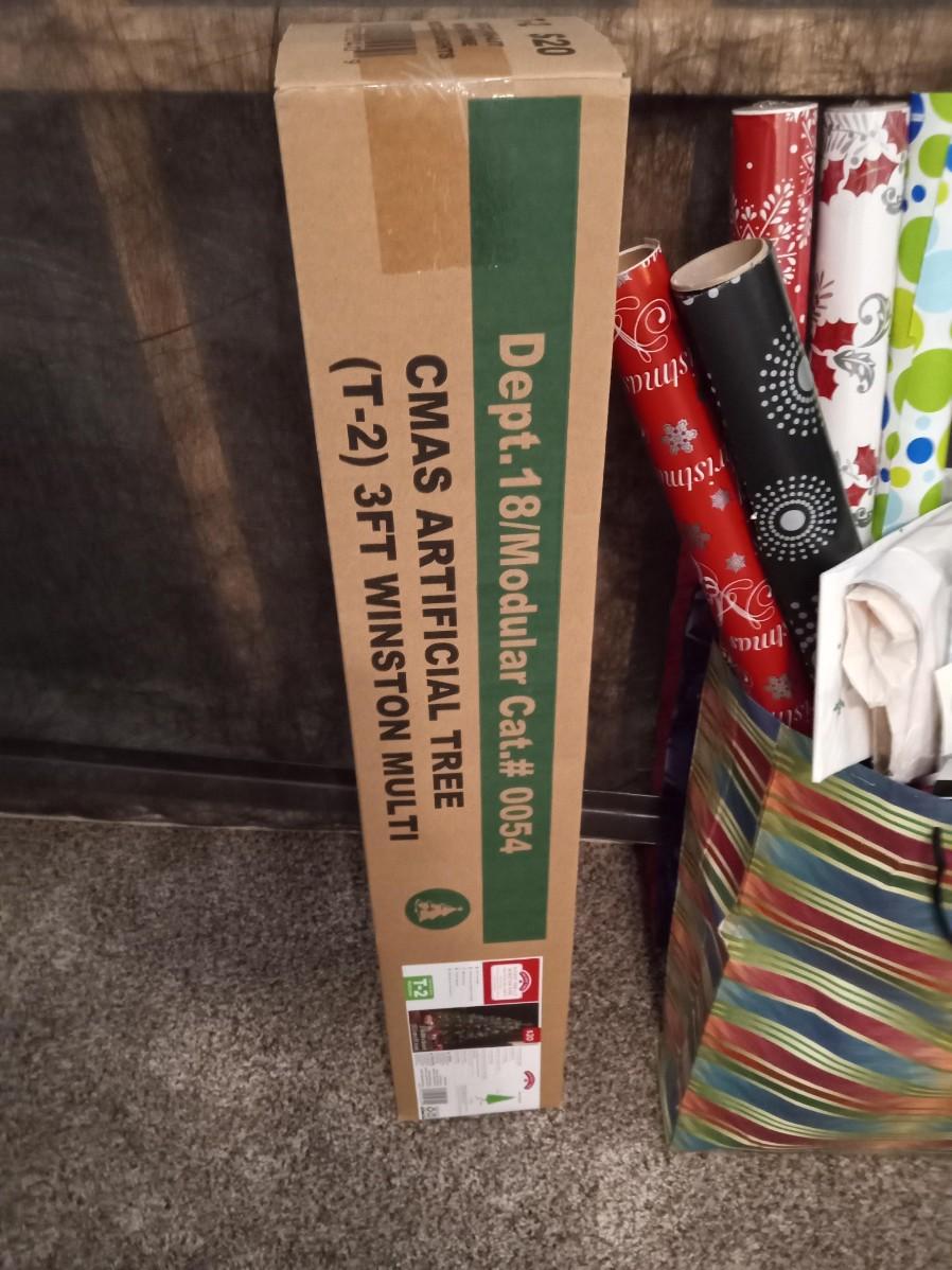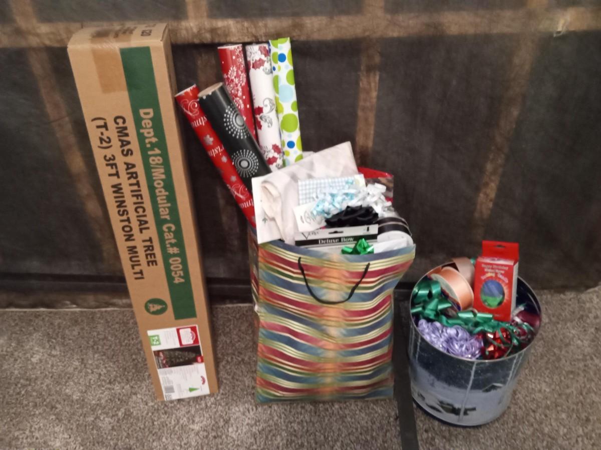 LOT 154  NEW 3' TREE, GIFT WRAP, BOWS AND SERVING DISHES