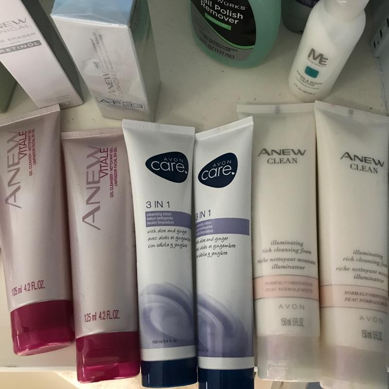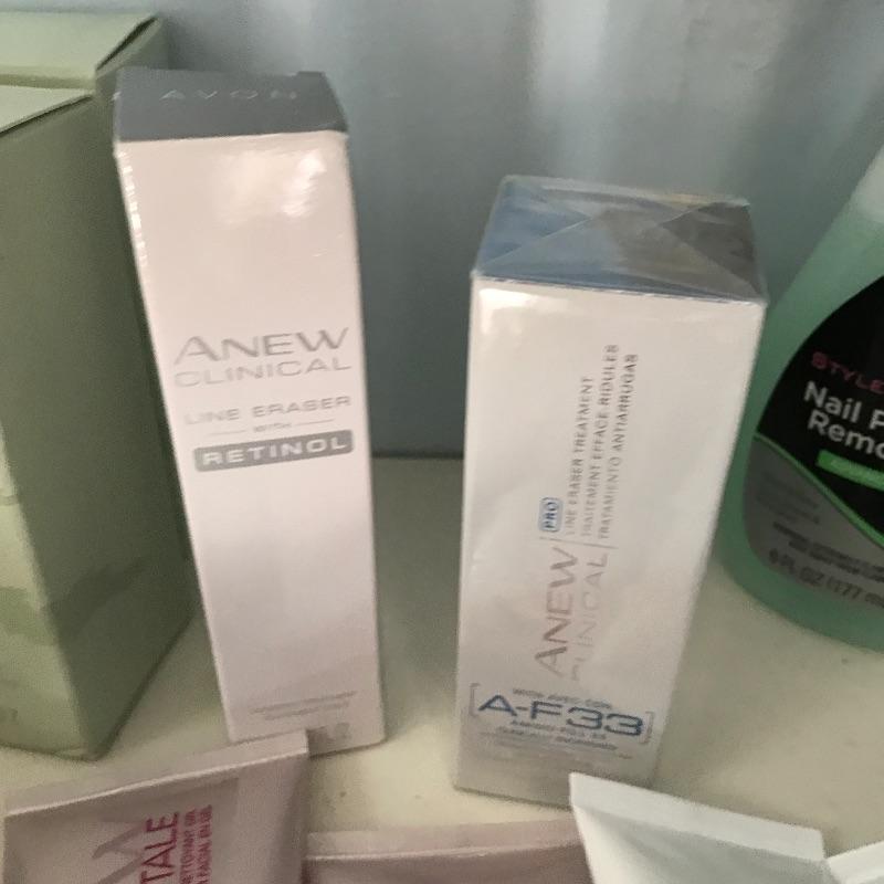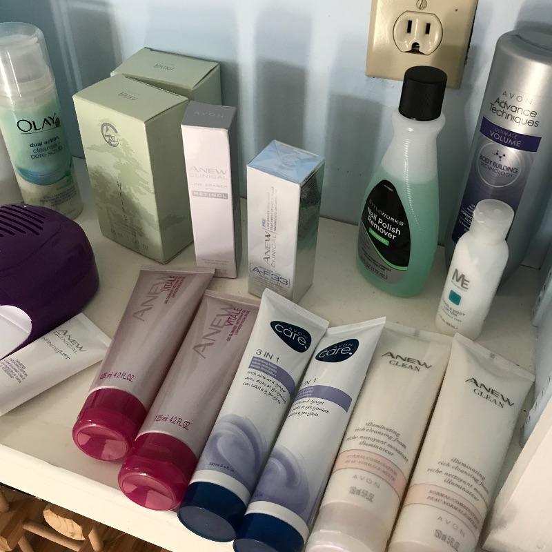 Tons of new Avon products to beauty yourself. Skin cleansers, wrinkle reducers, make up wipes, Haiku Perfume (2 bottles), finger nail dryer and make up. There are also some misc like new other branded products for your face and hair. See photos. Shipping available. These products look brand new but we have no way to verify.