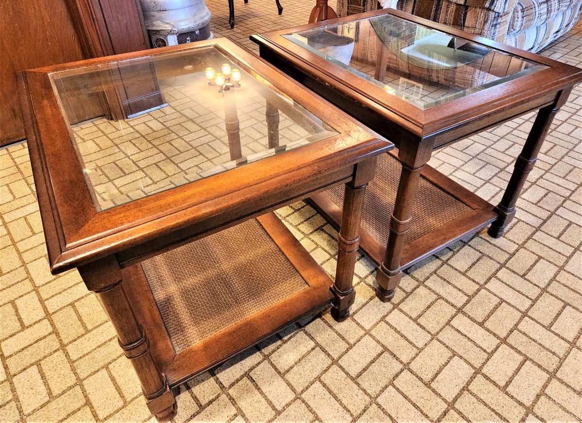 Faux cane on the bottom, lift out beveled glass tops for easy cleaning. Each measures 27" x 21", 21" tall. Good vintage condition.
