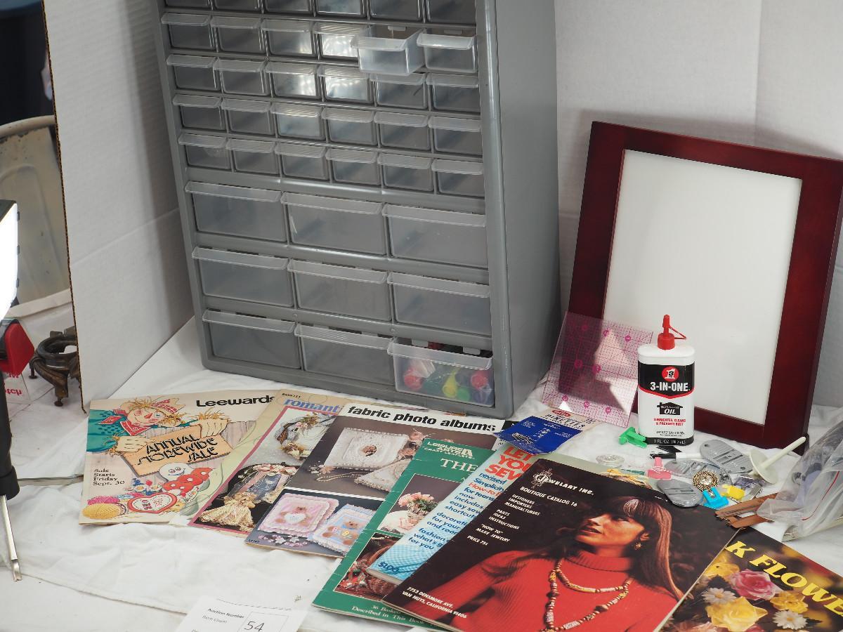 Lot 154- Plastic storage bin, sewing machine foot plates, and supplies: Vintage magazine, fabric markers, Vintage pattern, leisure arts booklets. You put the iron shoe plates on your iron for better pressing and to keep your iron clean when working with adhesives.