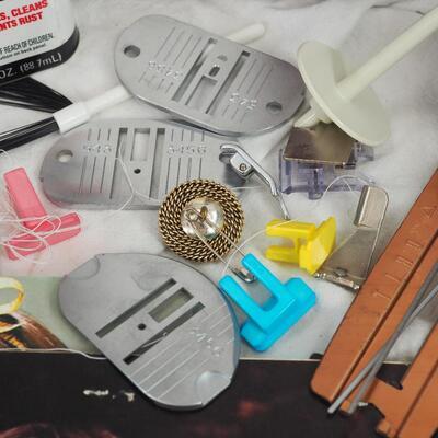 Lot 154- Plastic storage bin, sewing machine foot plates, and supplies: