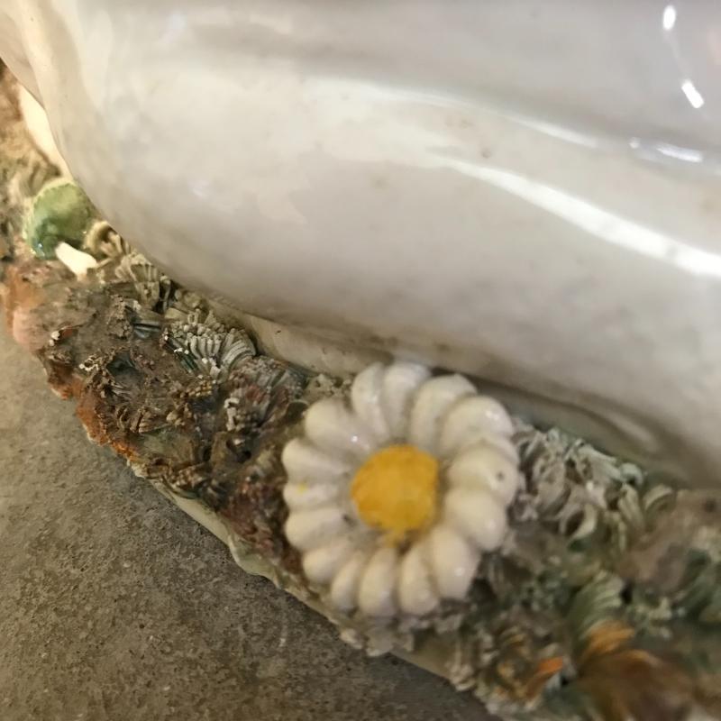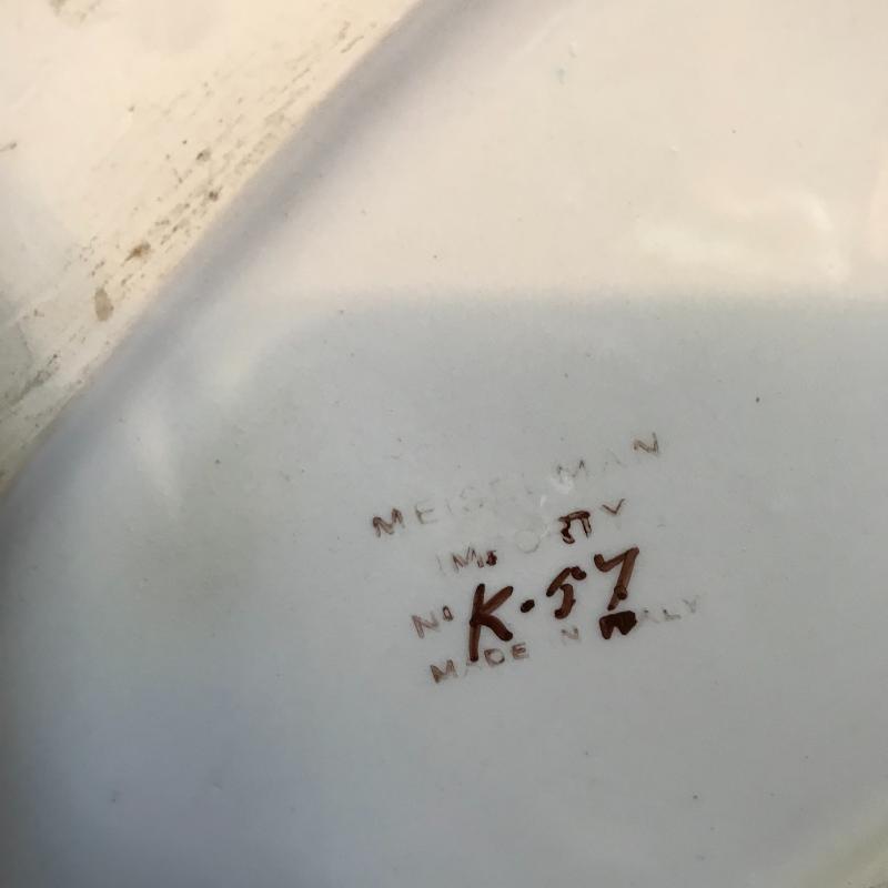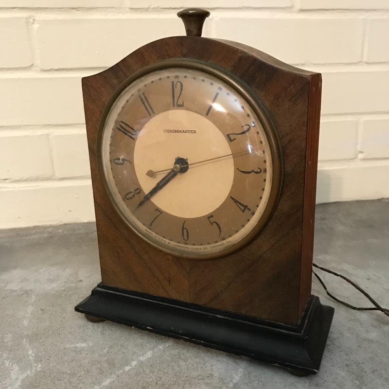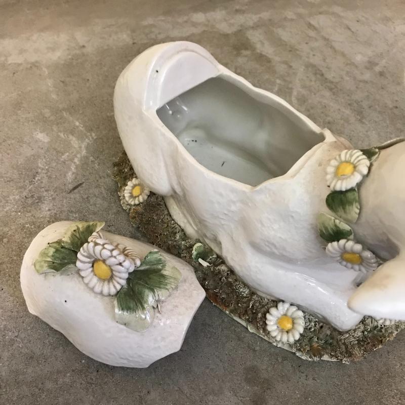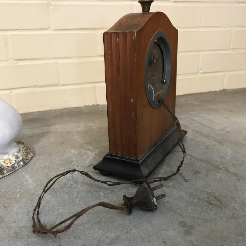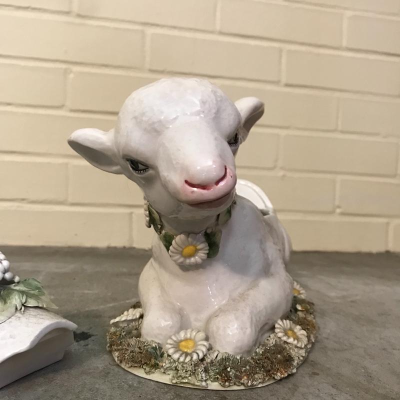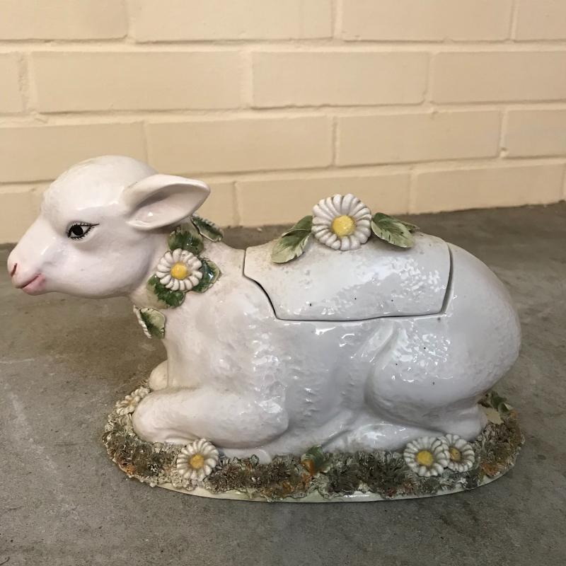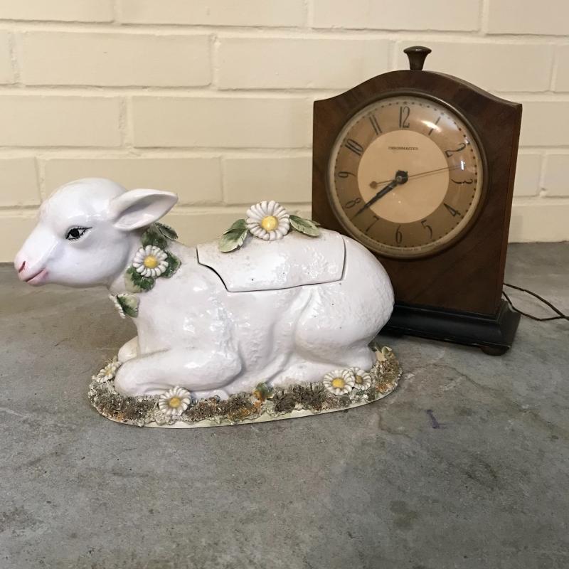 This handsome wood with golden-faced Chronmaster clock by Hammond Clock Co. Is in great condition, and measures approx. 9.25x7.75”. Cord requires attention, see photos. Clock is accompanied by adorable lamb turrime with intricate floral detail and lid. Lamb appears to be stamped and numbered by Meiselman, see photos. Shipping available.